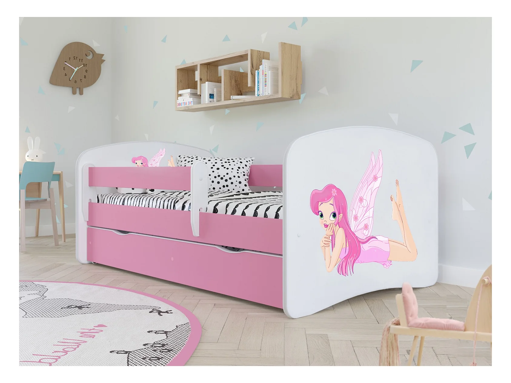 Lit enfant rose petite fée avec sommiers et barrière de sécurité amovible Drimy-80x180-Tiroirs Avec tiroir