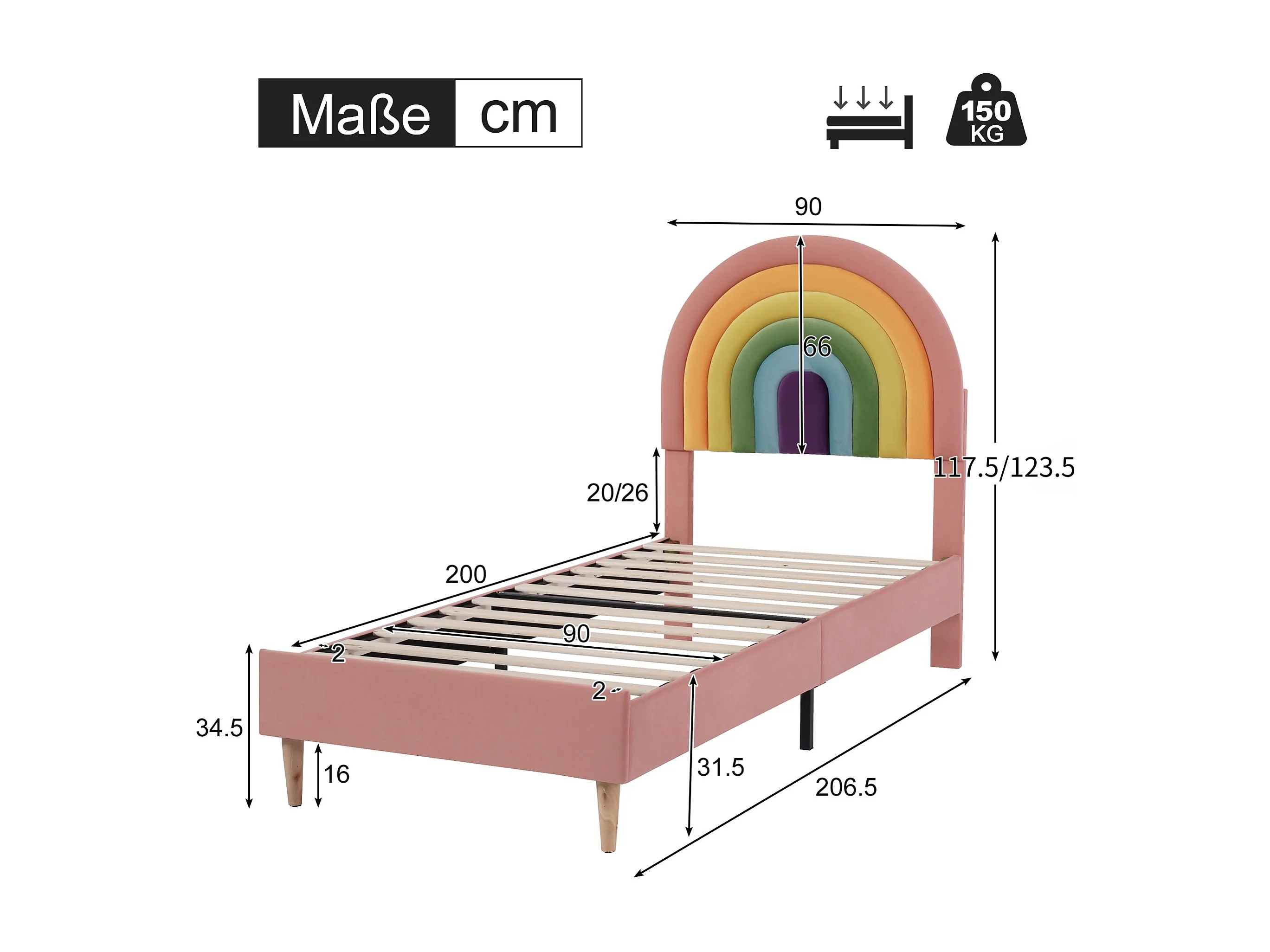 Lit enfant 90x200cm avec sommier - tête de lit réglable en hauteur - bois - velours rose (sans matelas)