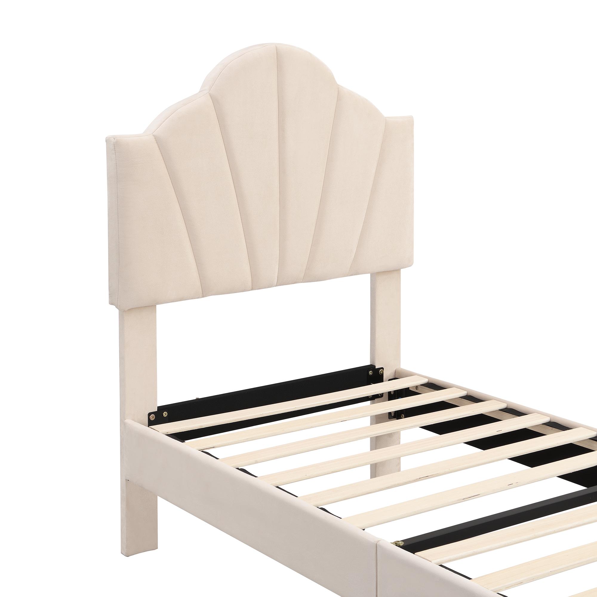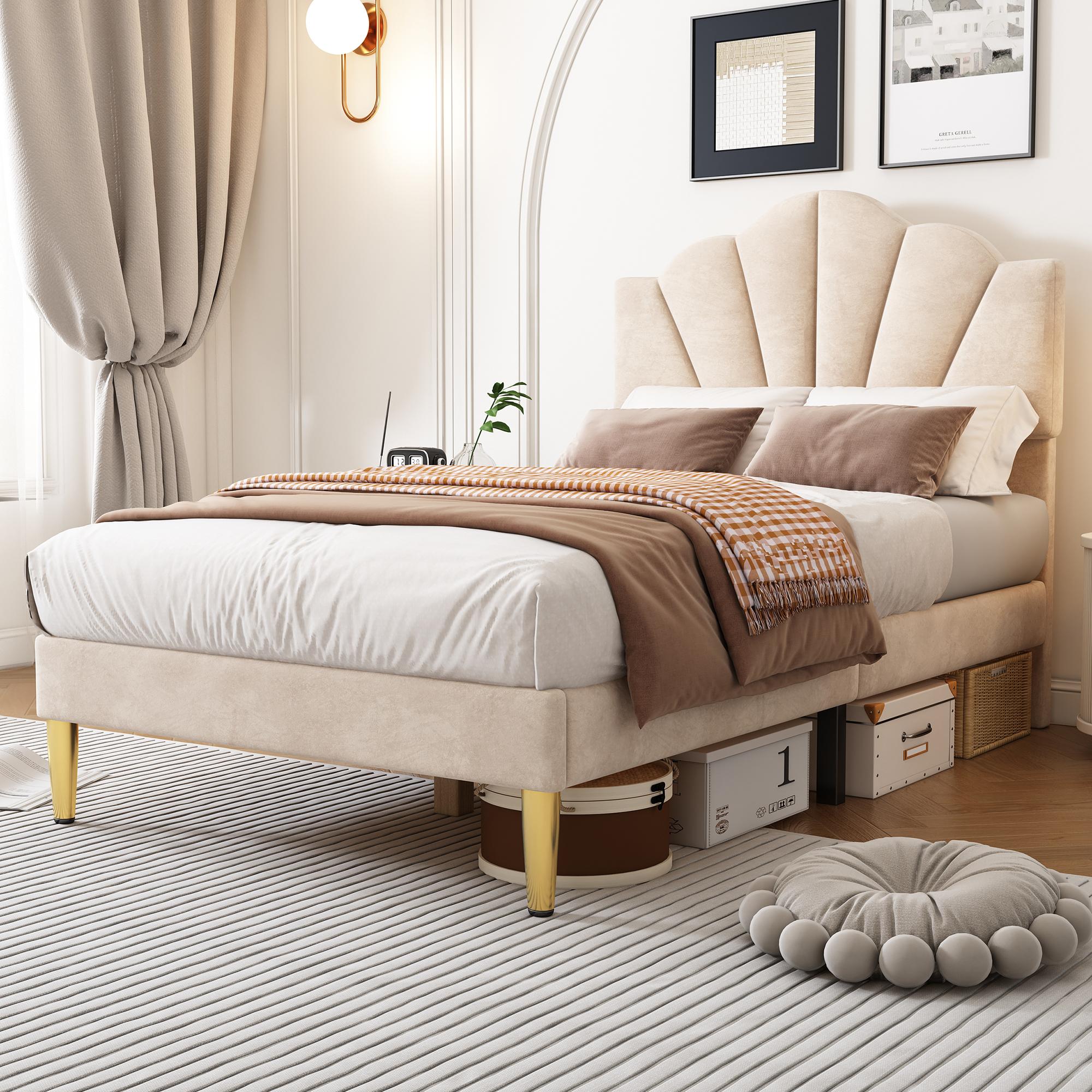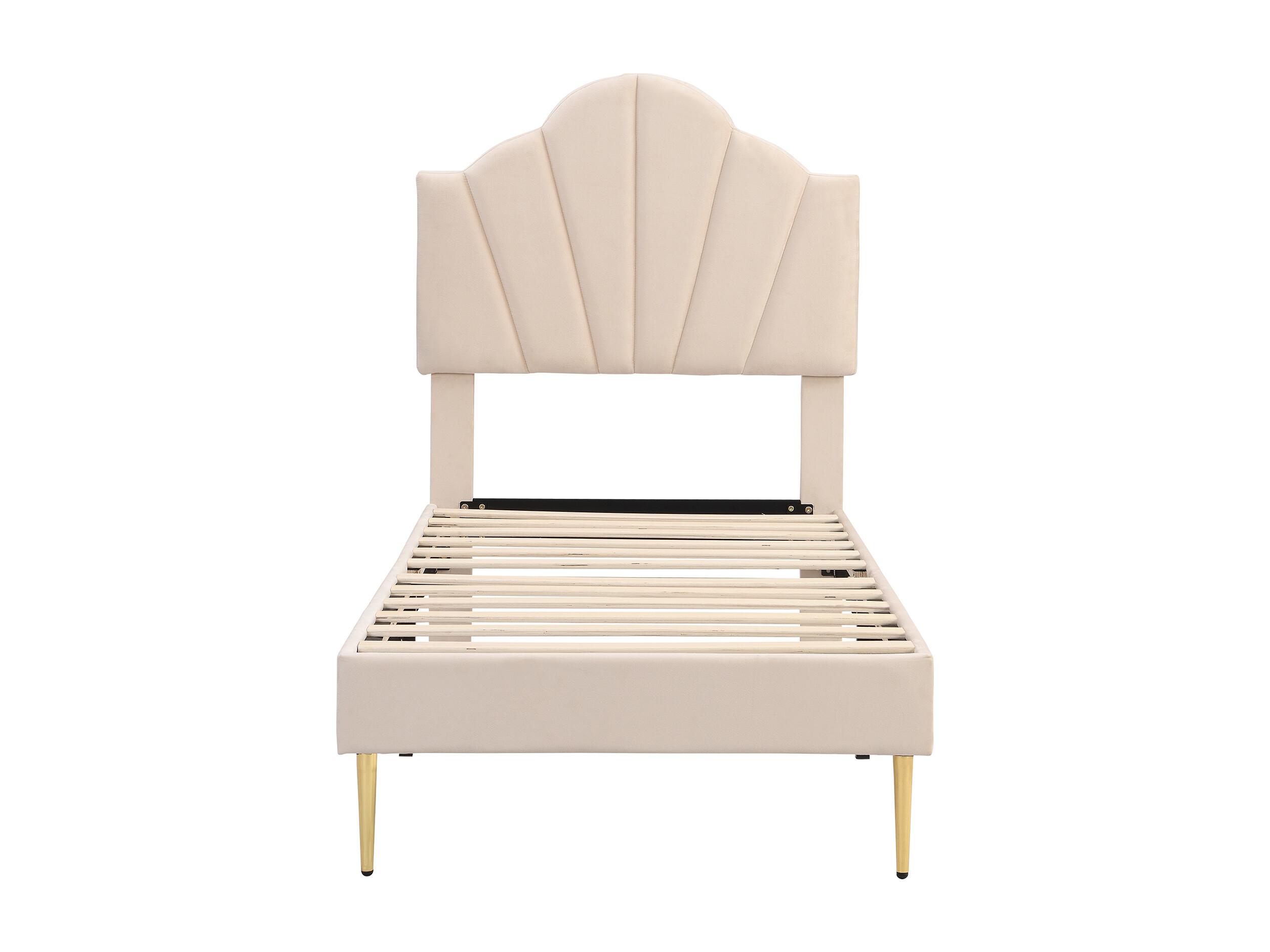 Lit coquillage simple 90x200 cm en velours beige avec pieds en métal doré, tête de lit réglable(sans matelas)