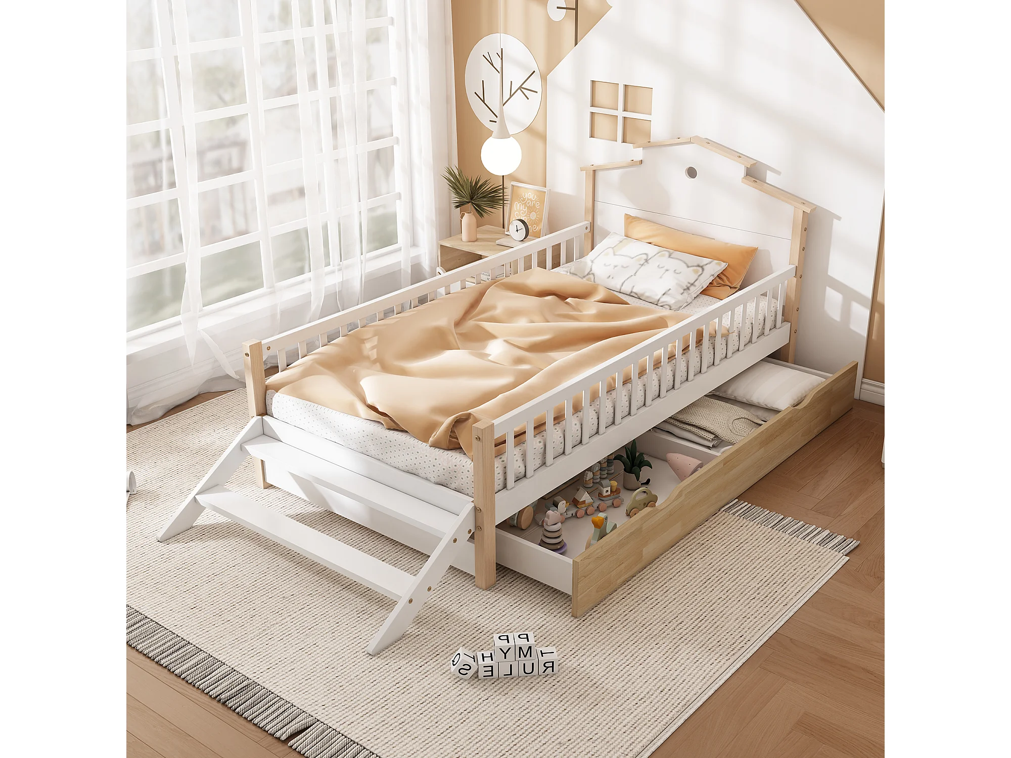 Lit enfant simple 90X200 cm avec tiroir de rangemant, barrière anti-chute, pin + MDF, sans matelas, blanc + naturel