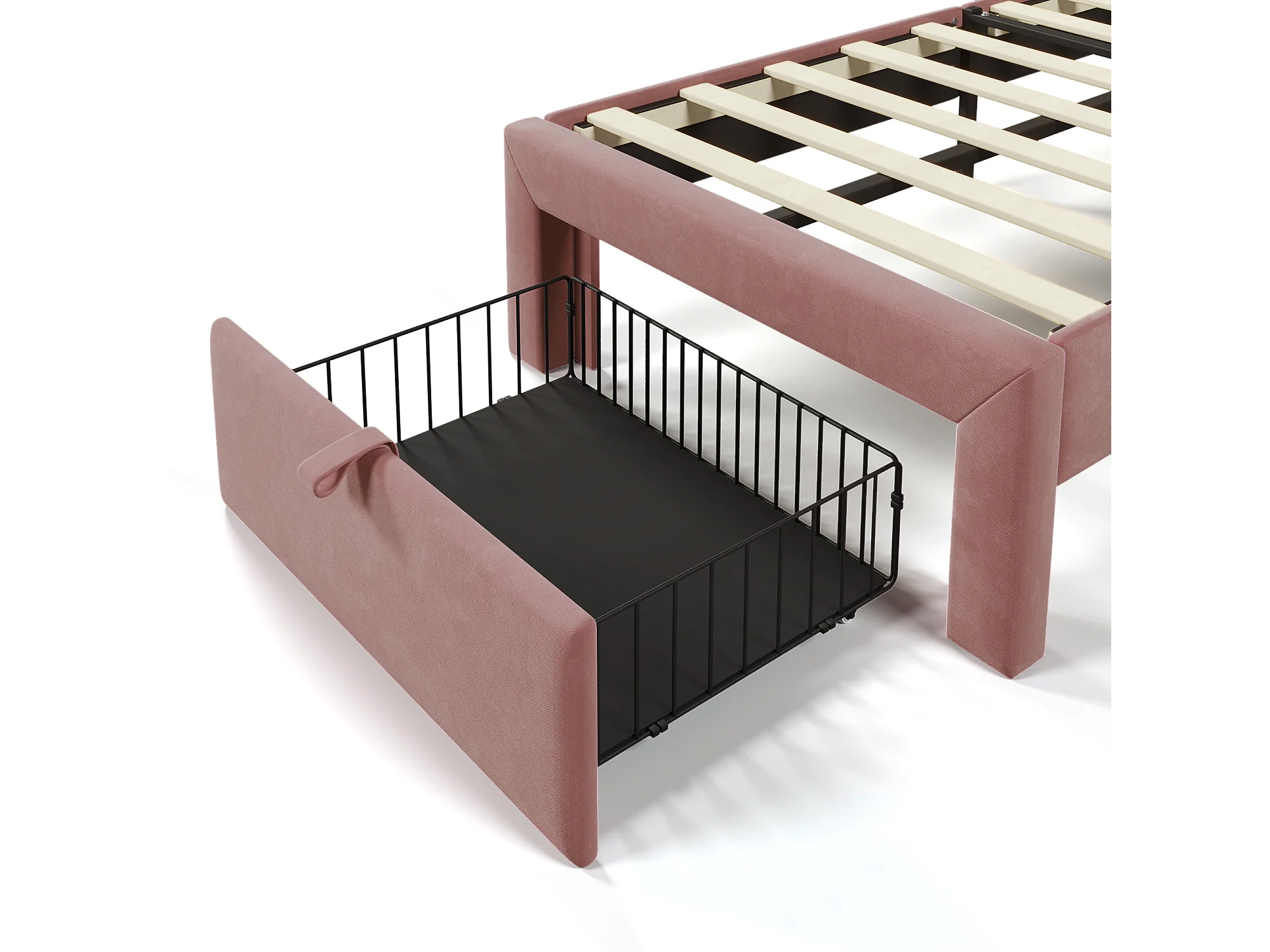 Lit enfant 90x200 cm avec tiroirs et LED, tête de lit réglable, cadre en velours rose(sans matelas)