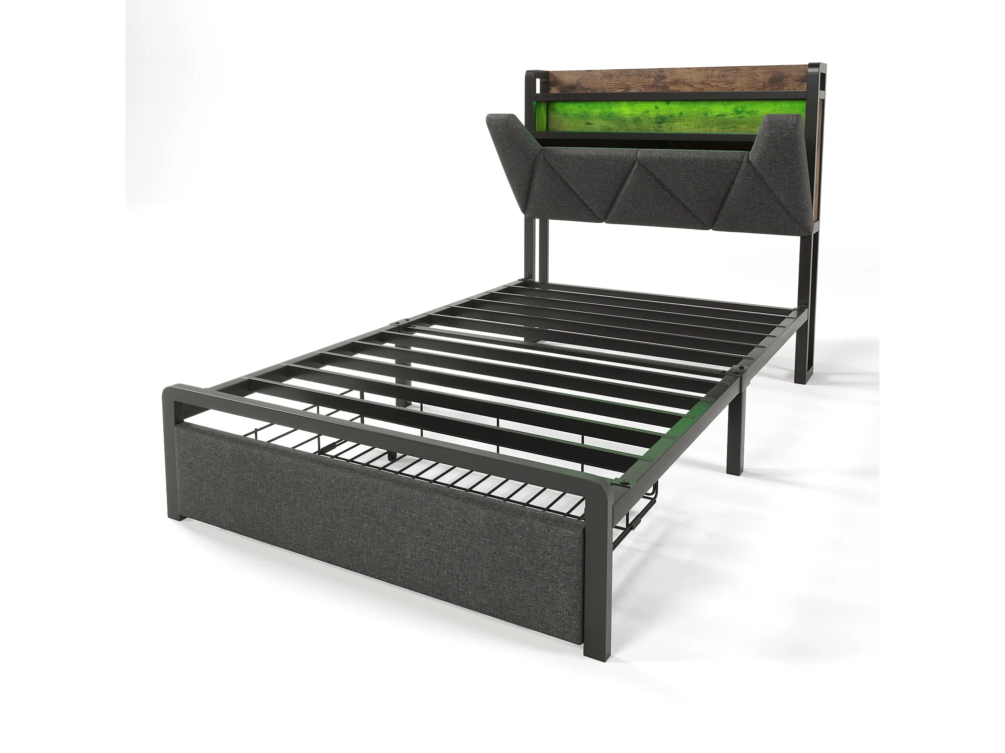 Lit 90x200 avec tête de lit avec rangement, avec ports USB et USB C, avec LED et tiroir, en lin, gris (Sans matelas)