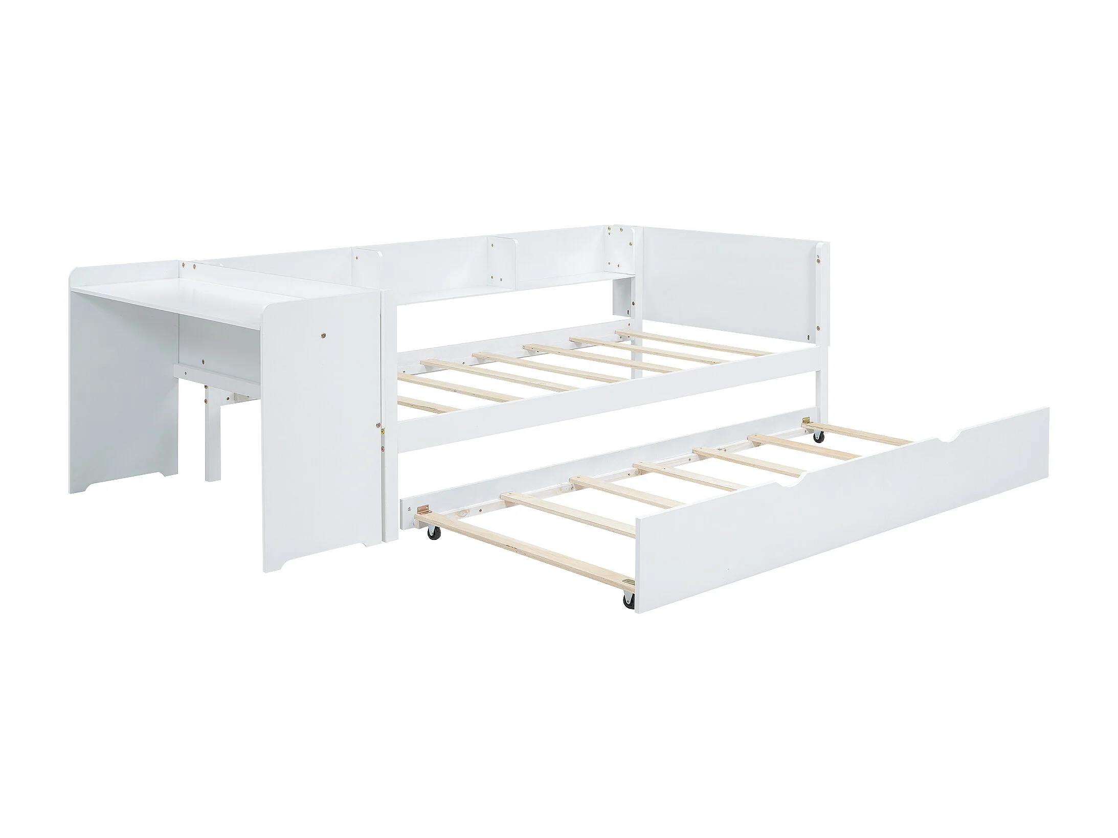 Lit enfant simple 90x200cm avec lit gigogne 90x180cm, avec bureau, 3 compartiments de rangement à côté du lit, sans matelas, blanc