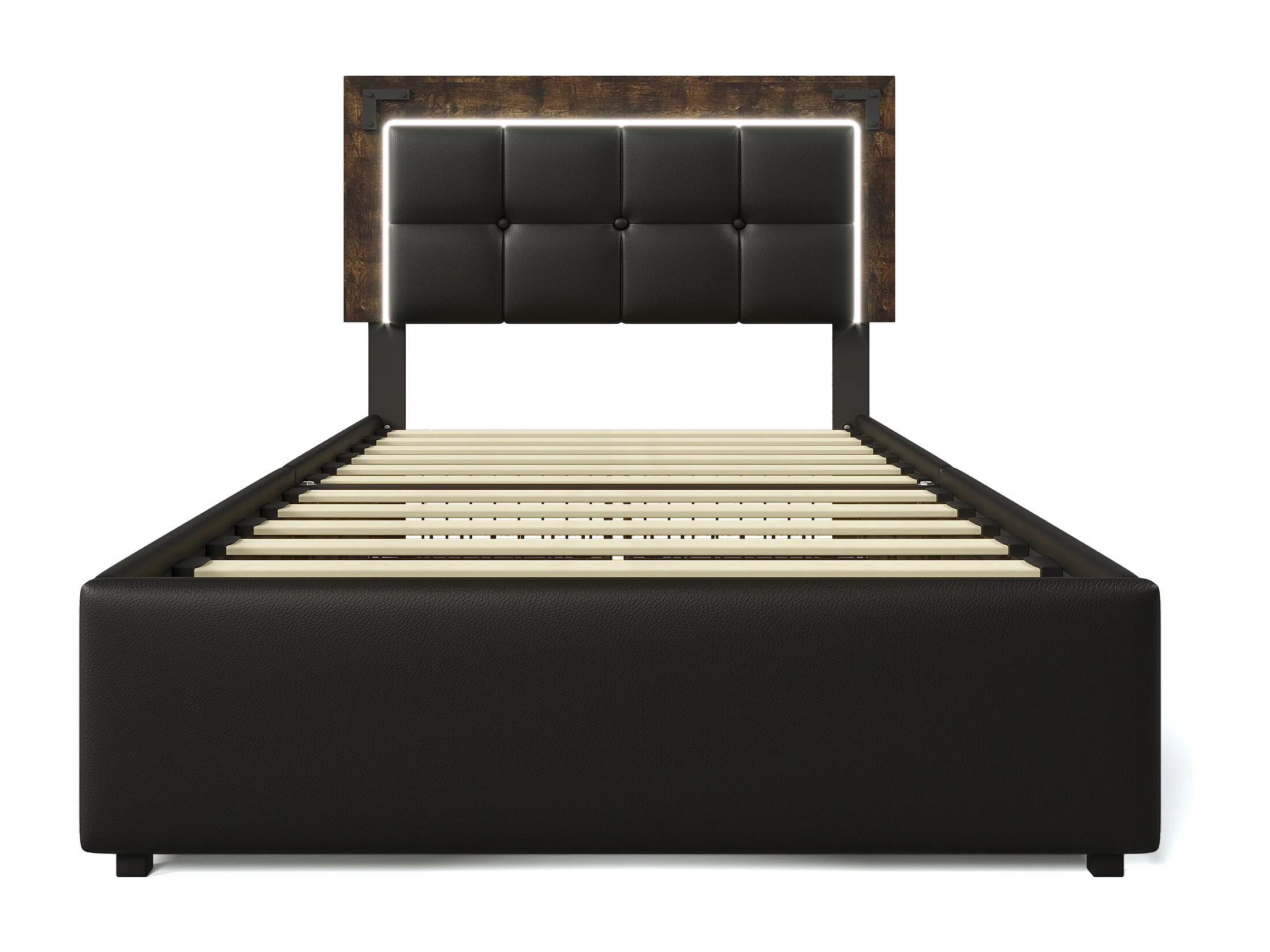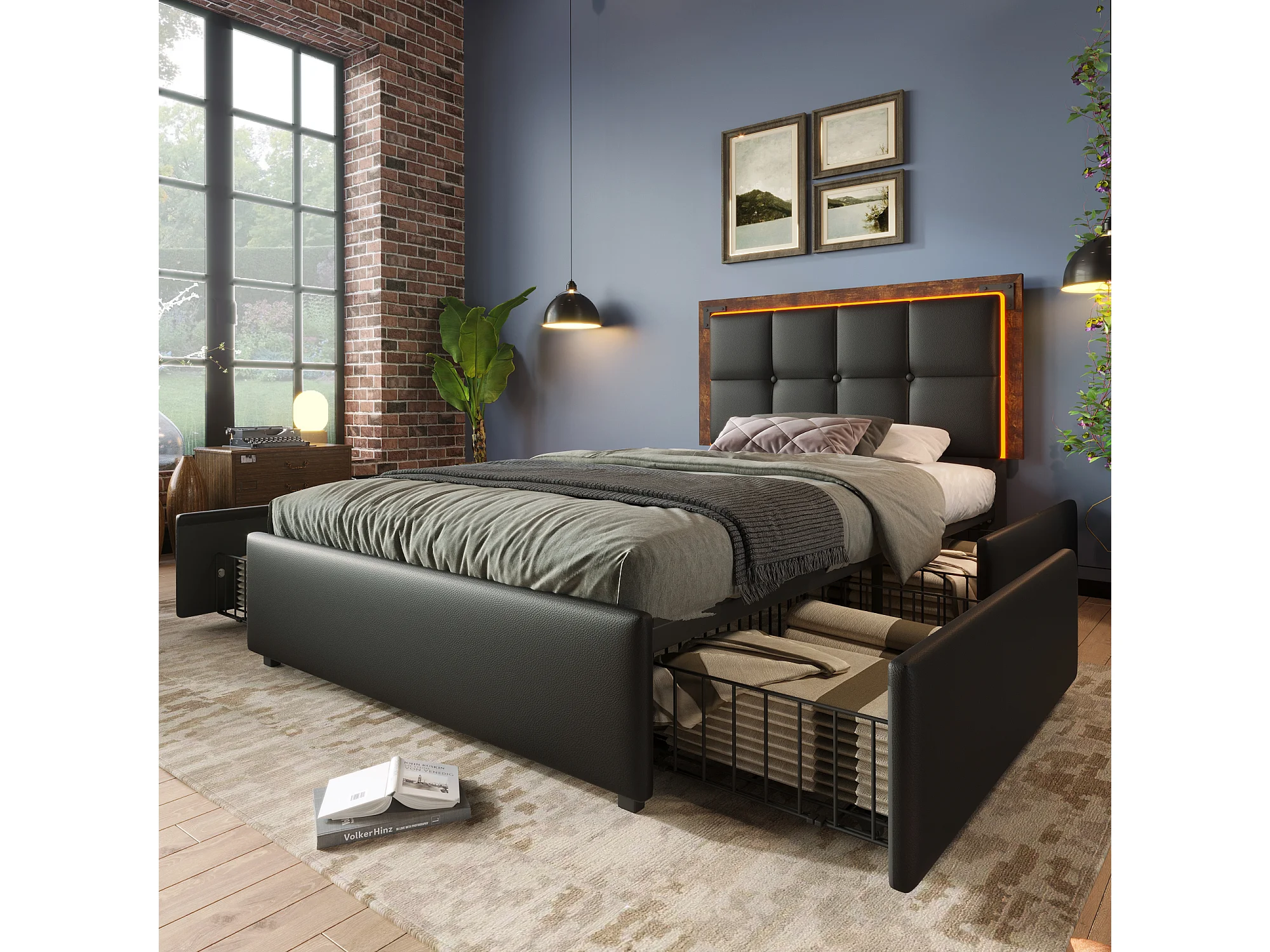 Lit 90x200 avec LED, 4 tiroirs, tête de lit réglable, en PU noir (Sans matelas)