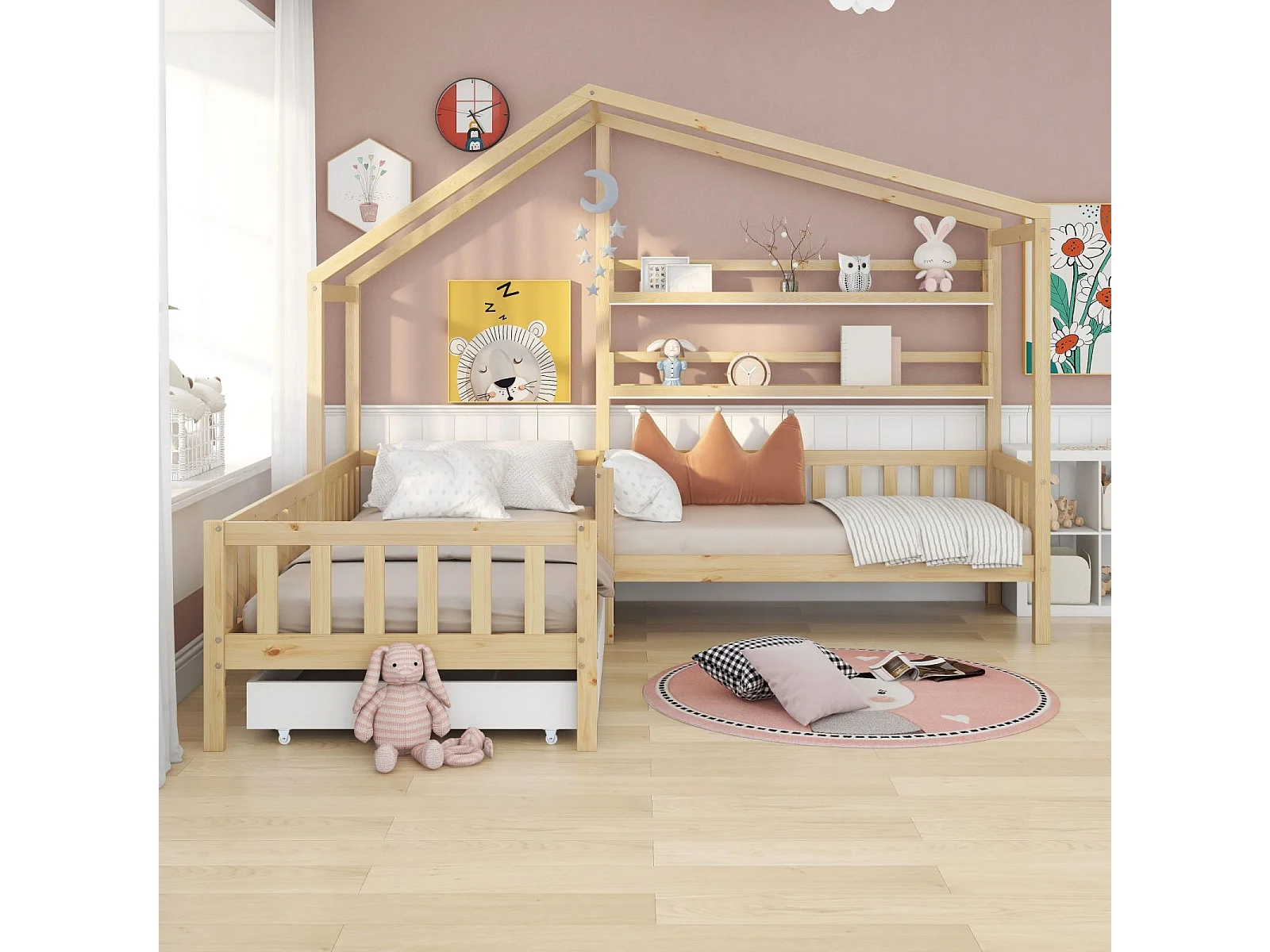 Lit enfant style maison avec tiroirs et étagères, en bois massif avec barrière et sommier à lattes, cadre en L, couleur naturelle (90x200 cm + 140x70 cm)