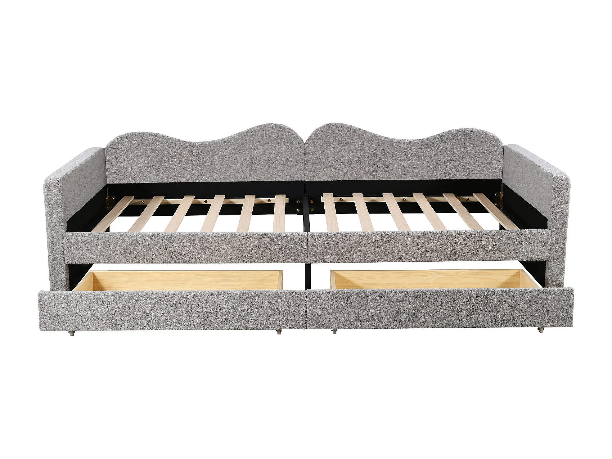 Lit enfant tapissé multifonction avec 2 tiroirs, tissu teddy gris, cadre avec dossier et accoudoirs, 215x95x66cm