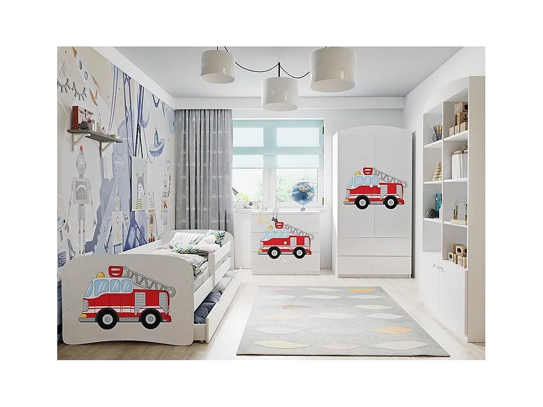 Lit enfant camion de pompier avec sommiers et barrière de sécurité amovible Drimy-Matelas mousse-80x180-Tiroirs Avec tiroir