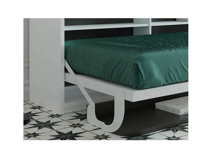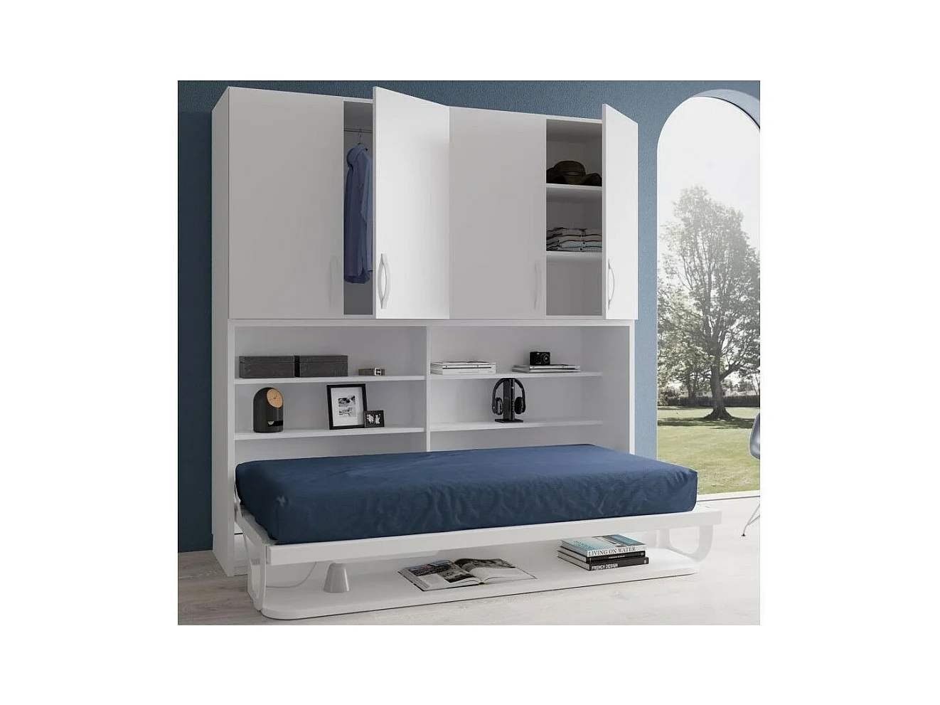 Lit escamotable horizontal blanc Bounto 85x185 avec rangement et bibliothèque composition D-