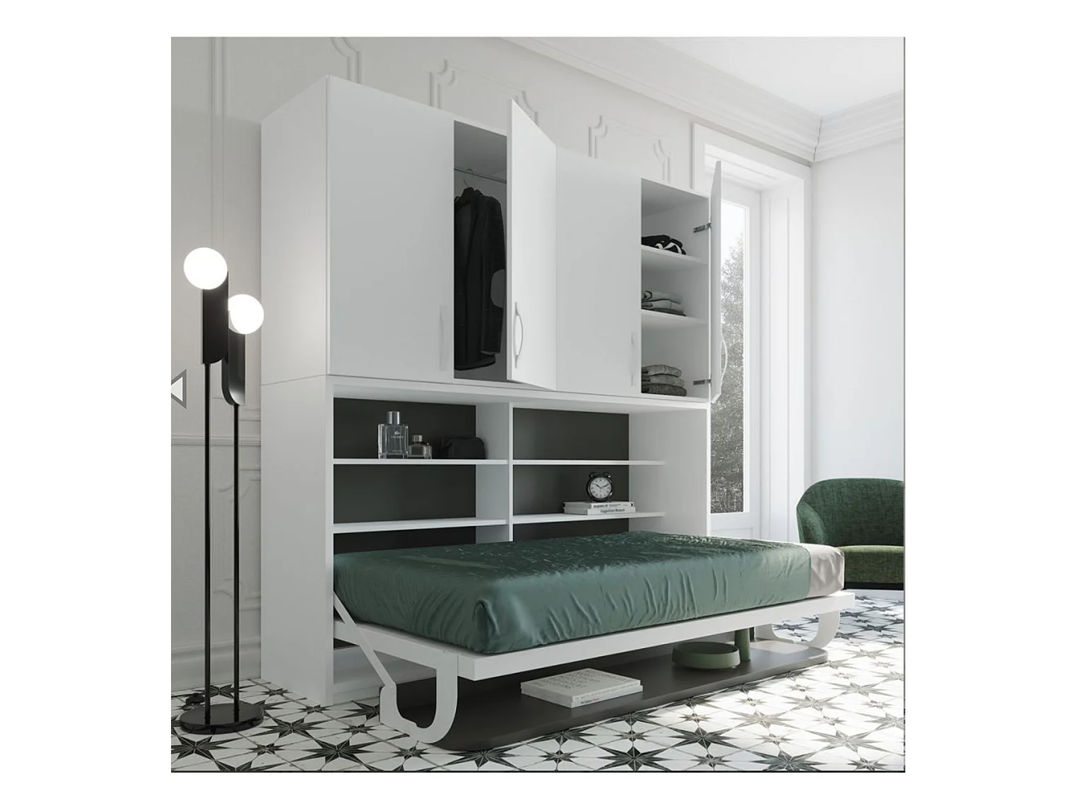 Lit escamotable horizontal blanc Bounto 85x185 avec rangement et bibliothèque composition C-1 matelas 85x185