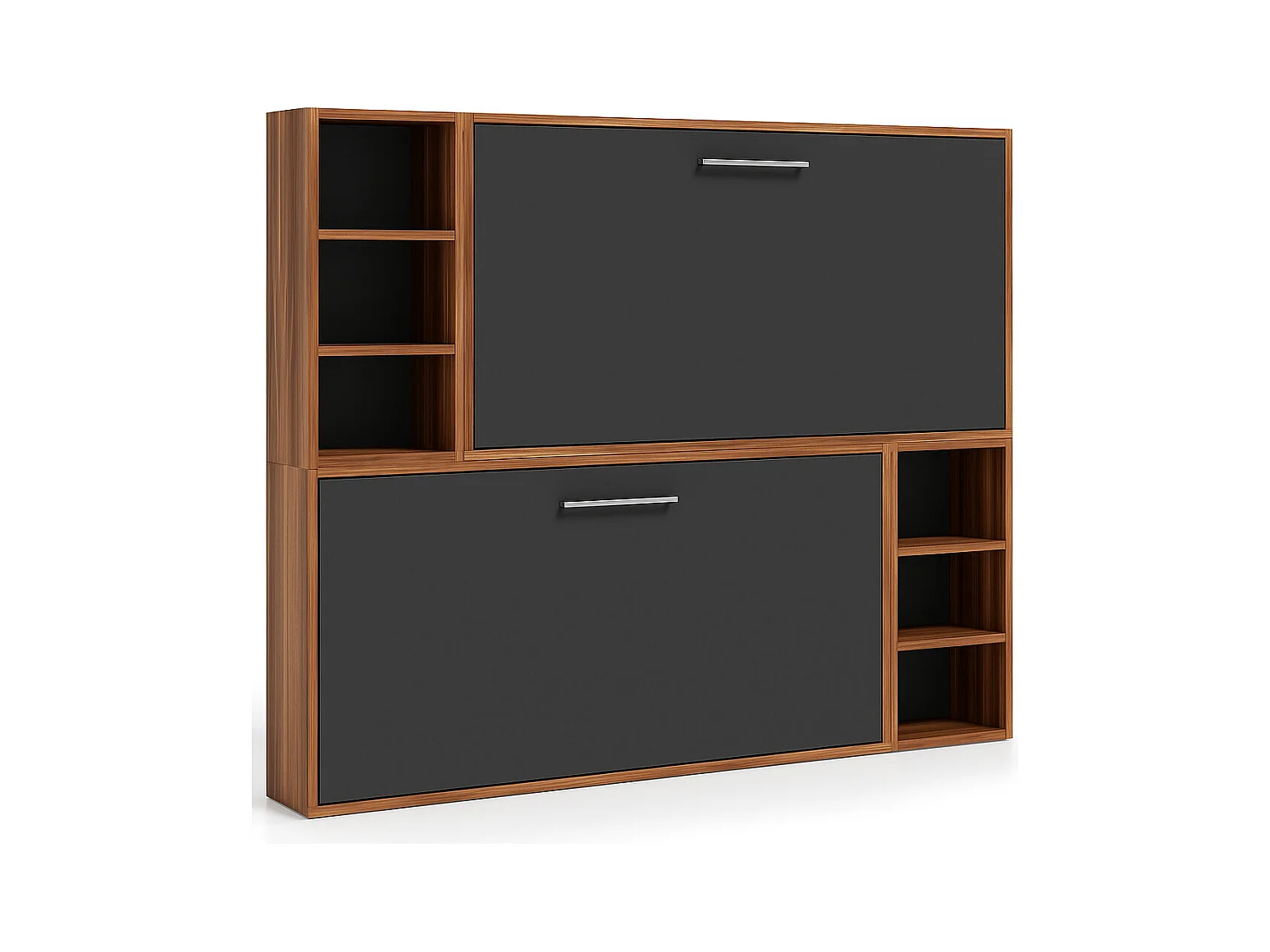 Lit escamotable superposé horizontal avec étagères BINKA-2 matelas-80x200-Cadre Noyer-Façade Anthracite