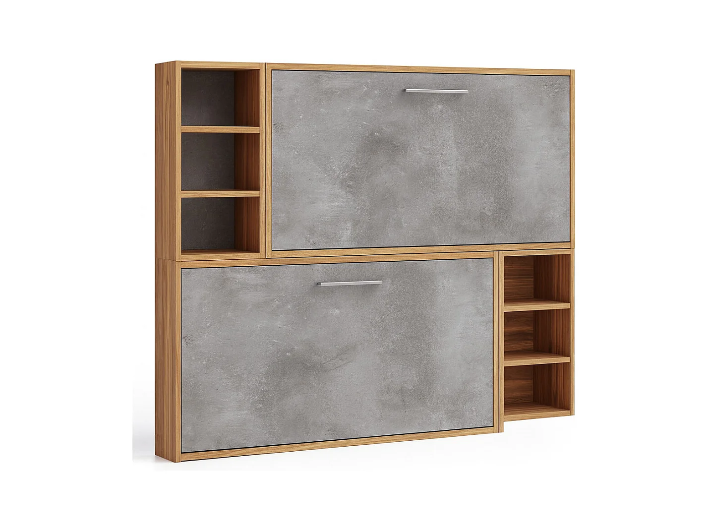 Lit escamotable superposé horizontal avec étagères BINKA-2 matelas-80x200-Cadre Chêne clair-Façade Gris ciment
