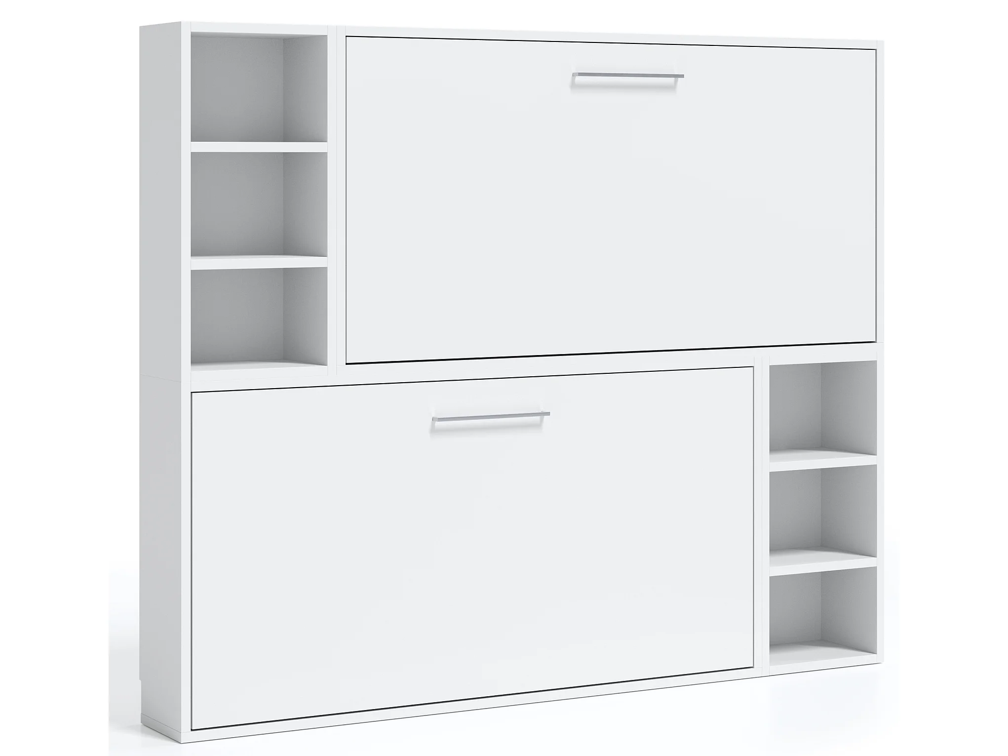 Lit escamotable superposé horizontal avec étagères BINKA-2 matelas-90x180-Cadre Chêne blanc-Façade Chêne brun