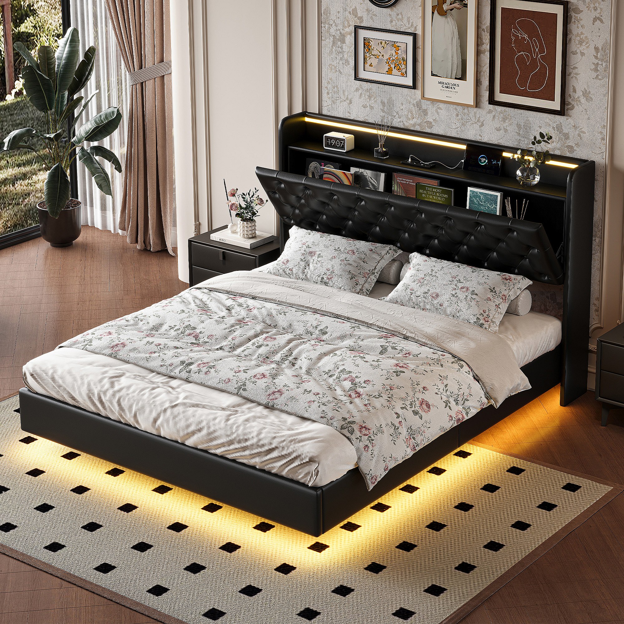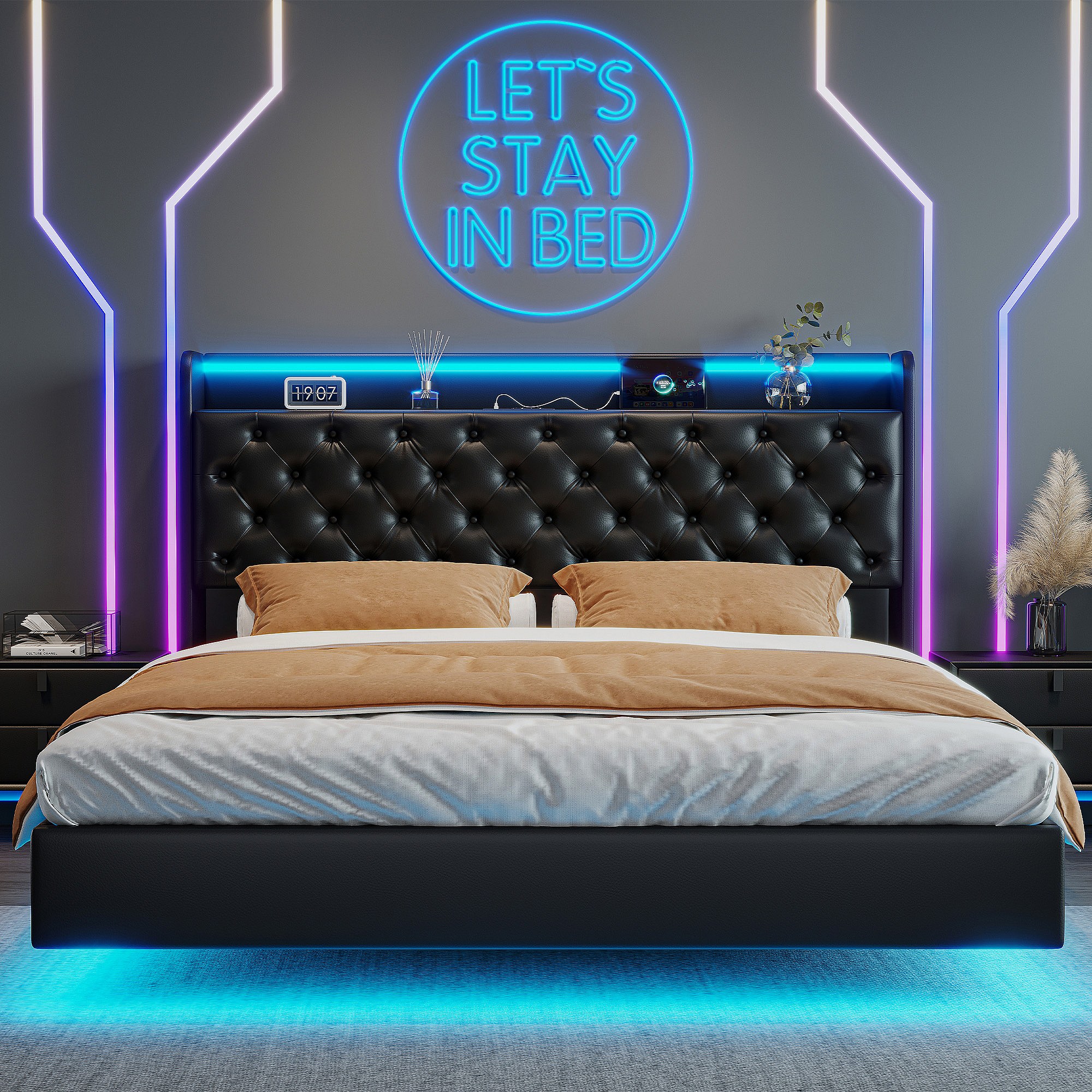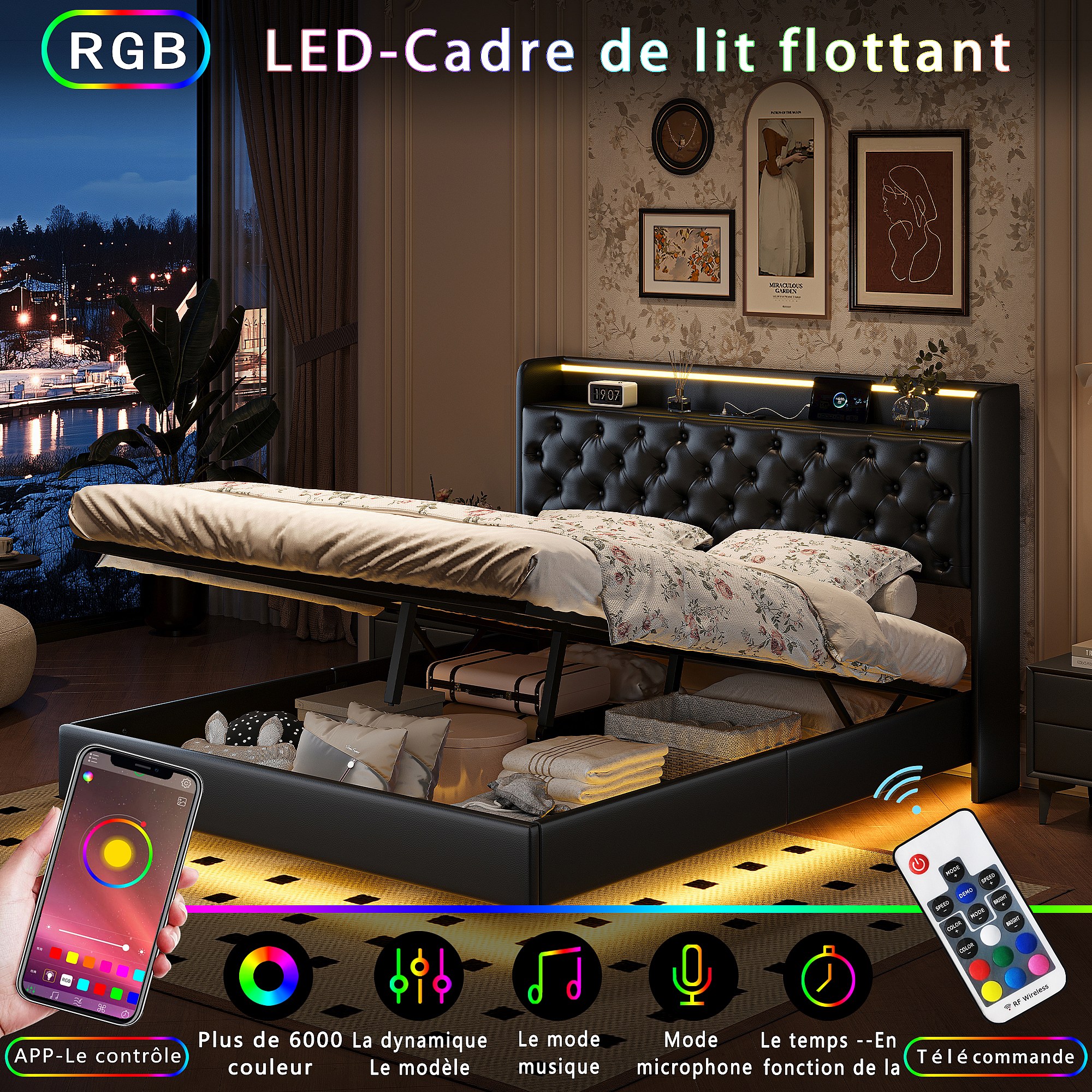 Lit flottant 160x200cm en PU avec LED tête & corps, rangement tête de lit rembourrée & prise EU – Design moderne et pratique