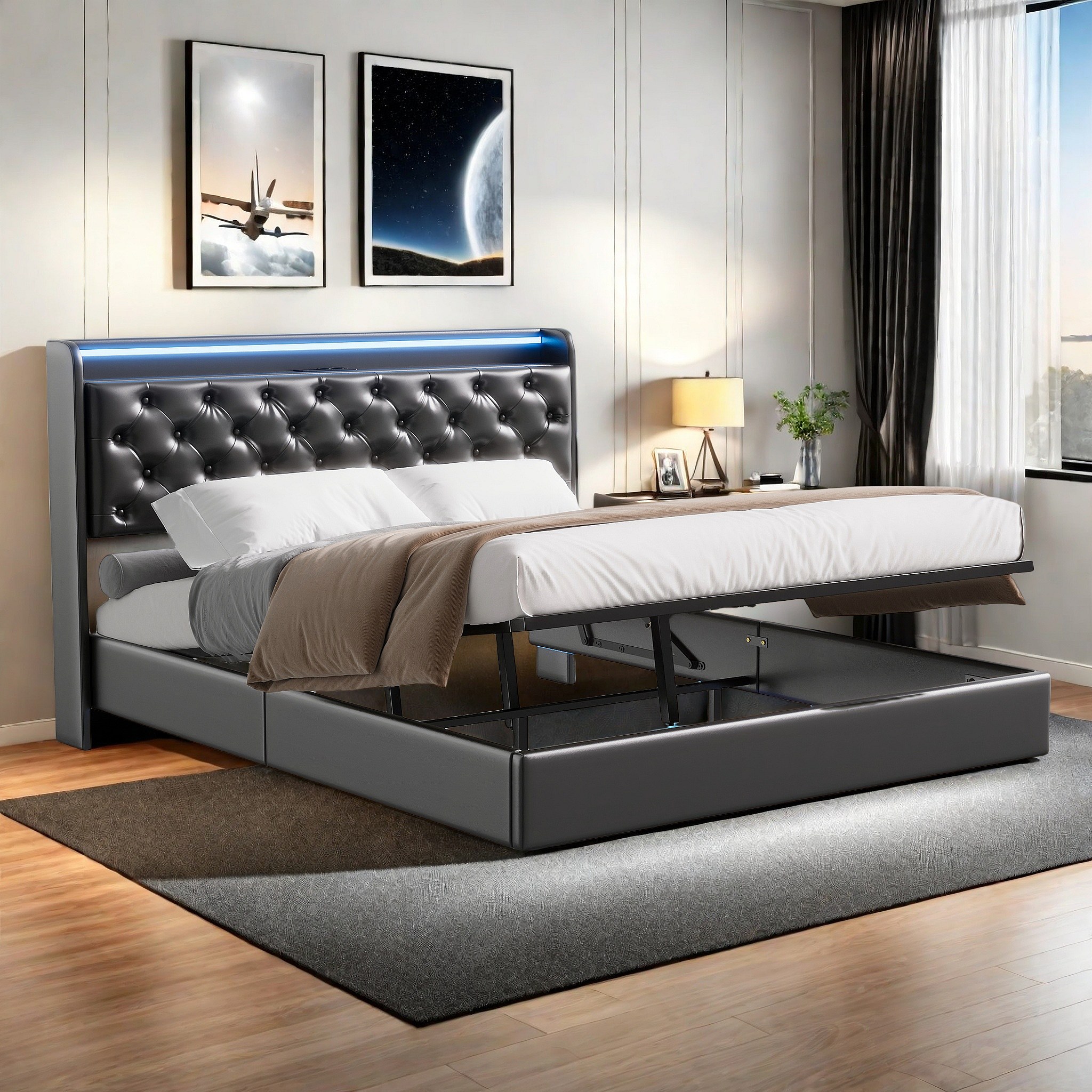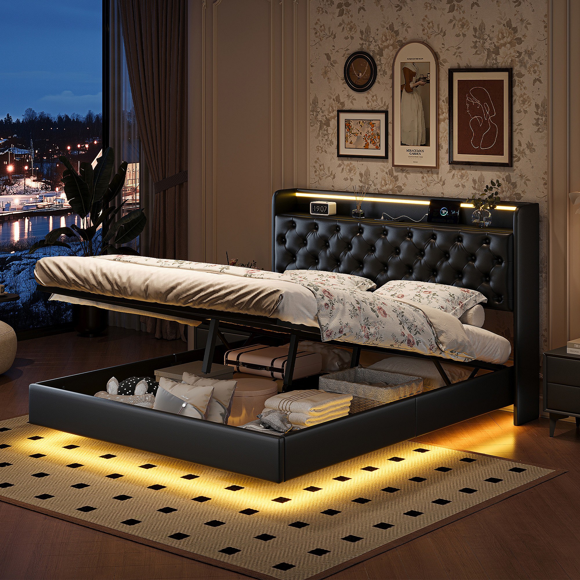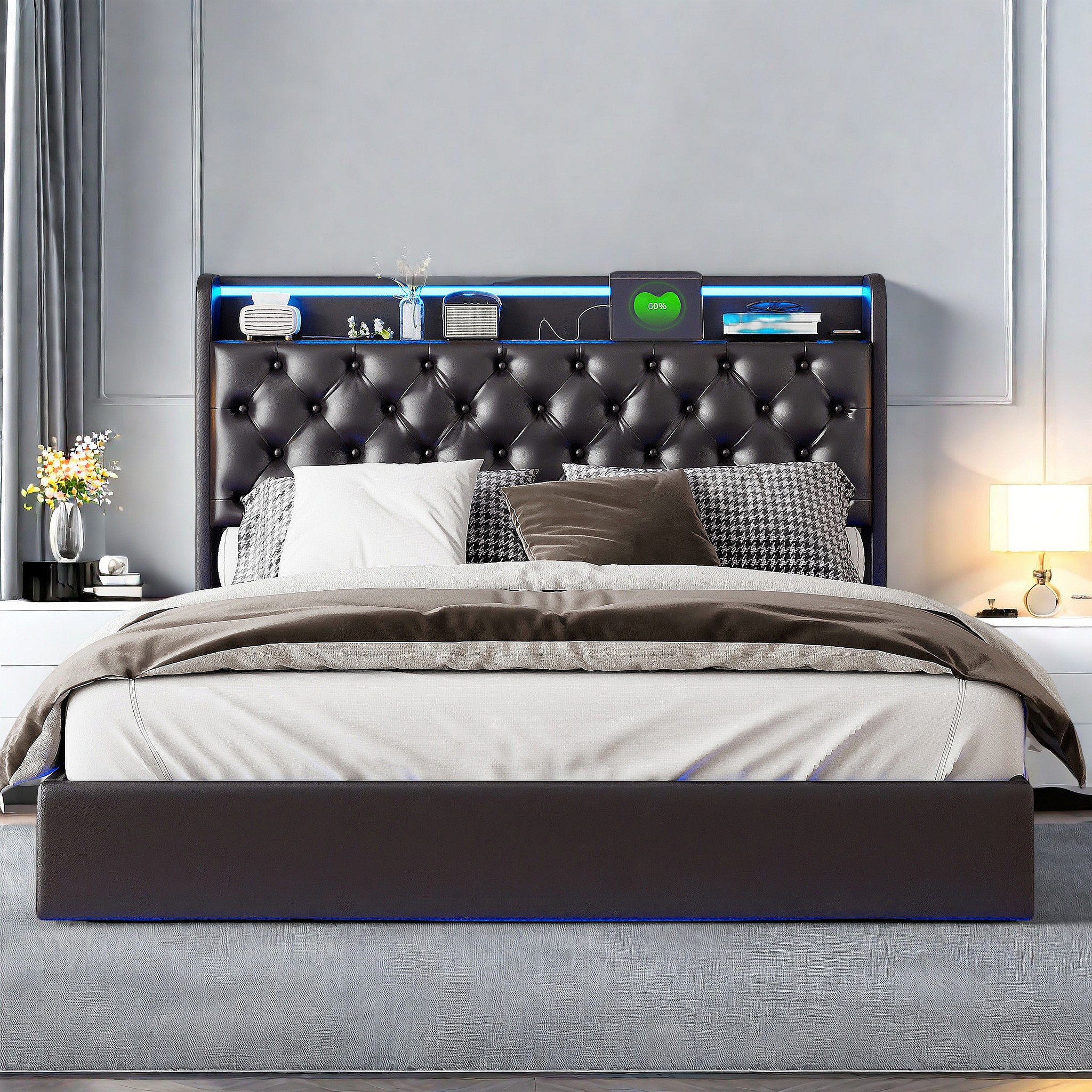Lit flottant 160x200cm en PU avec LED tête & corps, rangement tête de lit rembourrée & prise EU – Design moderne et pratique