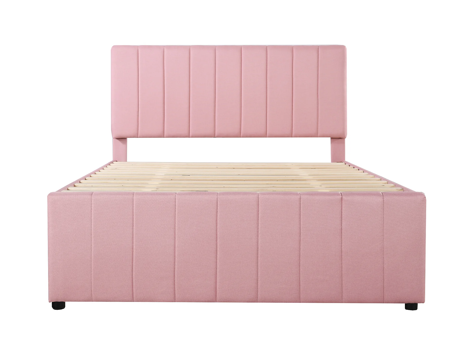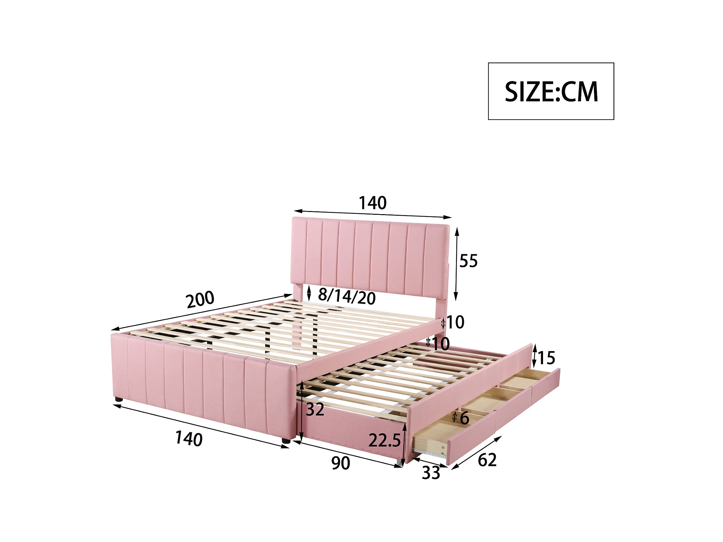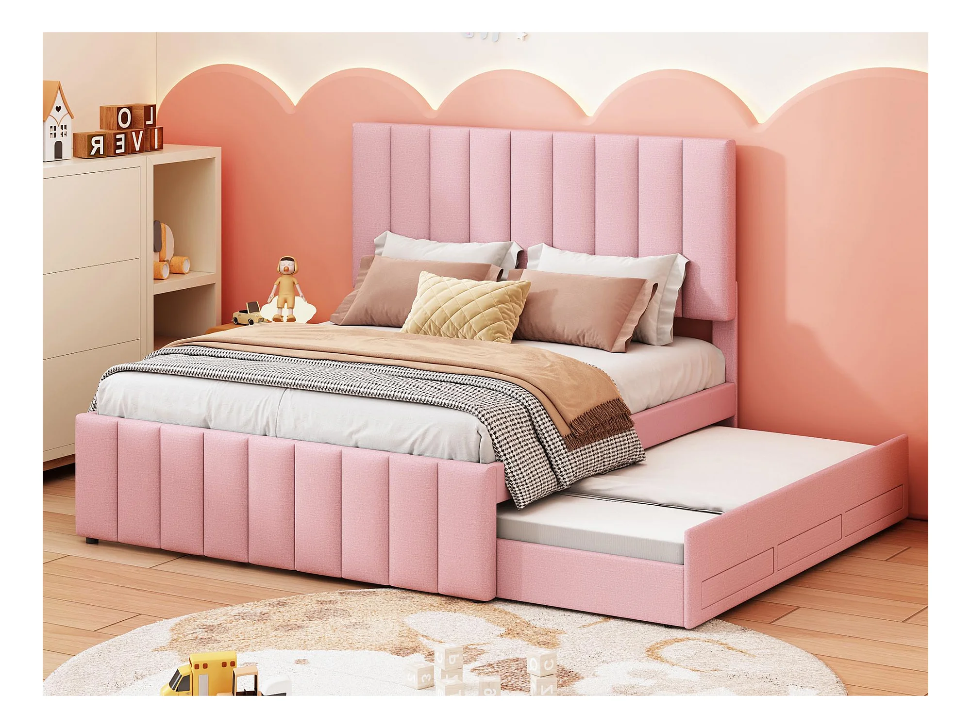 Lit gigogne 140 x 200 cm + 90 x 190 cm - 3 tiroirs - tissu lin - sommier à lattes - rose