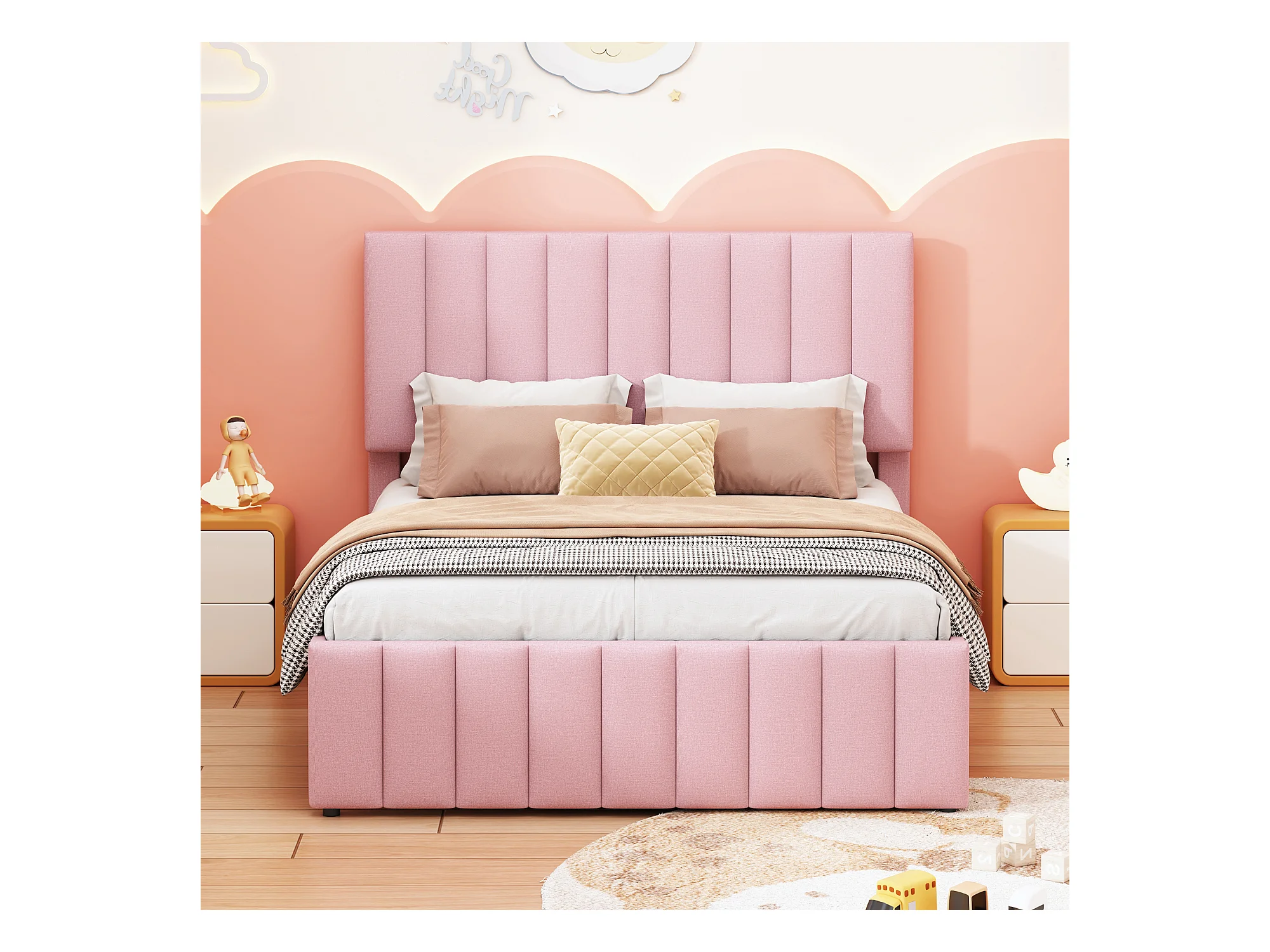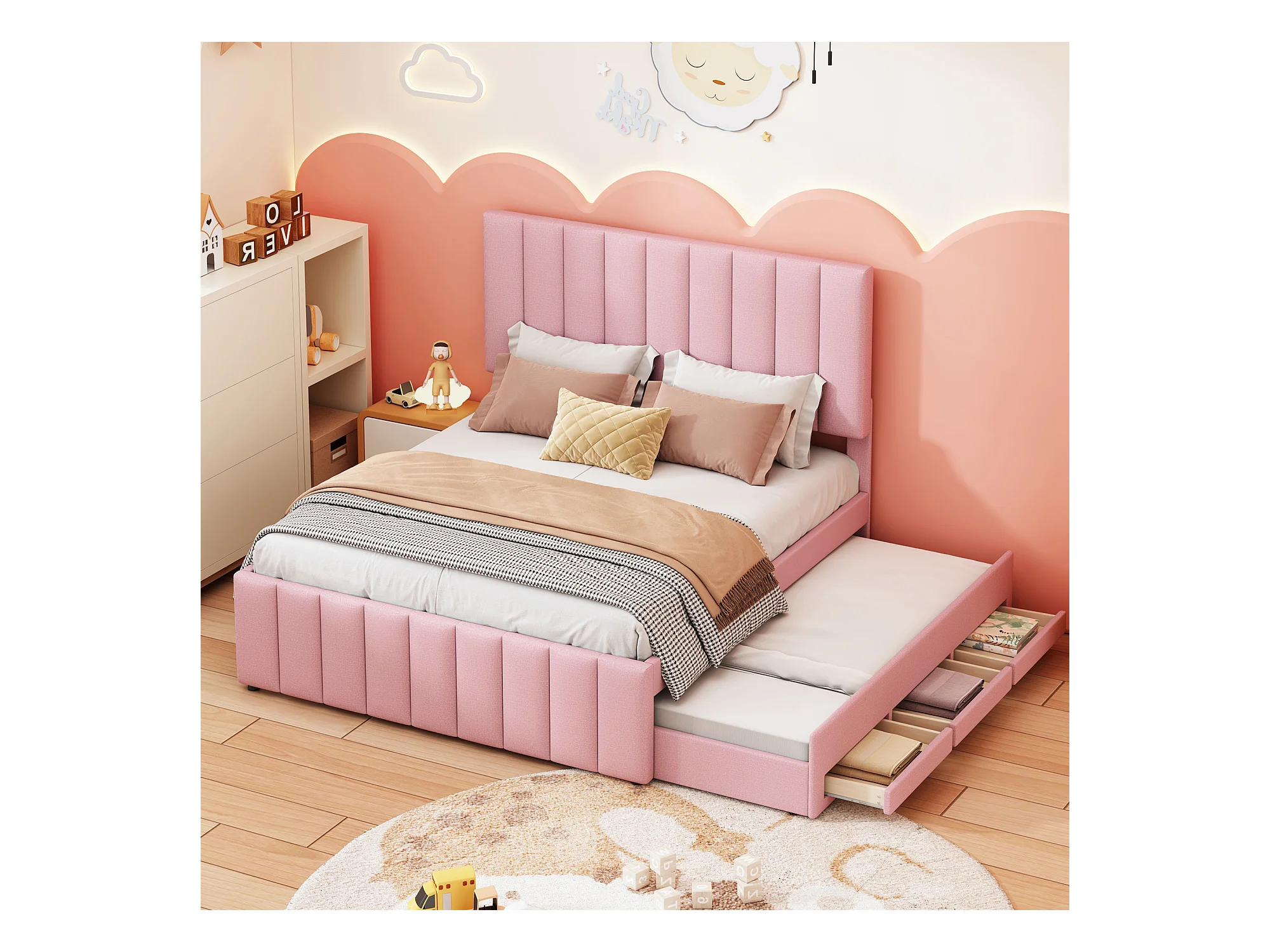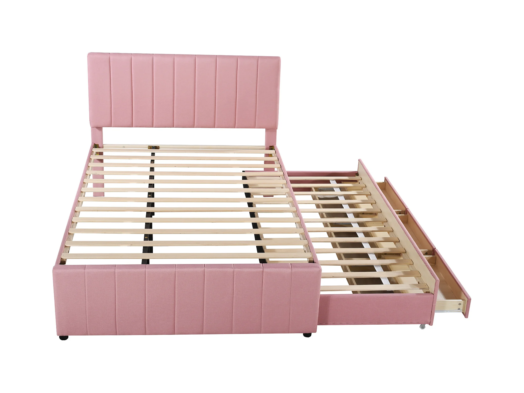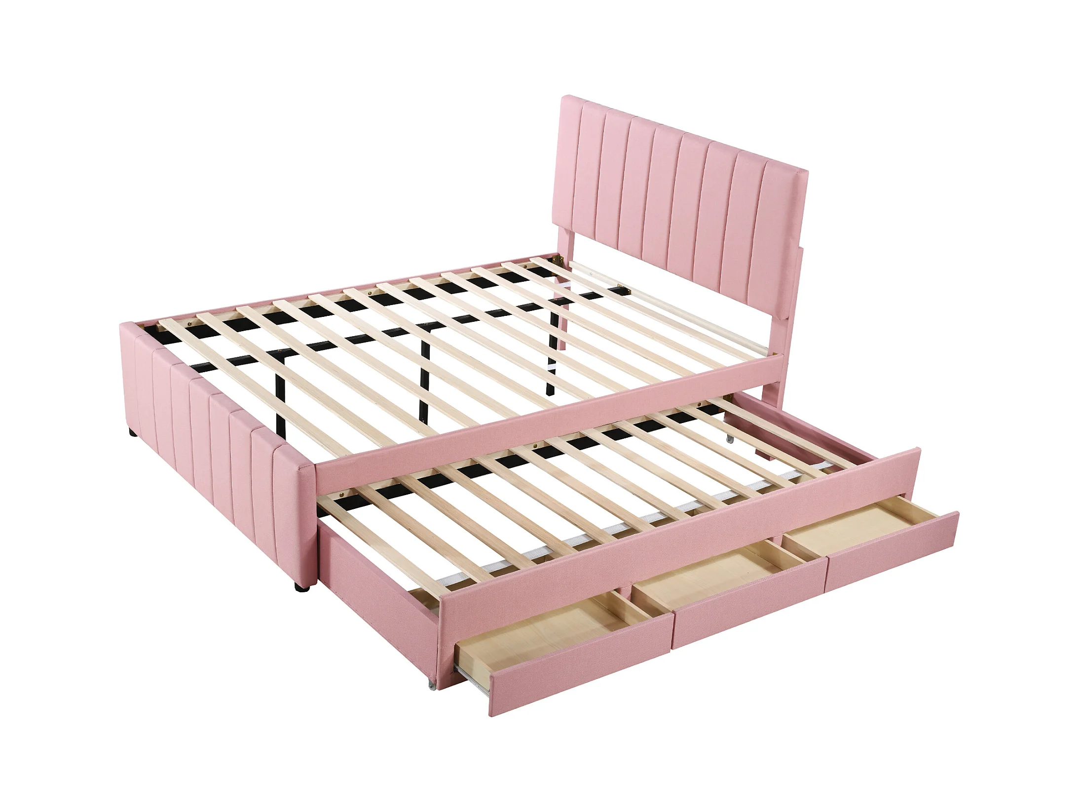 Lit gigogne 140 x 200 cm + 90 x 190 cm - 3 tiroirs - tissu lin - sommier à lattes - rose