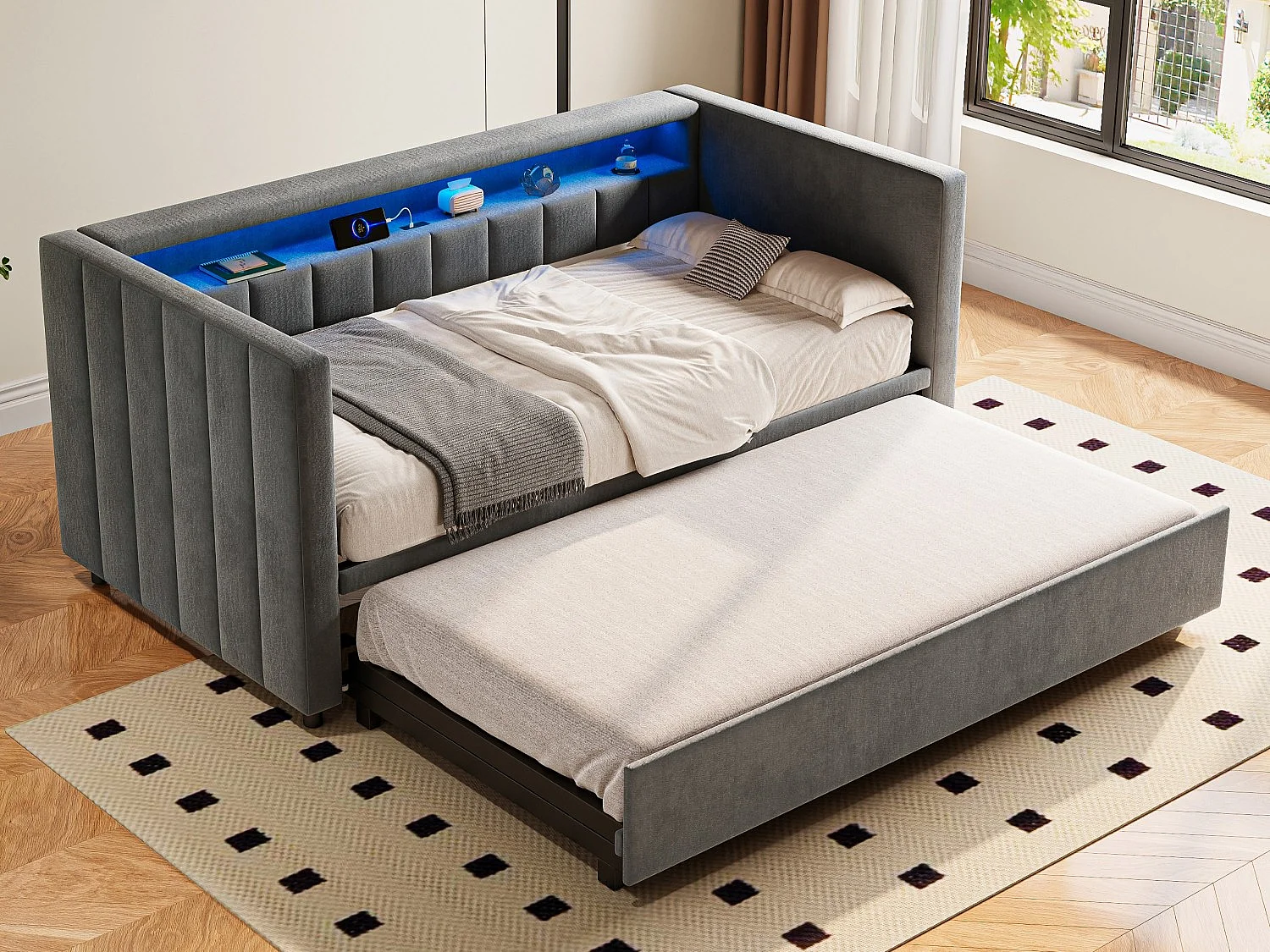 Lit Gigogne 2 Places - Canapé-Lit Velours avec LED RGB, USB/Type-C et Rangement - Structure Renforcée 260kg - Idéal Petit Espace - Snoozepop