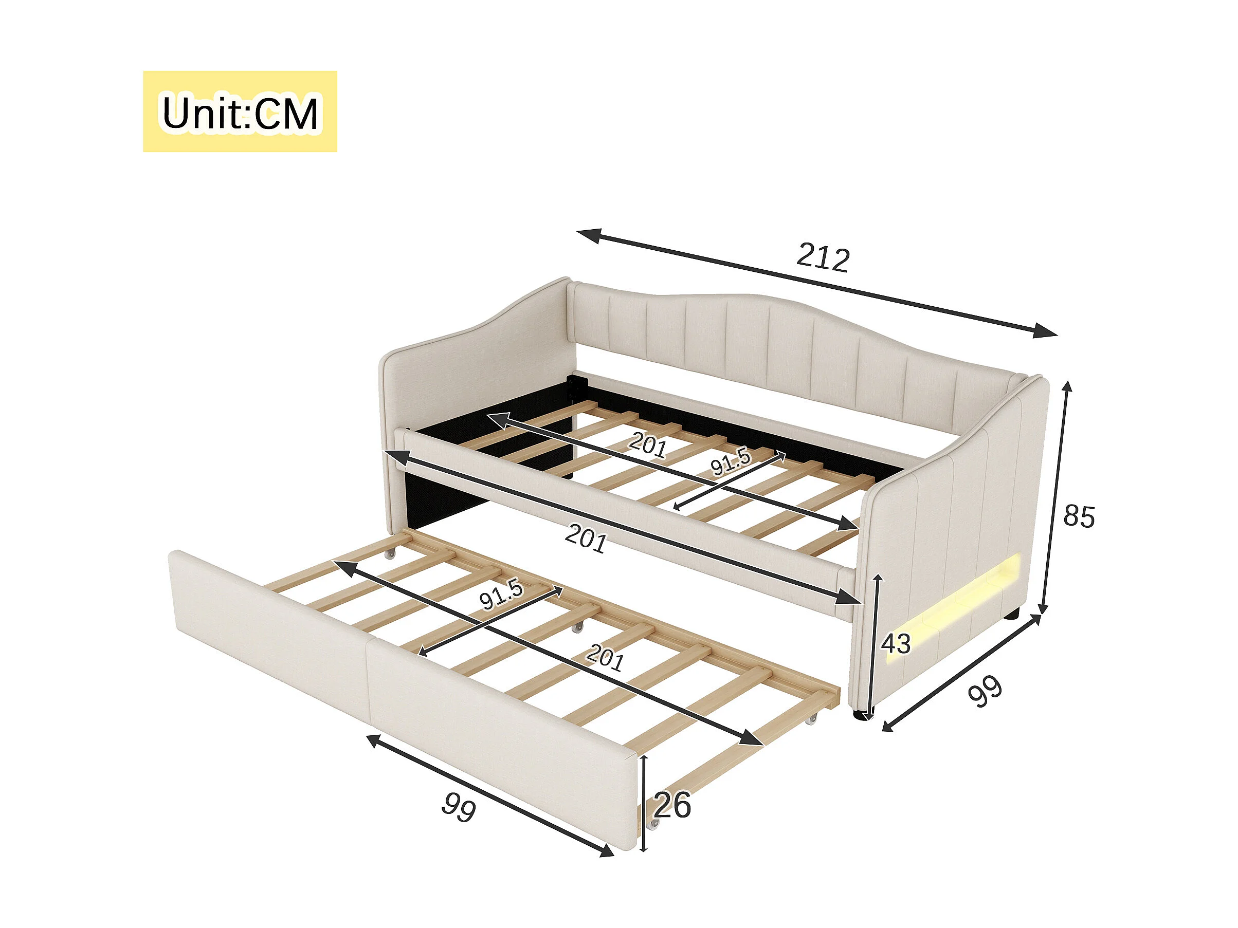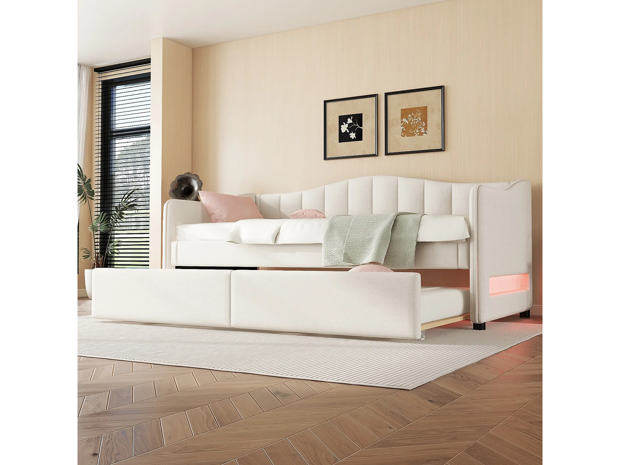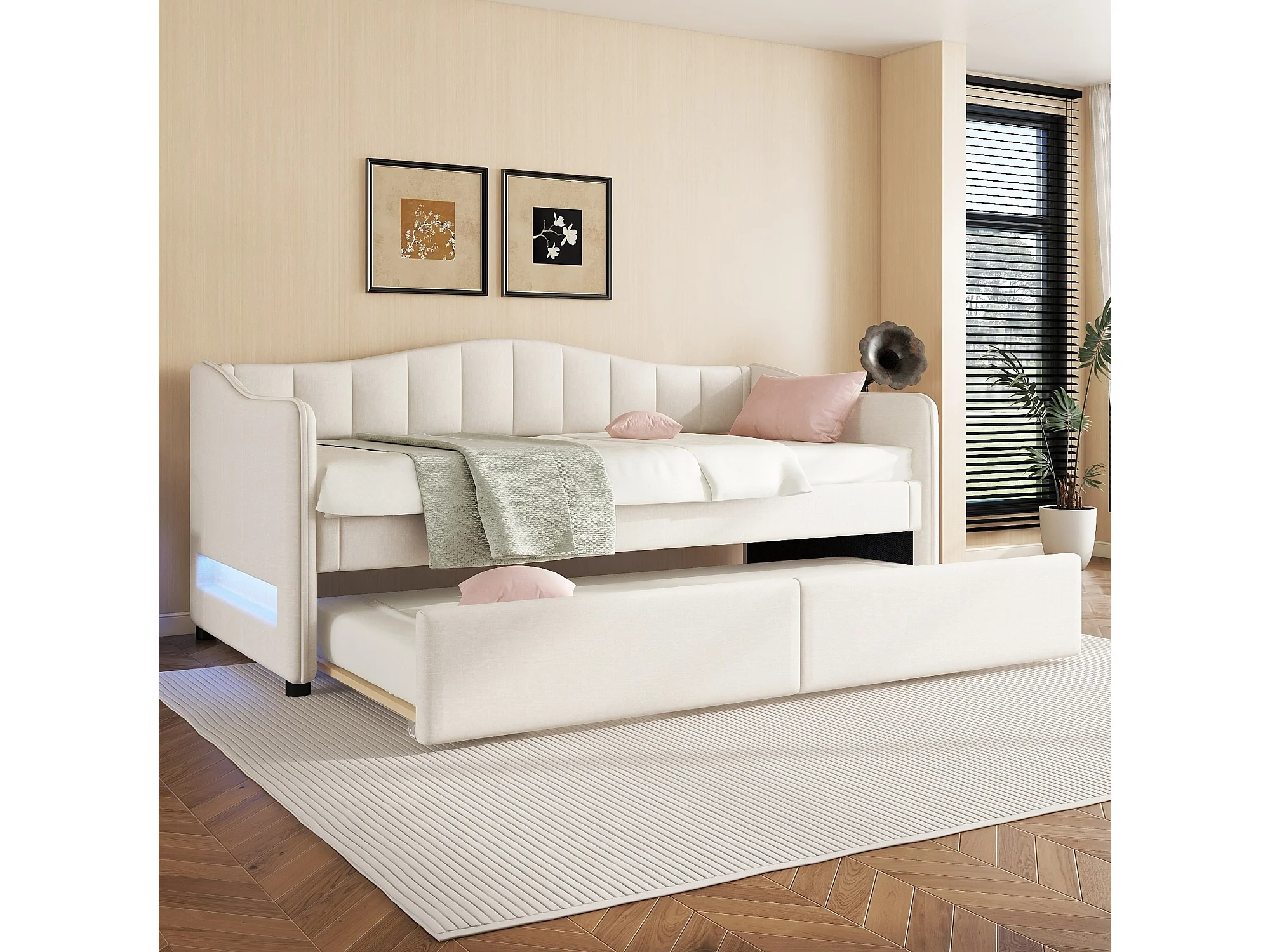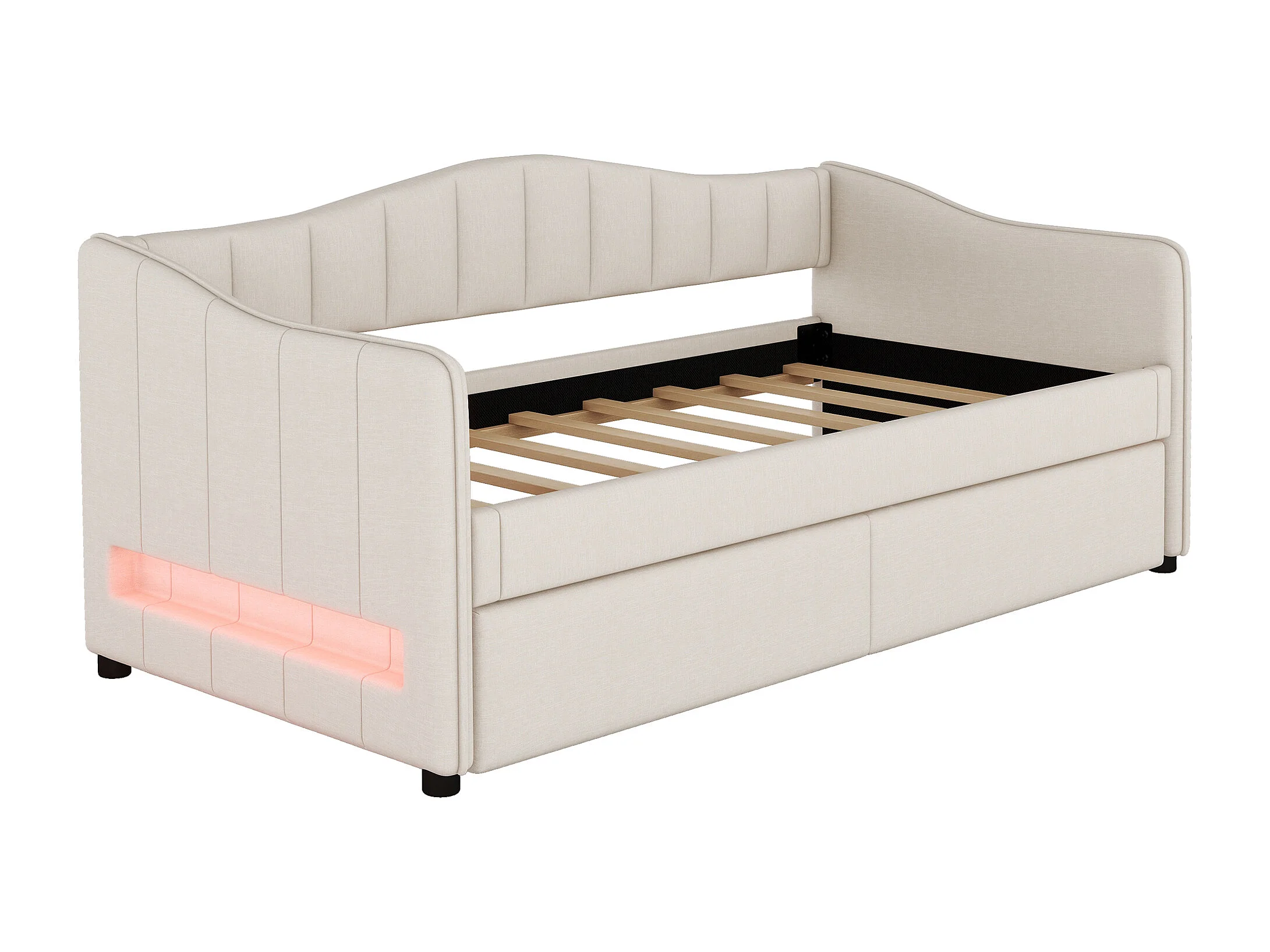 Lit gigogne 90/180 x 200 cm avec 2 tiroirs - tissu en lin - LEDs - beige (sans matelas)