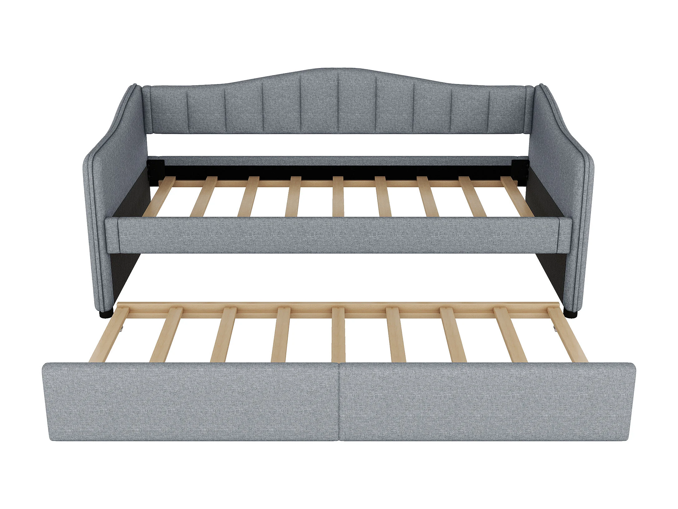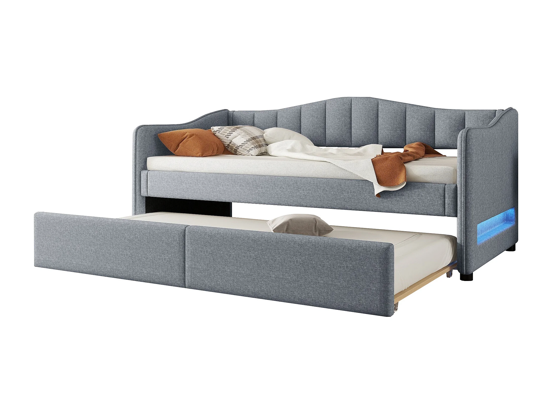 Lit gigogne 90/180 x 200 cm avec 2 tiroirs - tissu en lin - LEDs - gris (sans matelas)