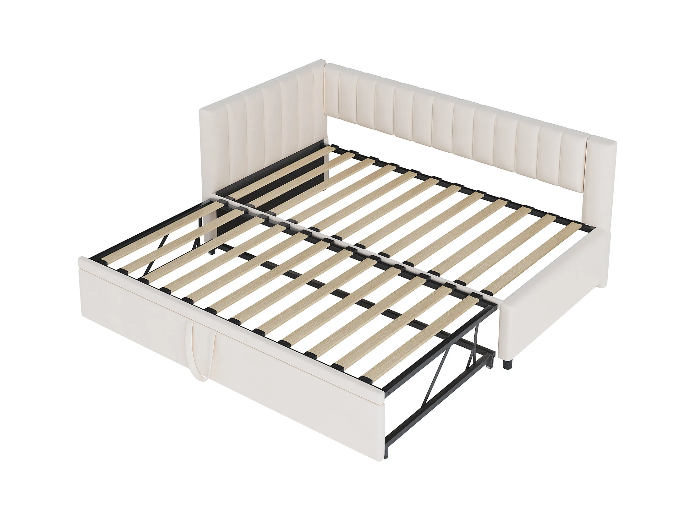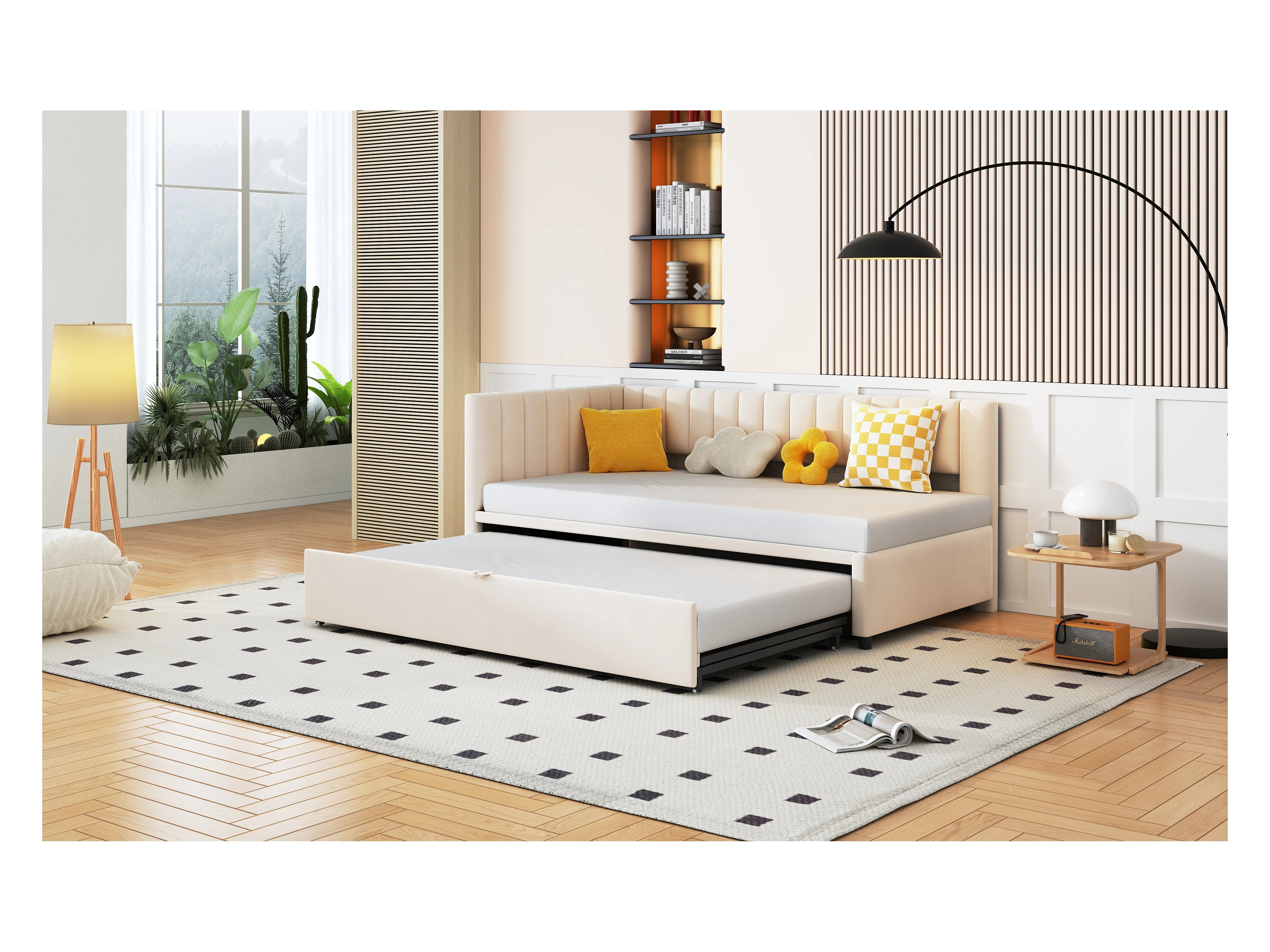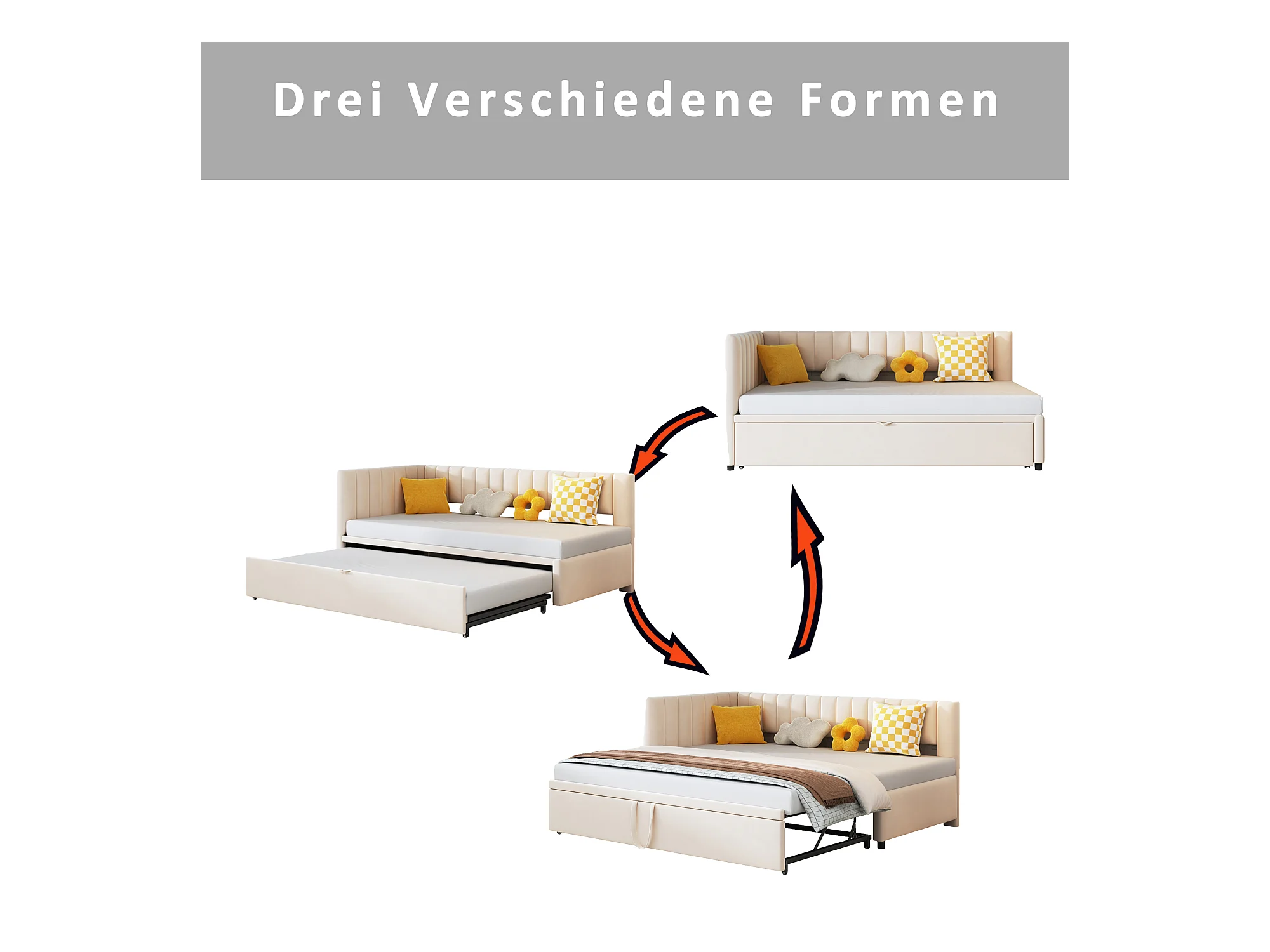 Lit gigogne 90/180 x 200 cm en forme de L, Canapé-lit - Velours - Sommier à lattes - Beige (sans matelas)