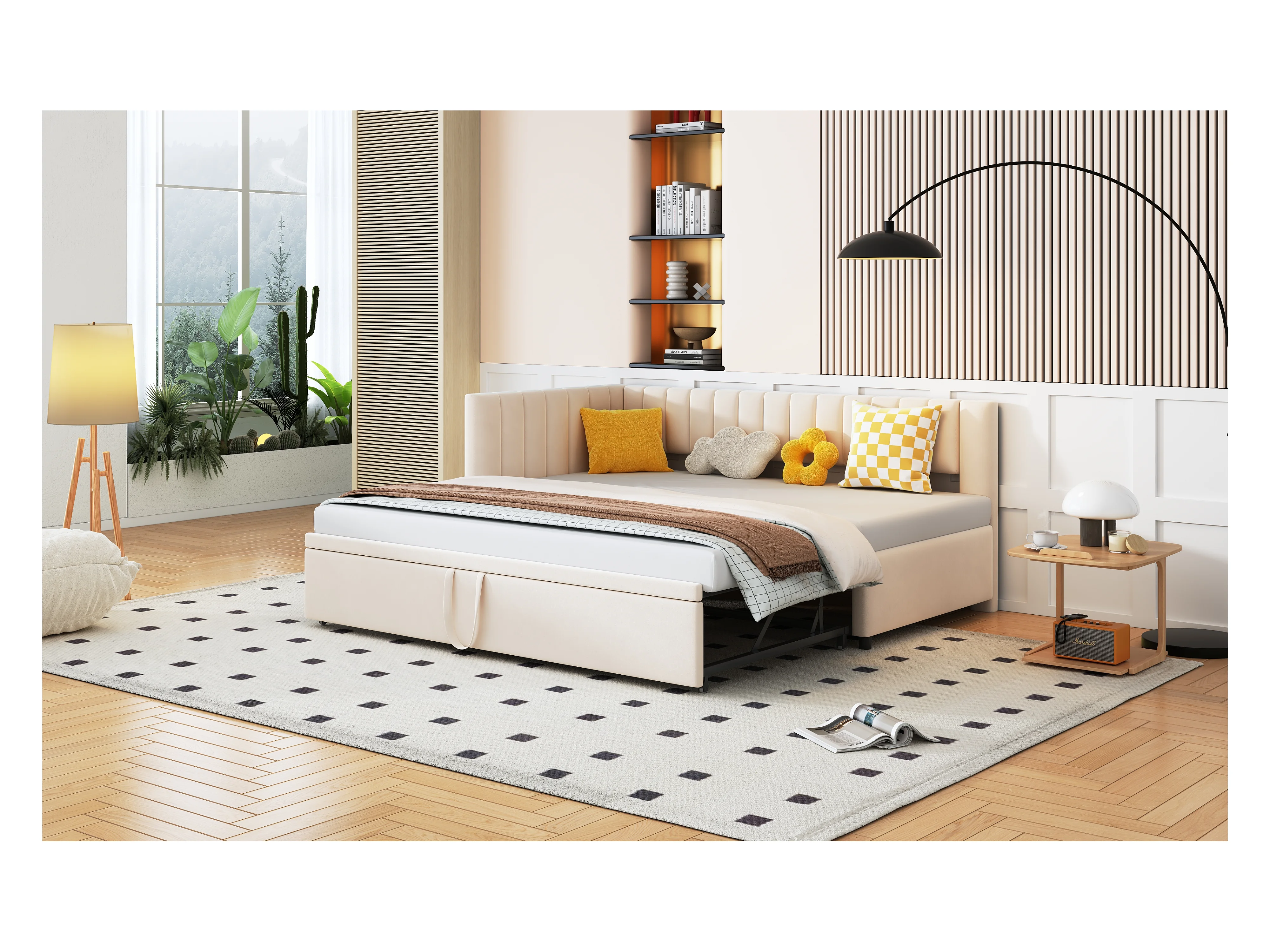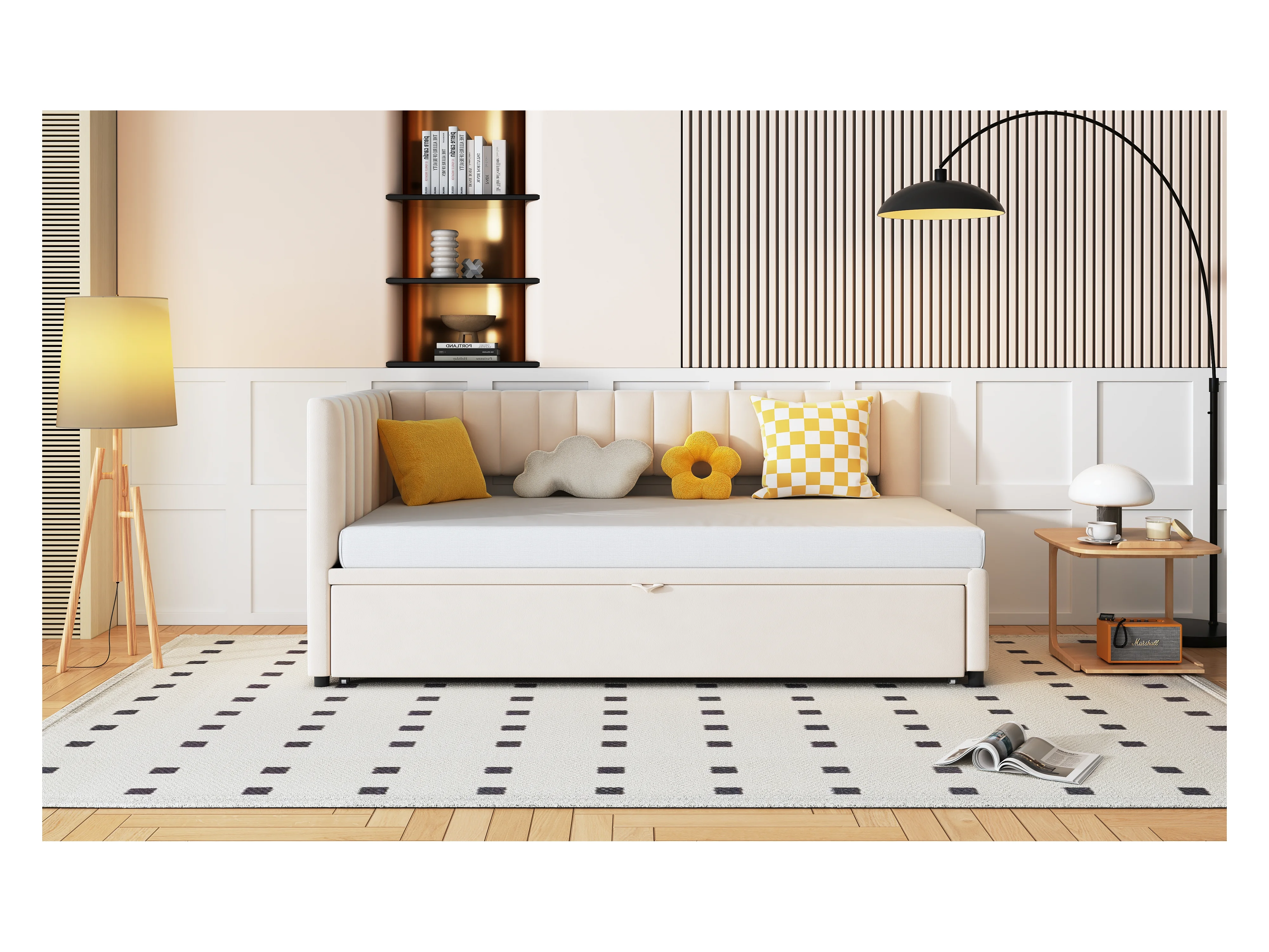 Lit gigogne 90/180x200cm, lit capitonné canapé-lit extensible avec sommiers à lattes, lit multifonctionnel en tissu velours style moderne - beige