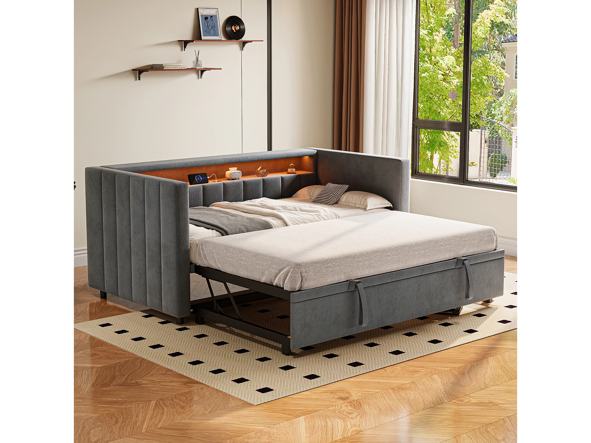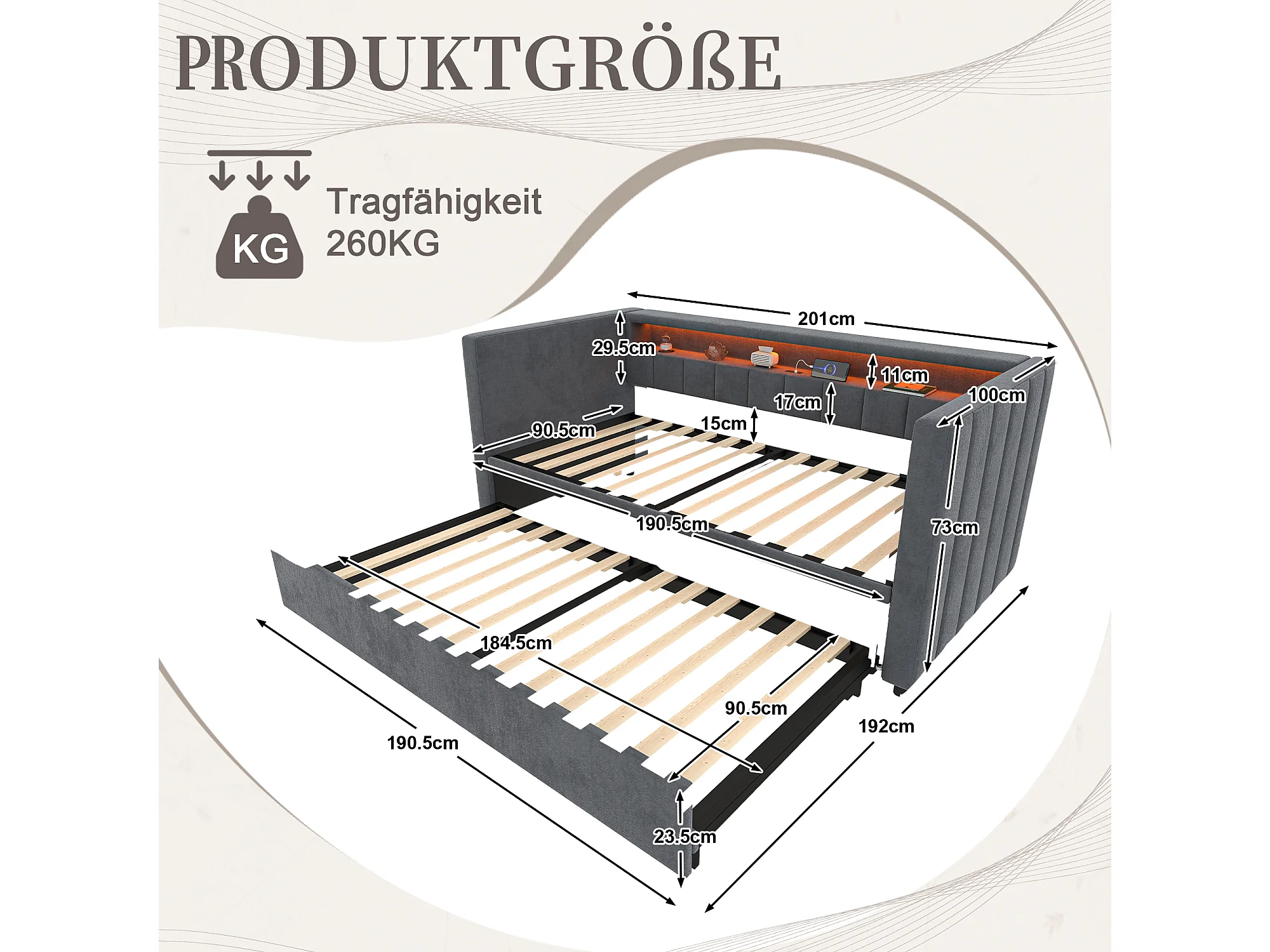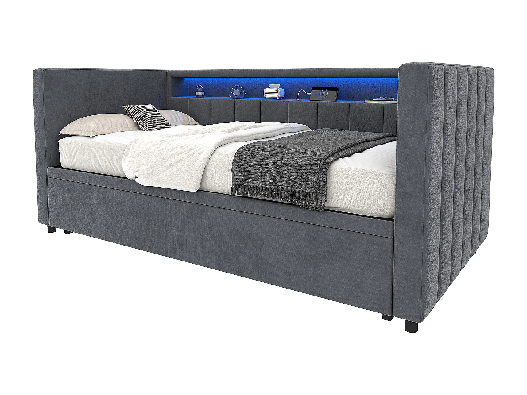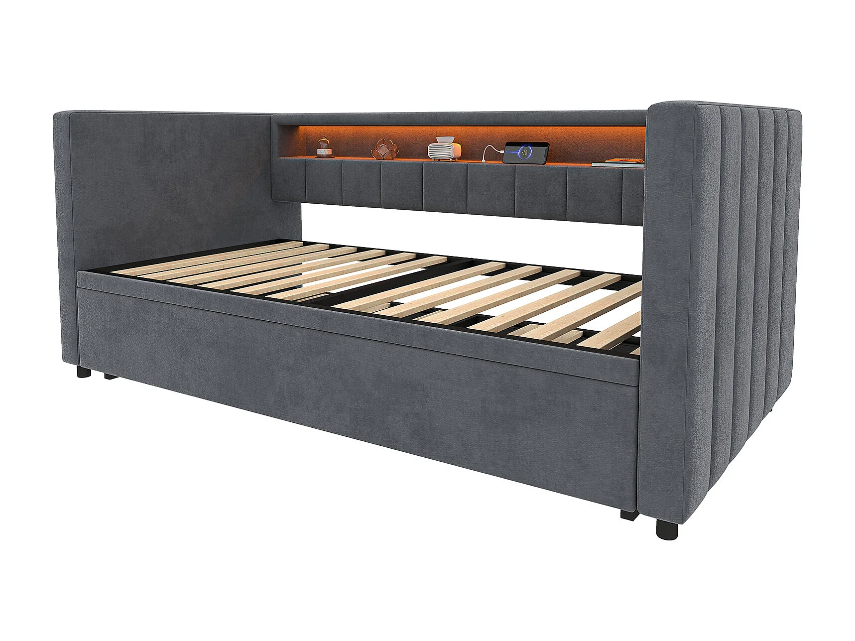 Lit gigogne 90x190 cm - avec tête de lit avec rangement et LED - velours gris foncé - sans matelas