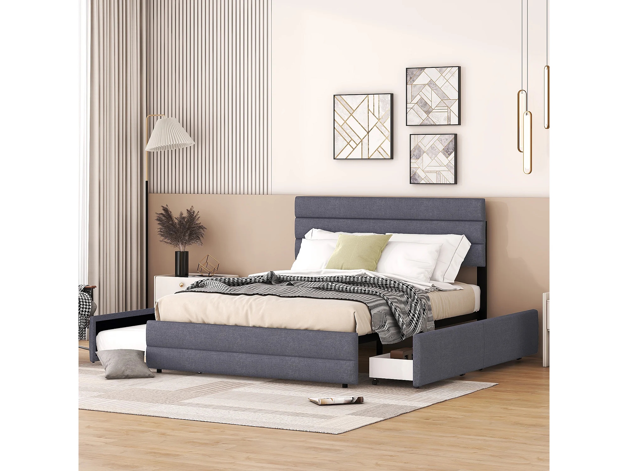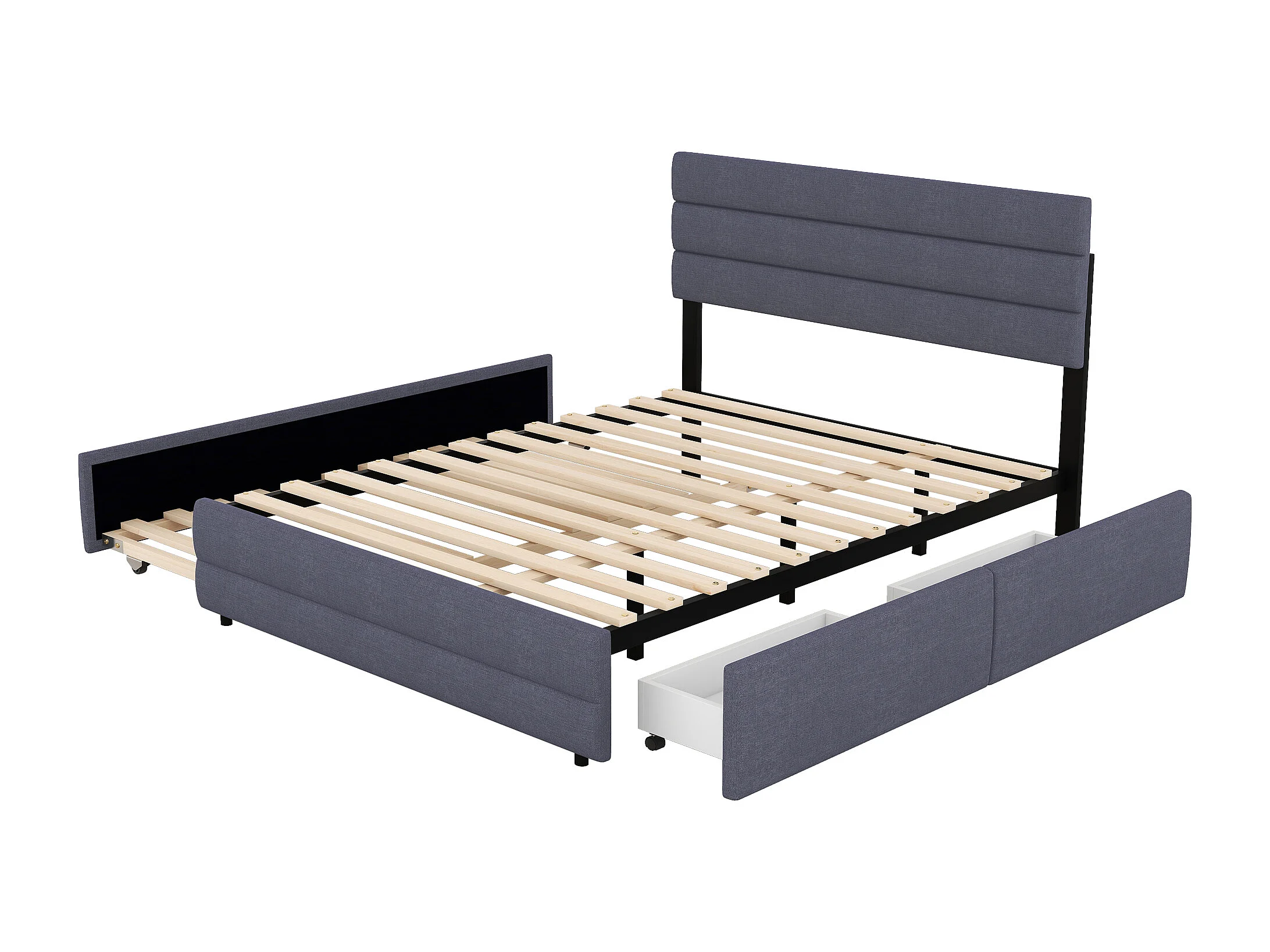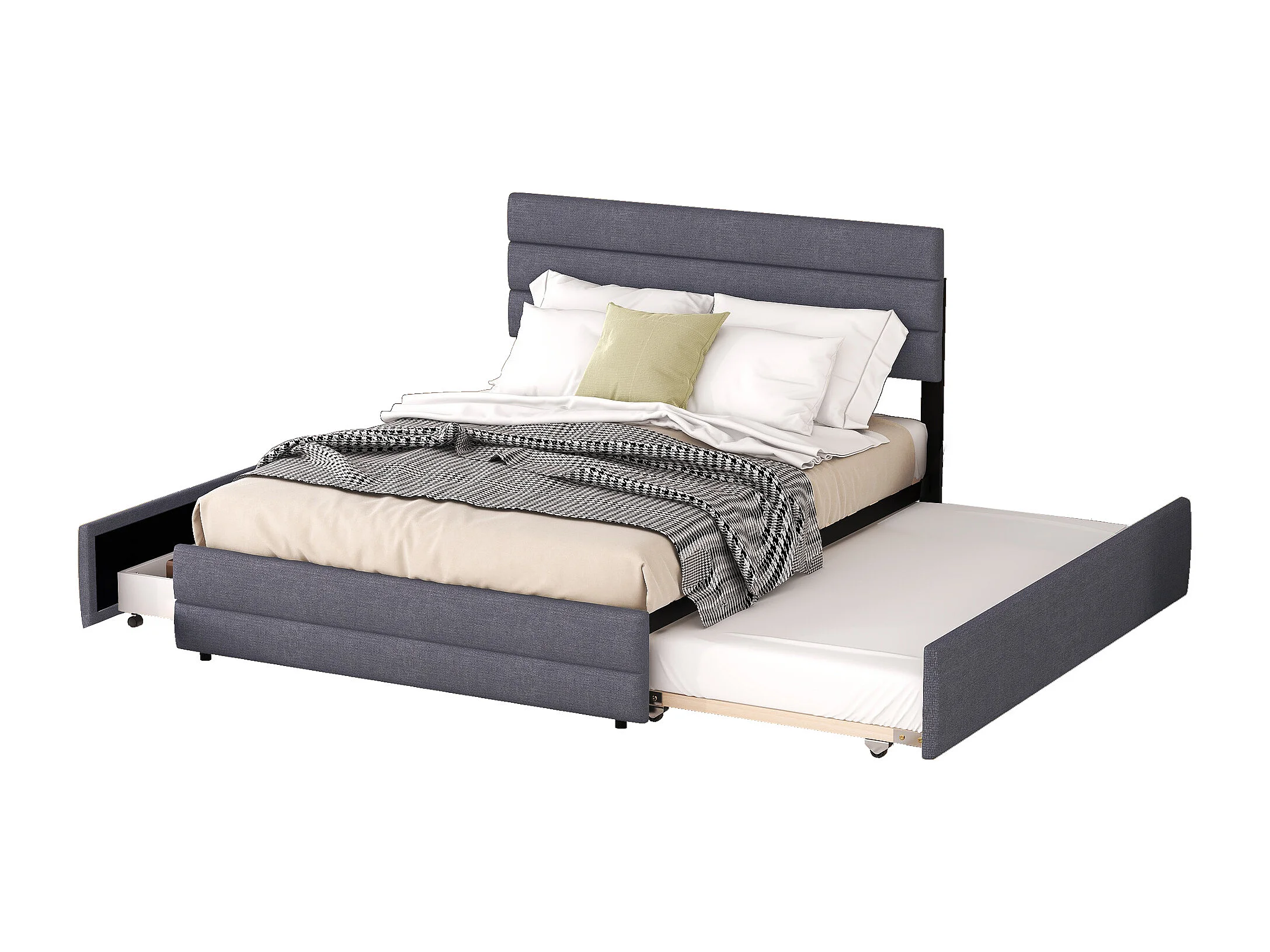 Lit double 140x200 cm, avec lit gigogne et 2 tiroirs de rangement, en lin gris (Sans matelas)