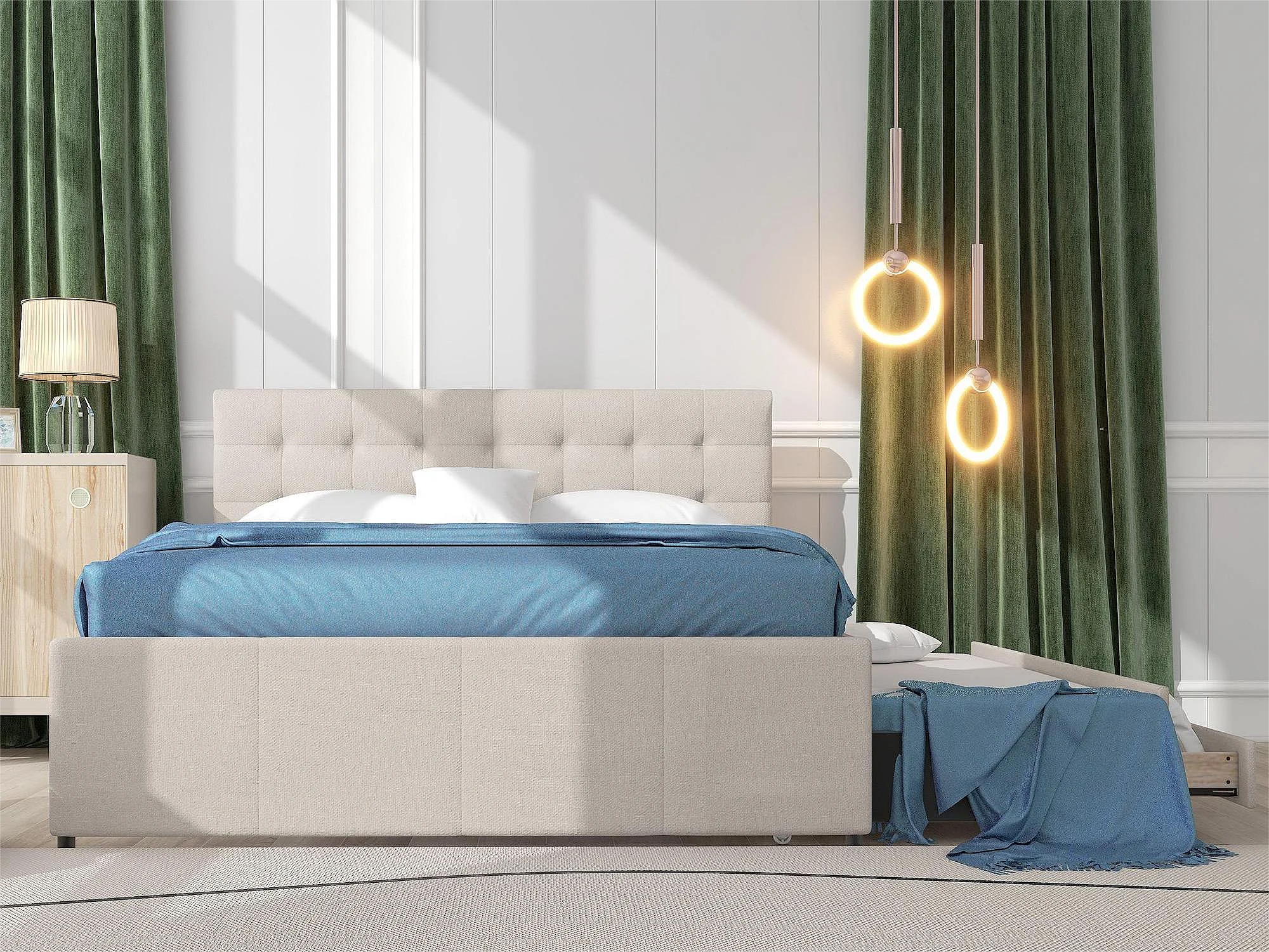Lit gigogne avec 3 tiroirs - 140 x 200 cm + 90 x 190 cm - tissu lin - tête de lit réglable - coloris beige