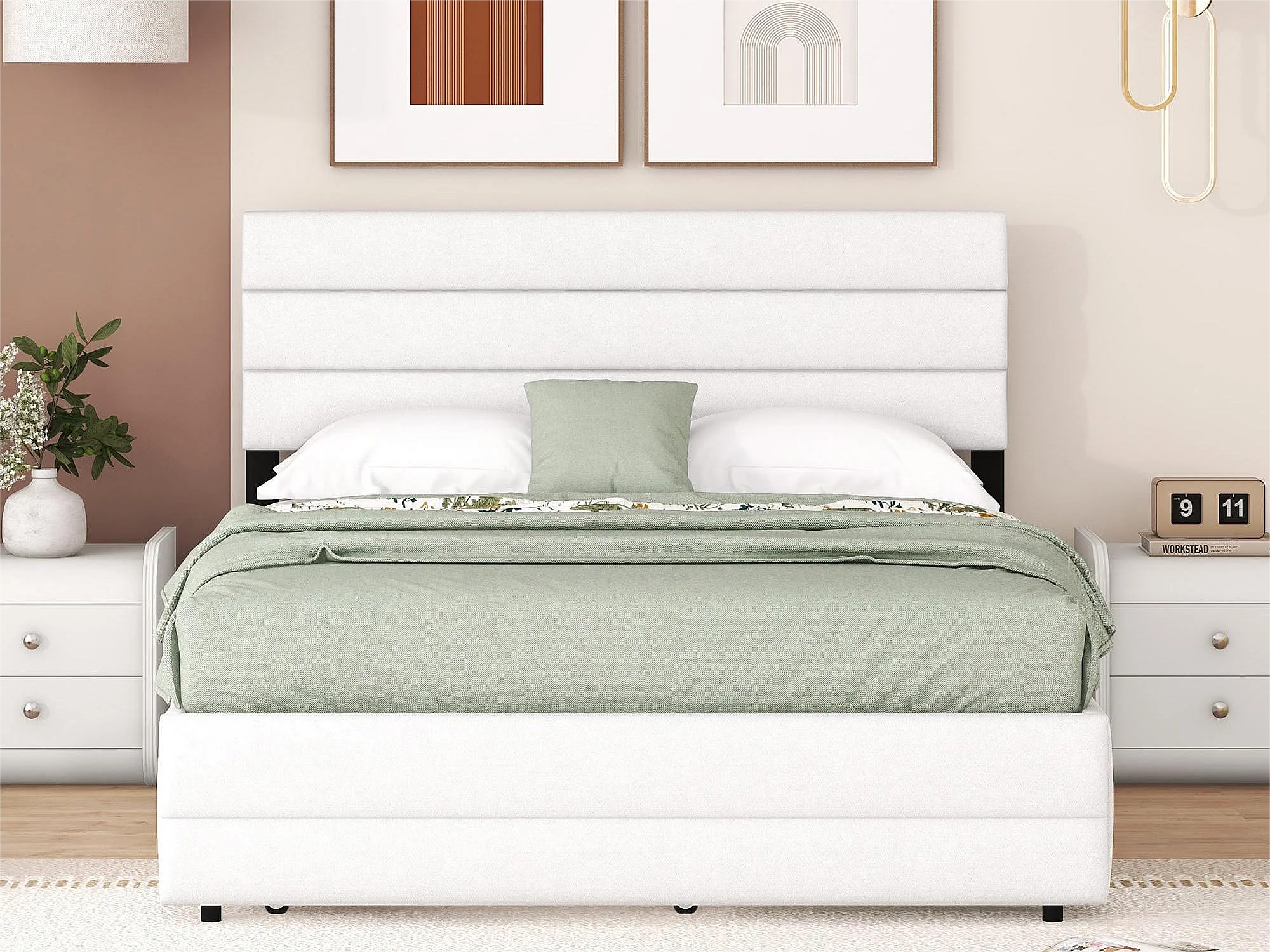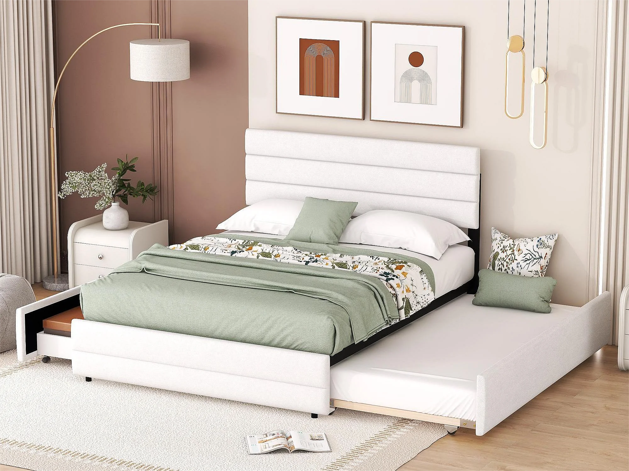 Lit gigogne avec rangement - 140 x 200 cm + 90 x 190 cm - tissu lin - tête de lit réglable - sommier à lattes - coloris blanc