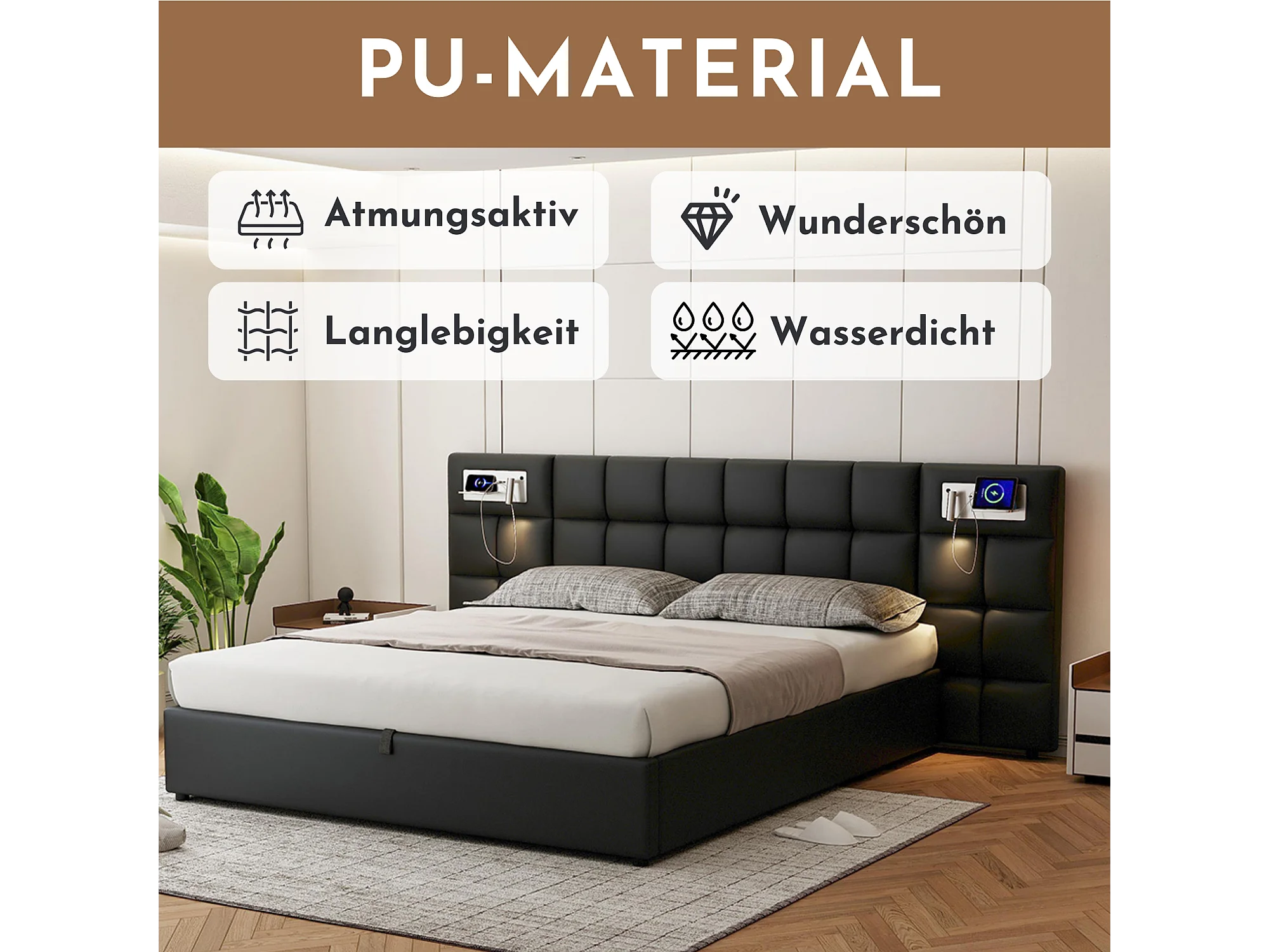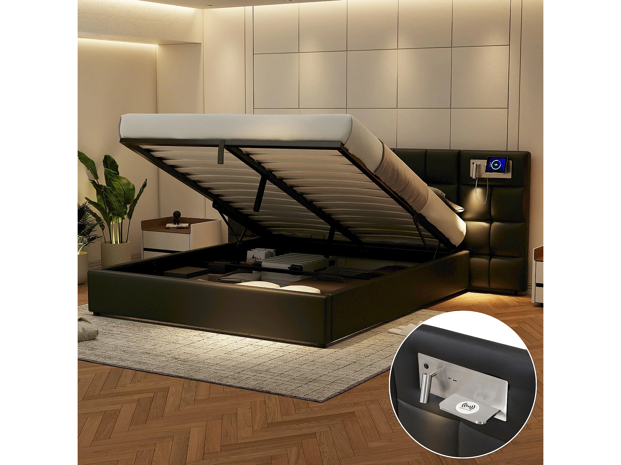 Lit hydraulique 180 x 200 cm, avec port USB, charge sans fil, lampe éclairante et rangement, cadre en PU noir, soutien en lattes de bois (180 x 200 cm)