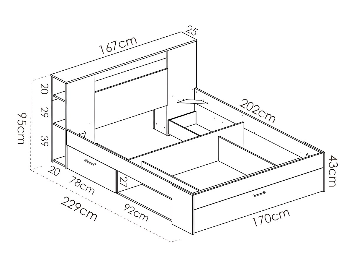 Avec sa tête de lit composée de rangements, ses 2 tiroirs, ses 2 niches latérales et son coffre en bout de lit, le lit LEANDRE allie l'utile à l'agréable en vous permettant de ranger vos livres, votre linge de lit, vos vêtements et bien d'autres choses.