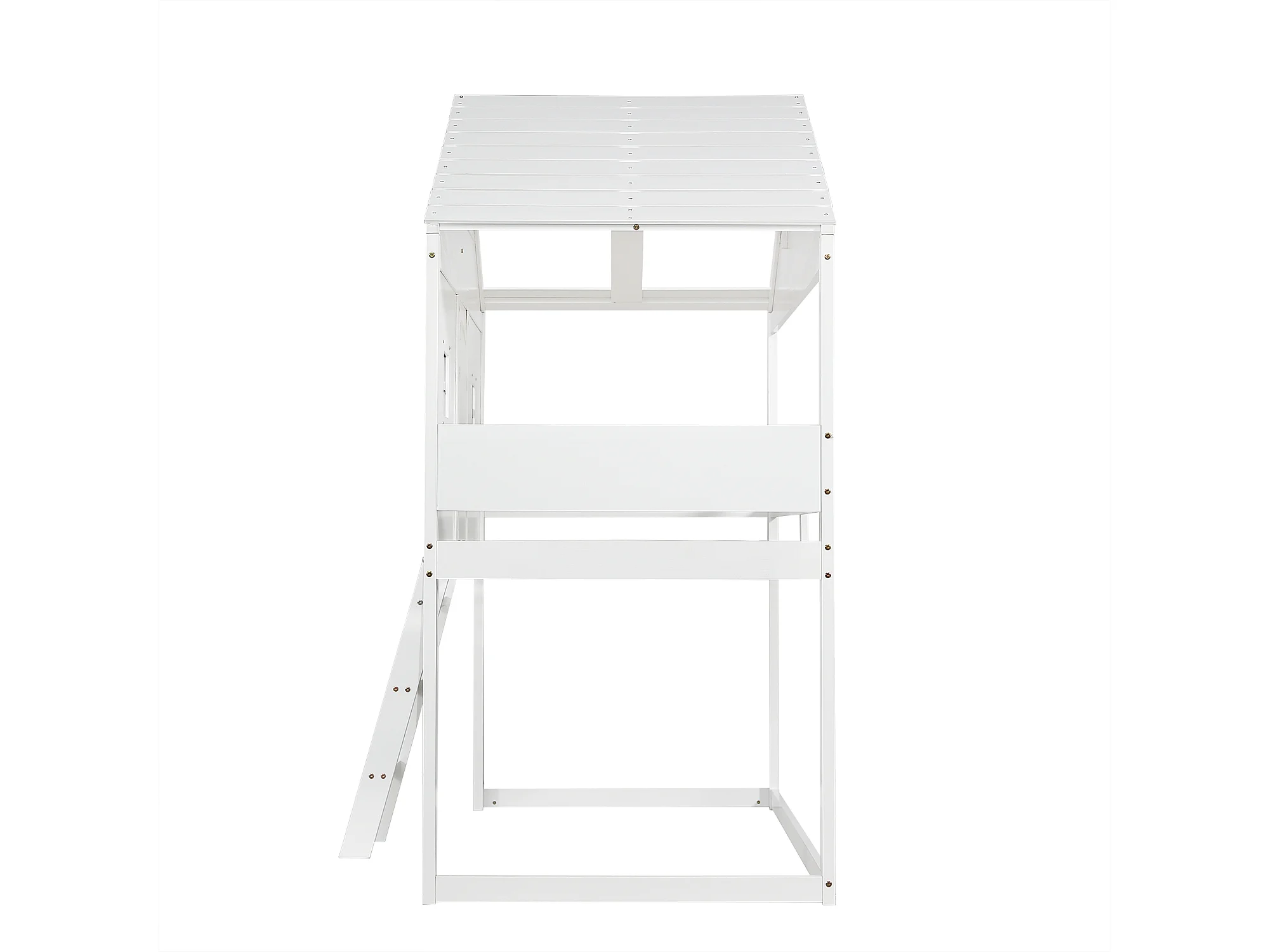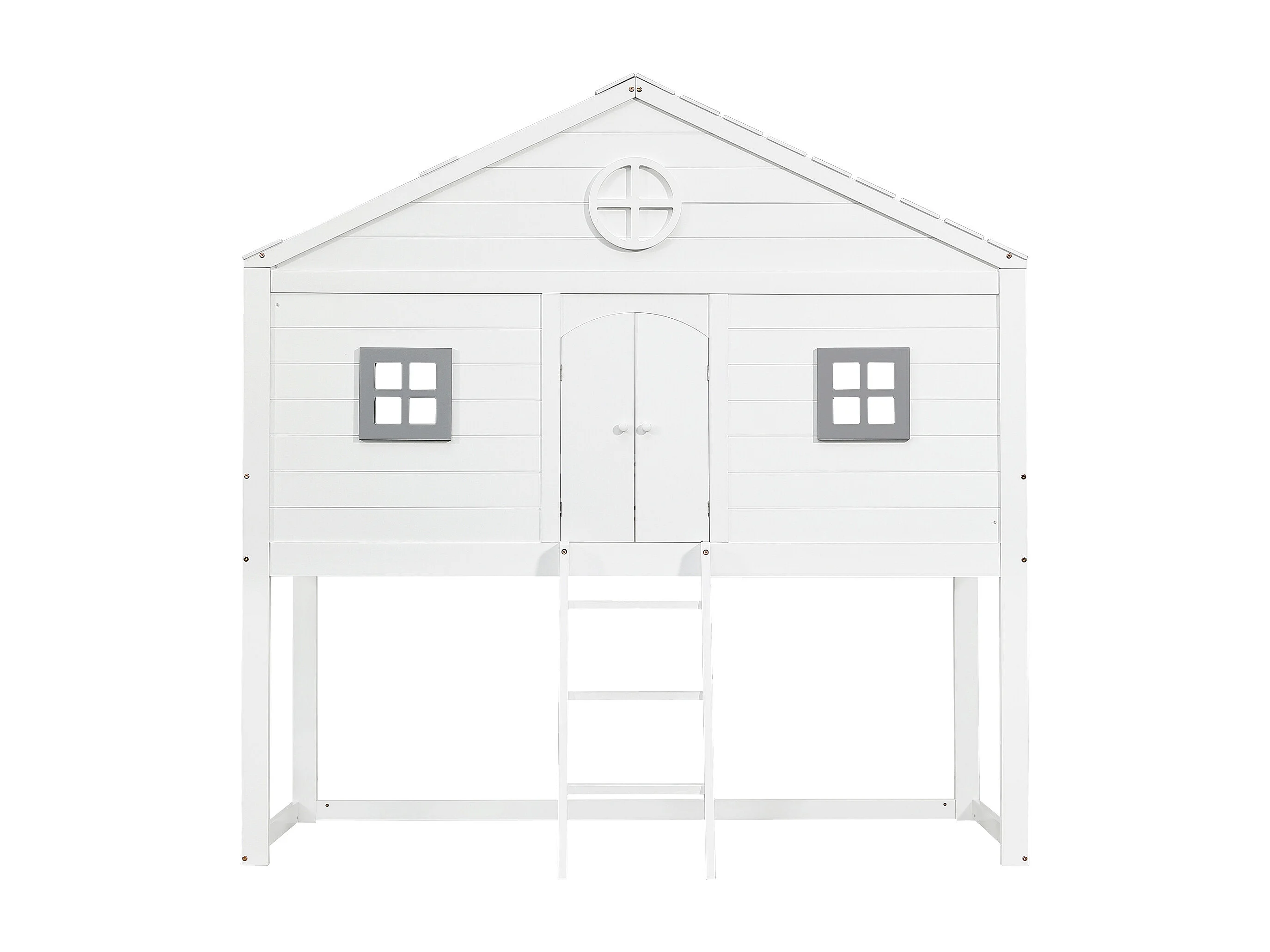 Lit maison, échelle, garde-corps, 2 fenêtres grises, sommier autoportant, pin, pin+MDF, blanc+gris, 90x200cm