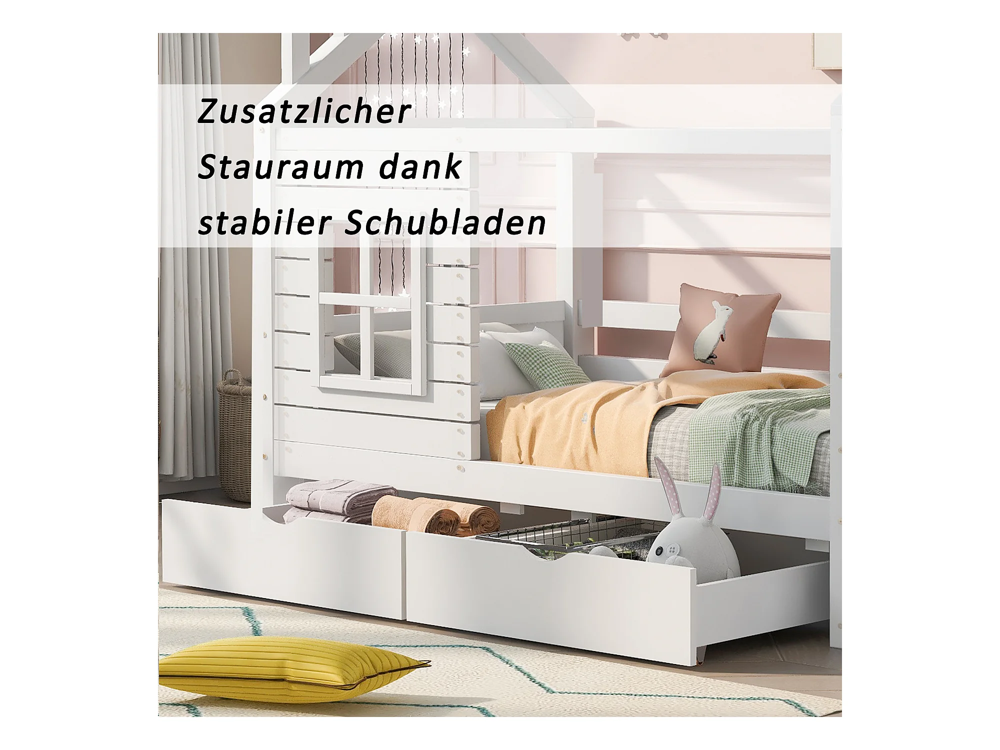 Lit enfant en forme de maison avec tiroirs et étagères, cadre en bois massif, blanc (243x209x183 cm)