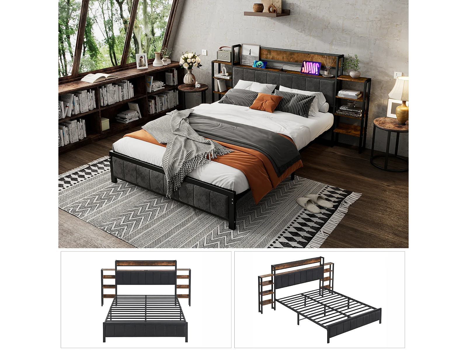 Lit métal, lit coffre, tête de lit étagère, 3 ports USB, velours, ado/adulte, métal+MDF+velours, noir+noyer, 140x200cm