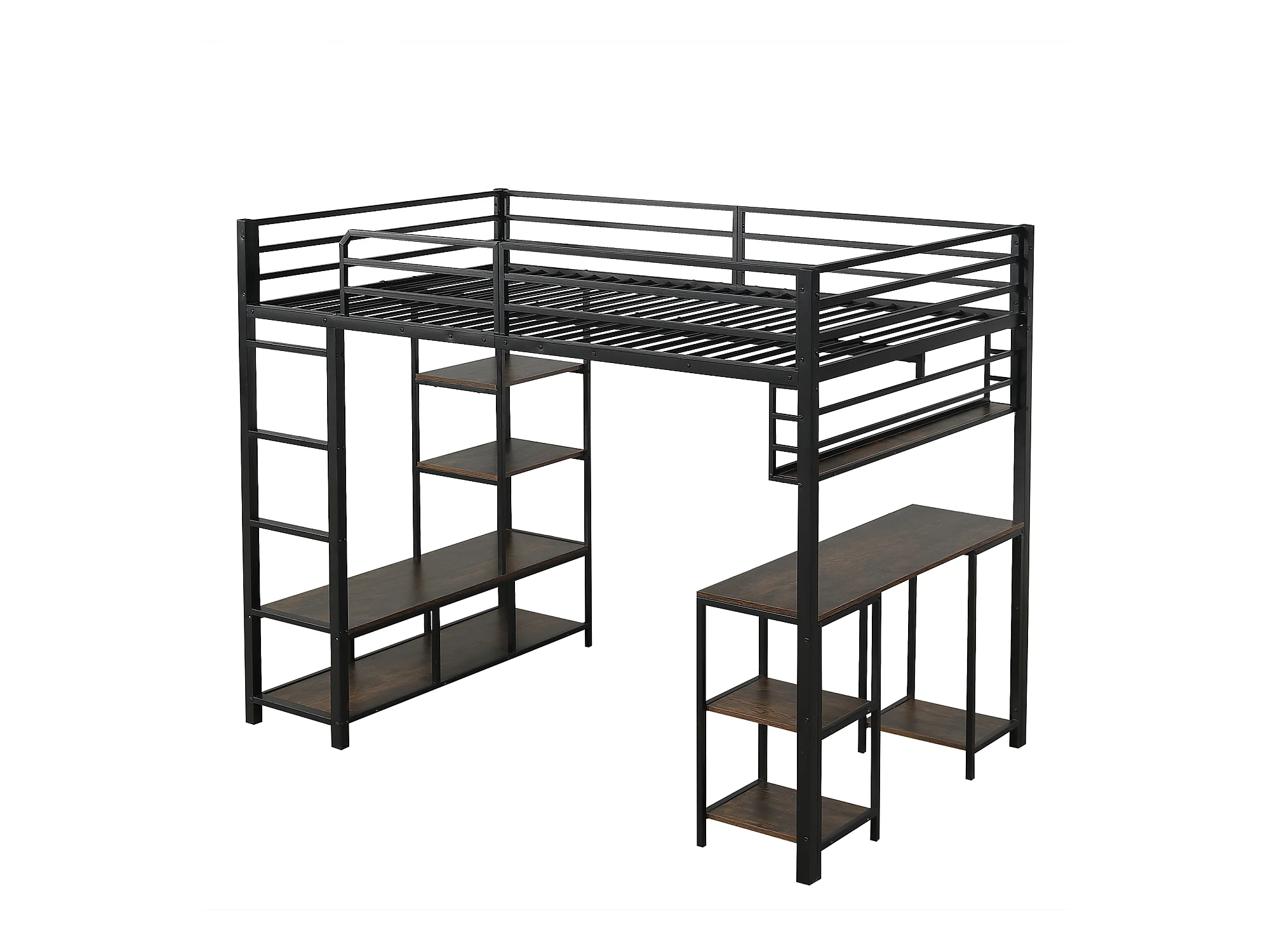 Lit mezzanine 120x200cm noir et noyer foncé avec bureau et étagère, métal + panneaux de particules