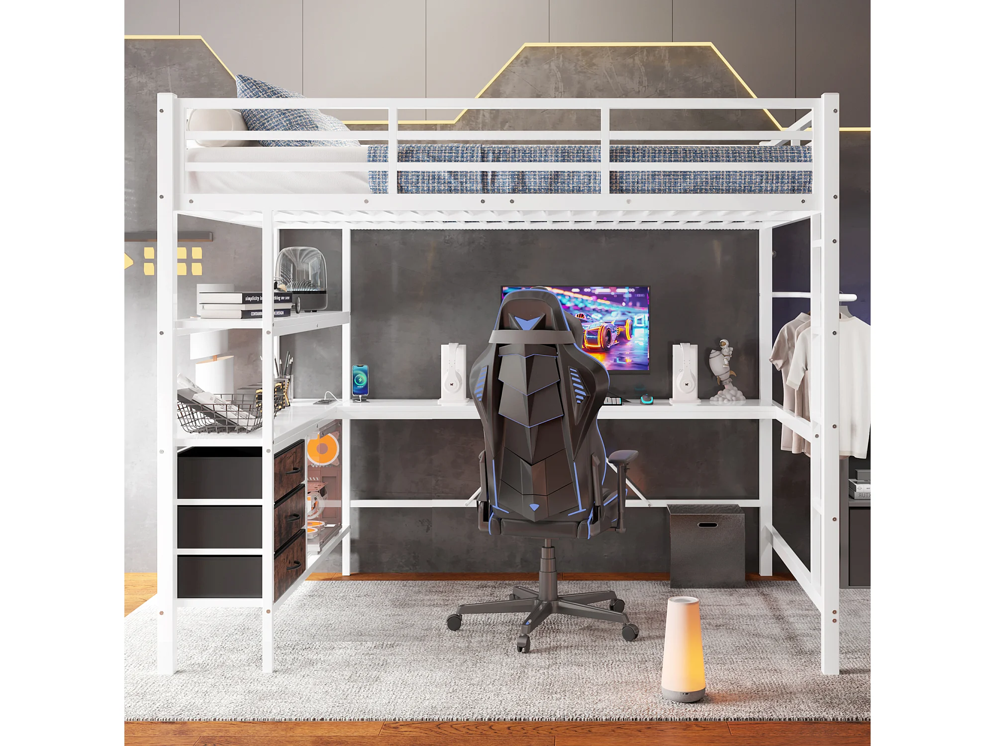 Lit mezzanine 140 x 200 cm avec bureau d'angle, 3 tiroirs et étagères - Prise USB et Lumière d'ambiance - Métal - Blanc (sans matelas)