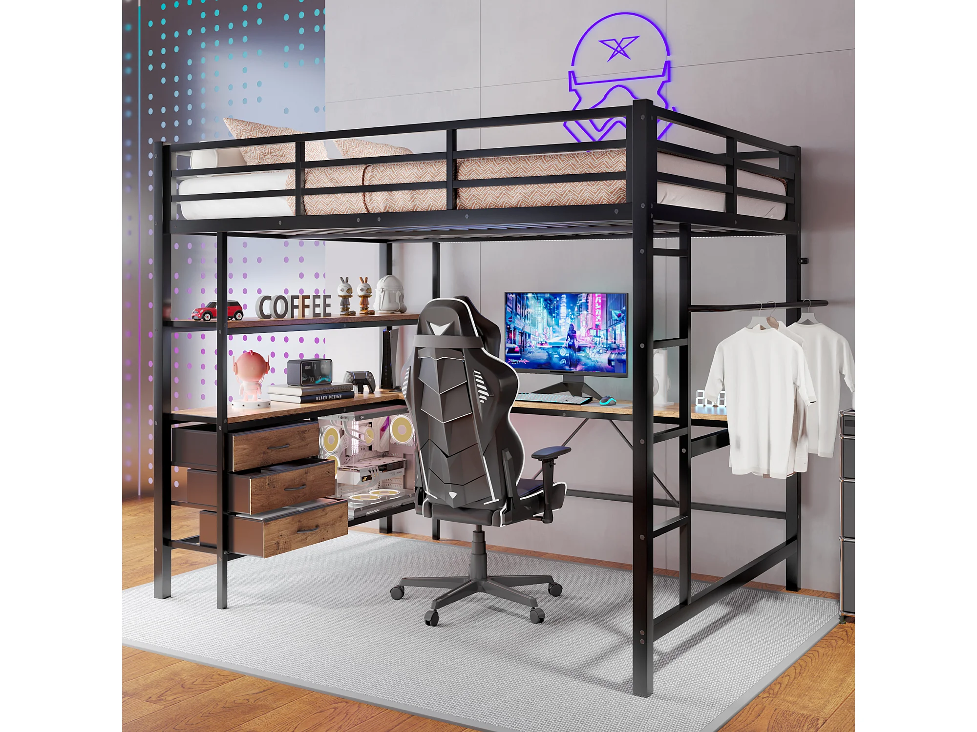 Lit mezzanine 140 x 200 cm avec bureau d'angle, 3 tiroirs et étagères - Prise USB et Lumière d'ambiance - Métal - Noir (sans matelas)