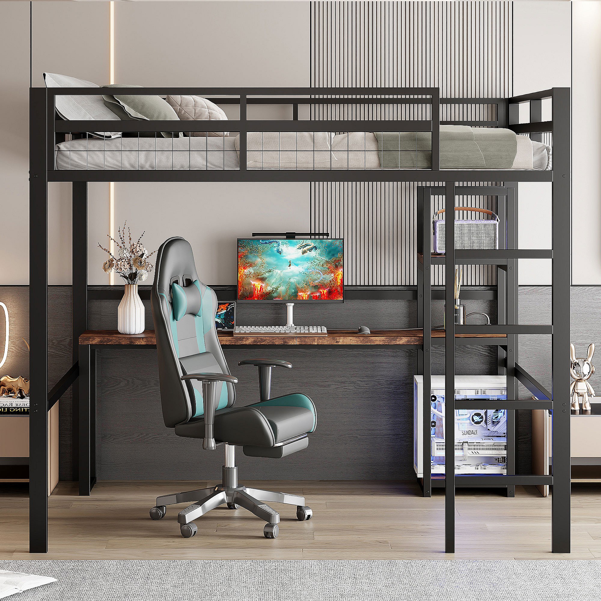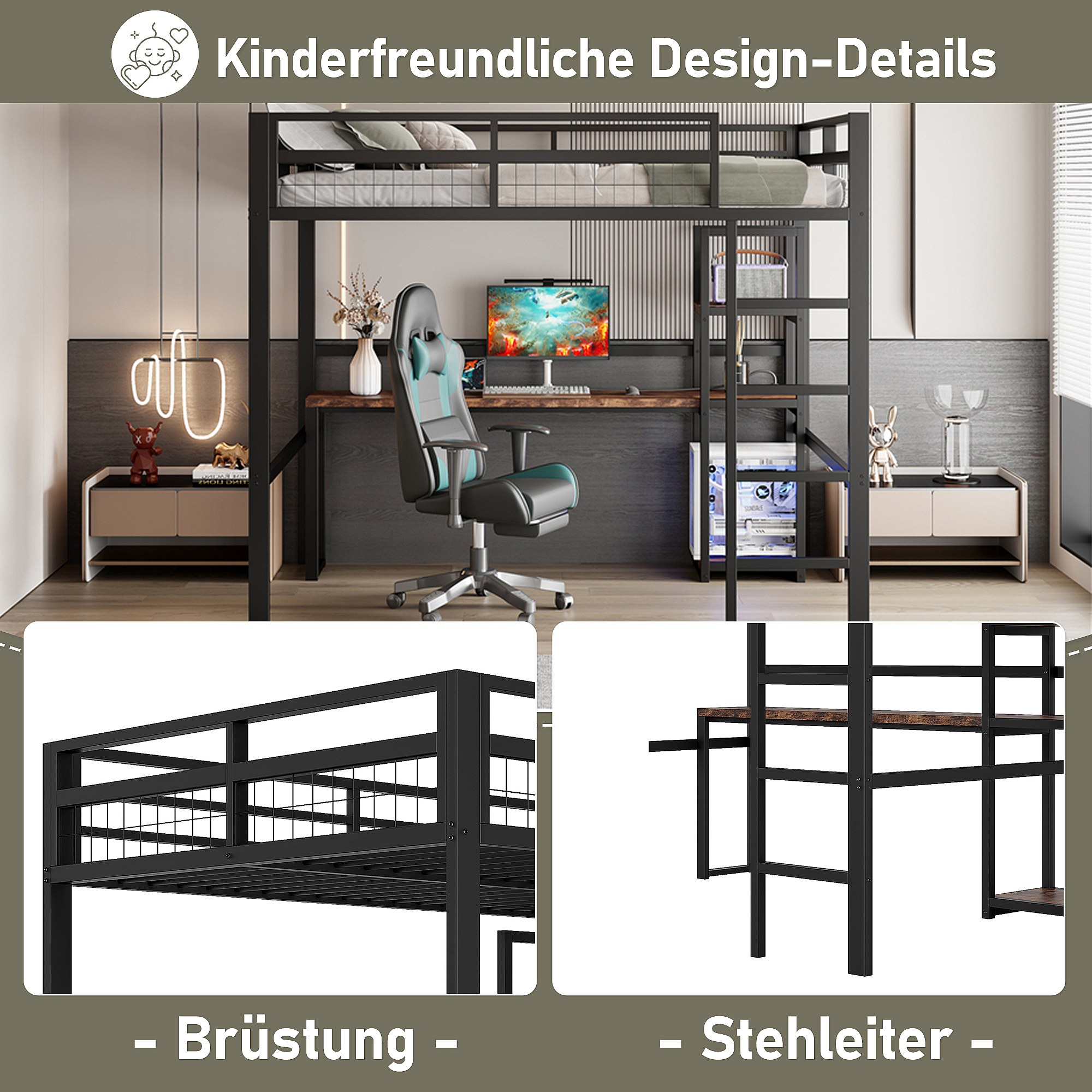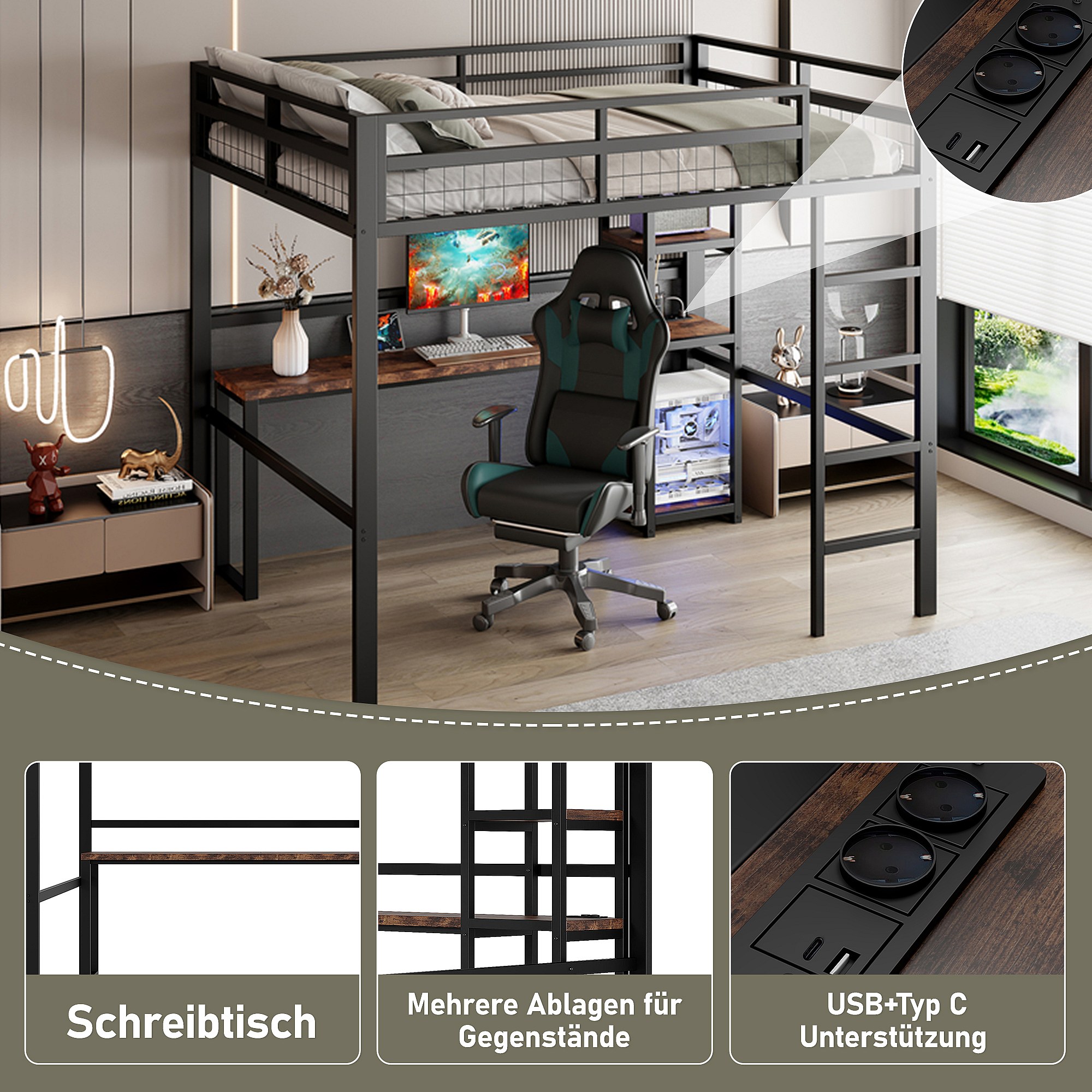 Lit mezzanine, 140 x 200 cm, cadre en métal, étagères multiples, bureau avec prise USB et Type-C (204x144x180 cm)