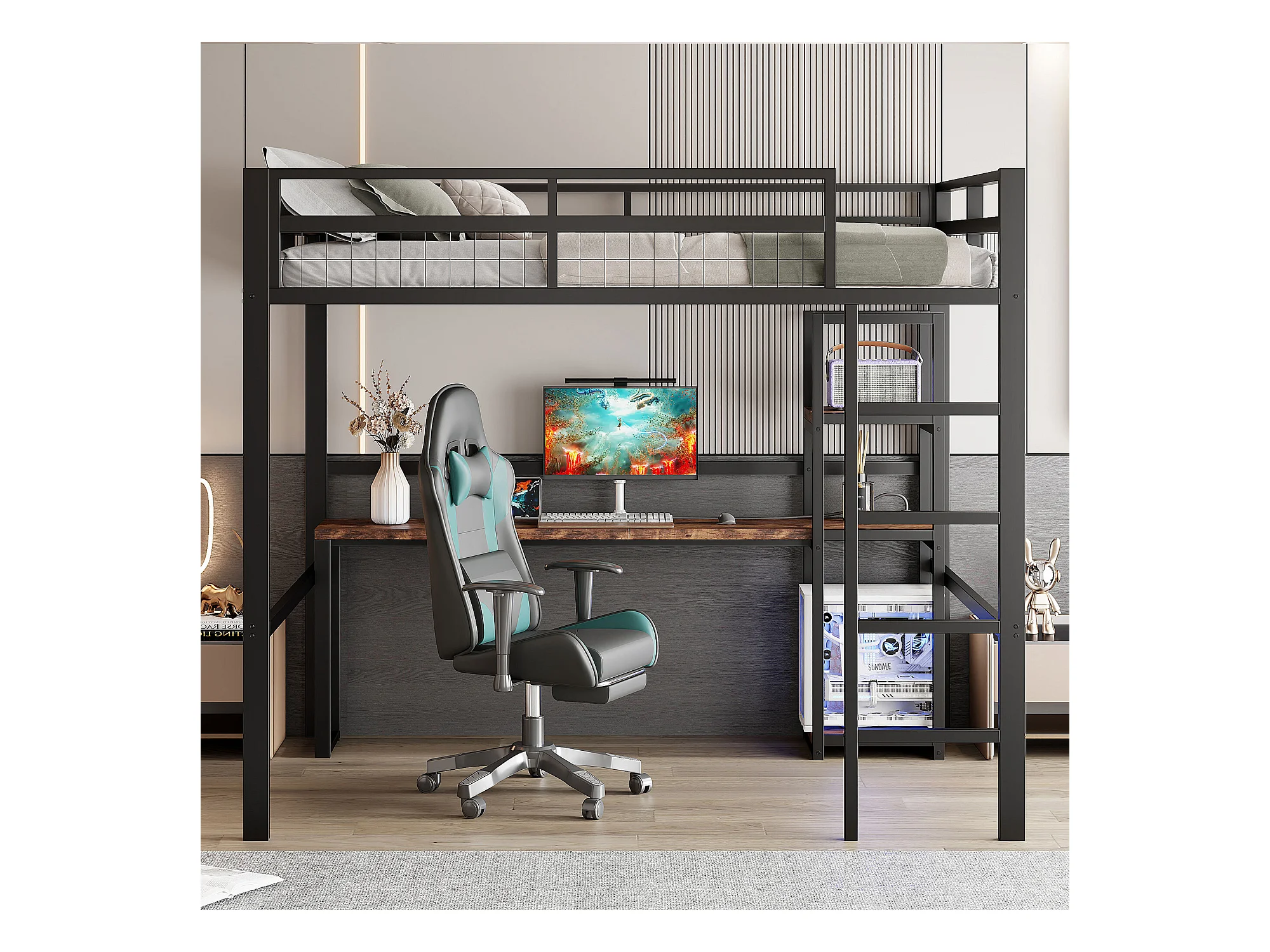 Lit mezzanine 140x200cm en métal - avec étagères et escalier - Noir (matelas non inclus)