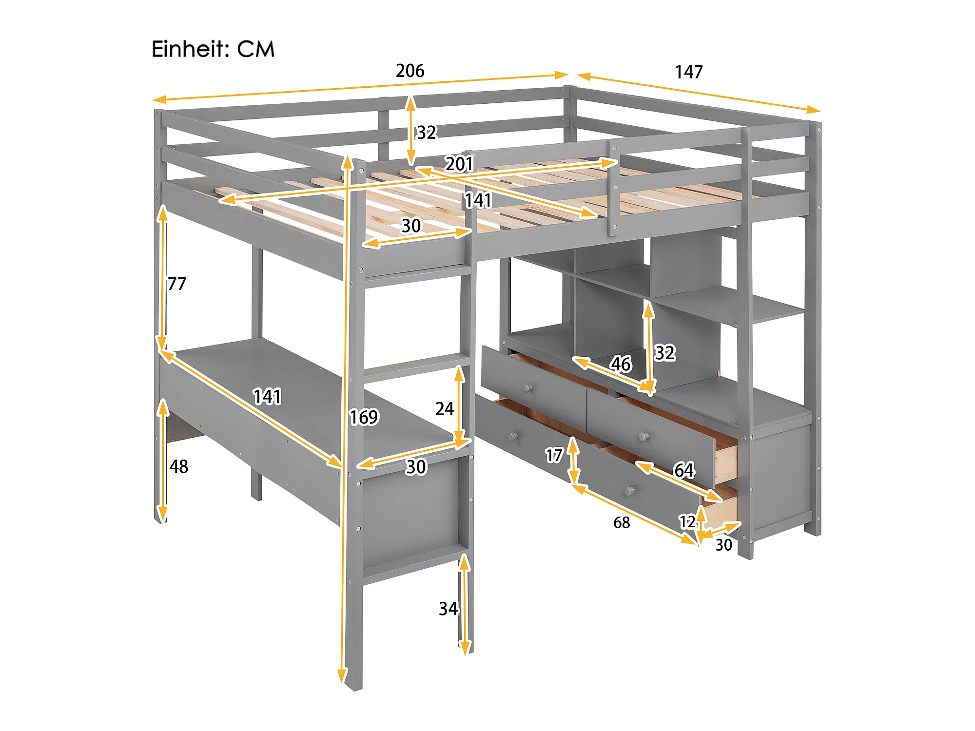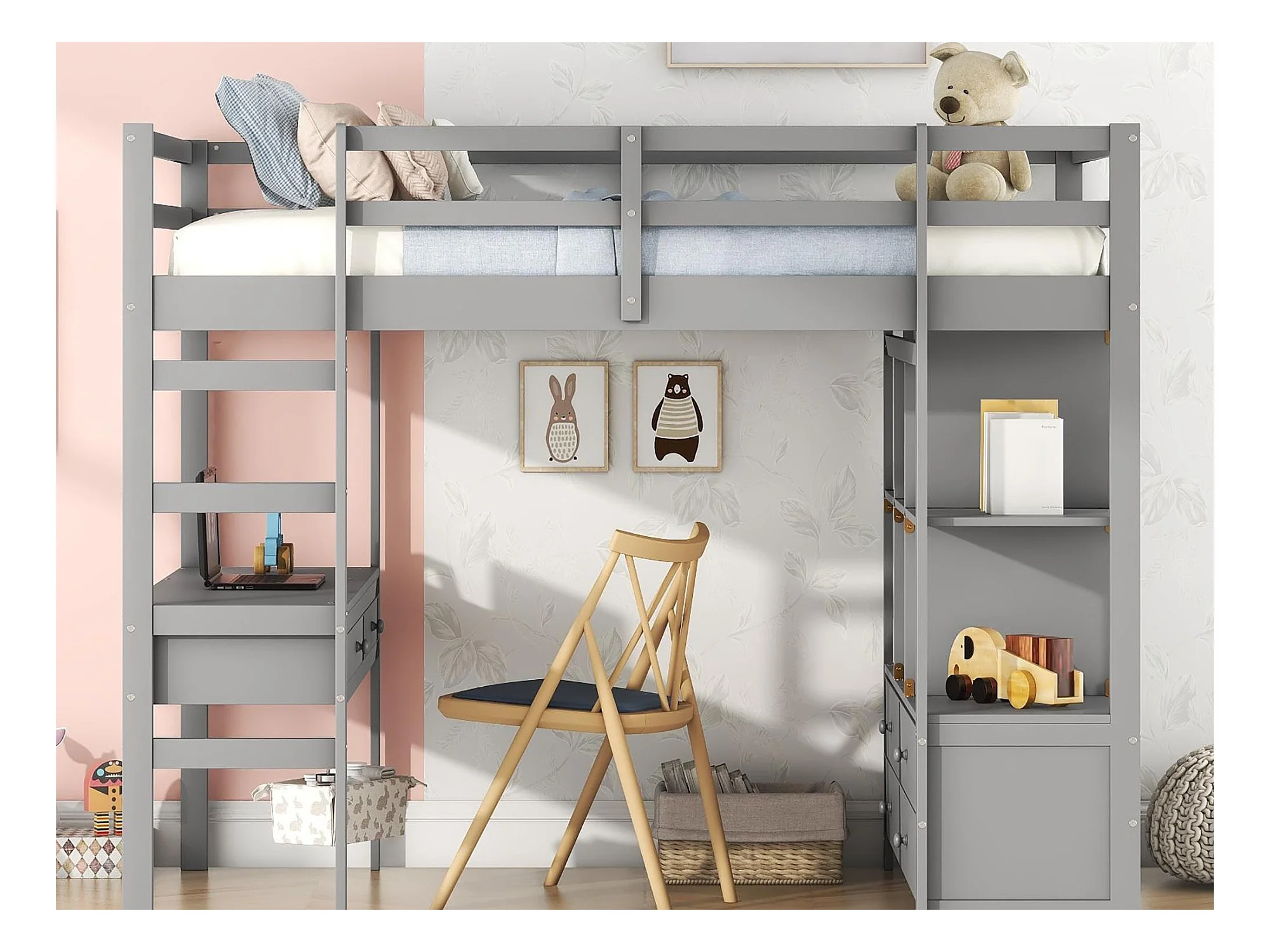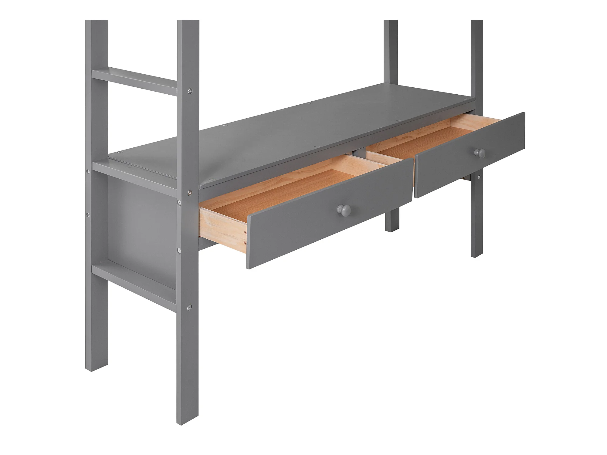 Lit mezzanine 140 x 200 cm pour enfant - bureau et tiroirs - pin - gris