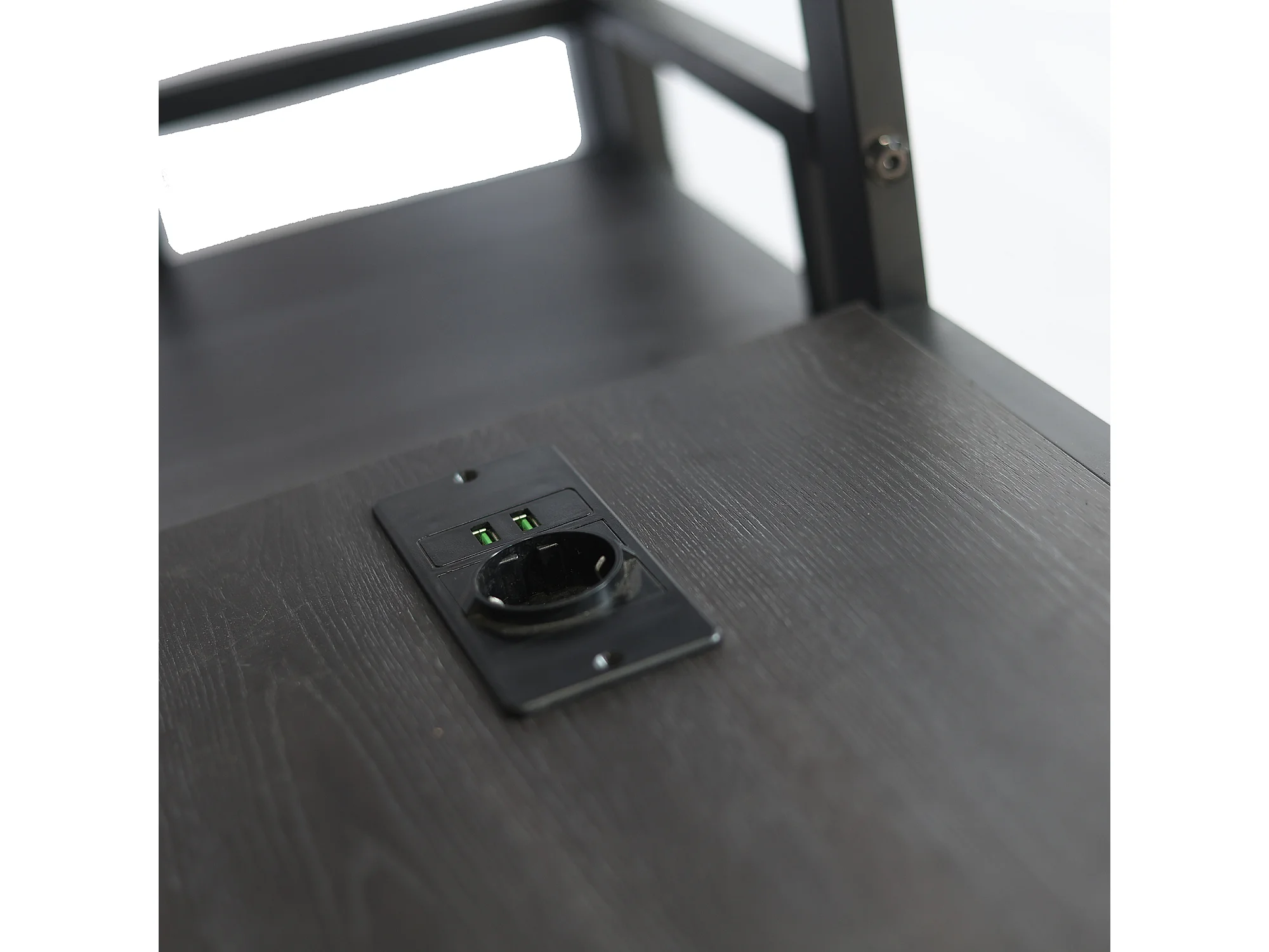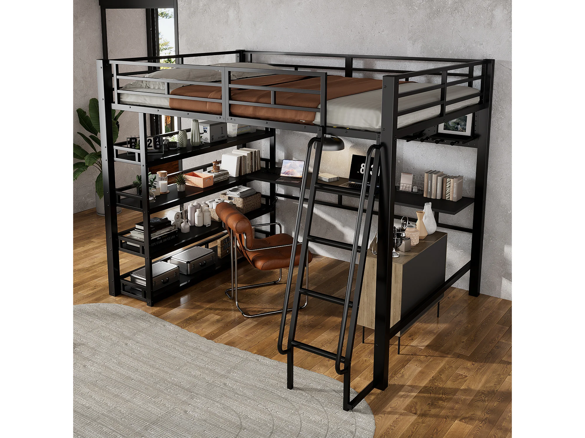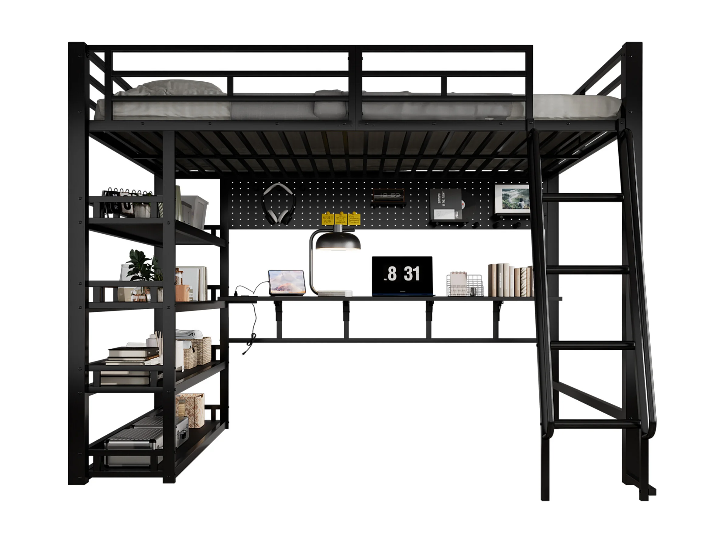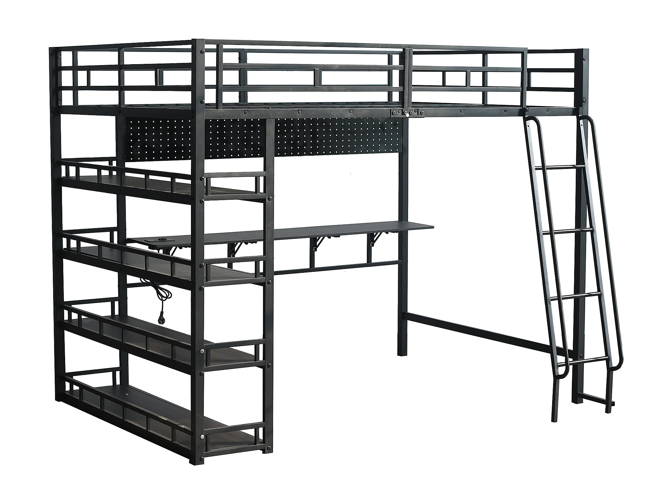 Lit mezzanine 140x200 cm - avec bureau et étagère de rangement - avec port de charge - avec échelle - Métal + panneaux de particules - Noir