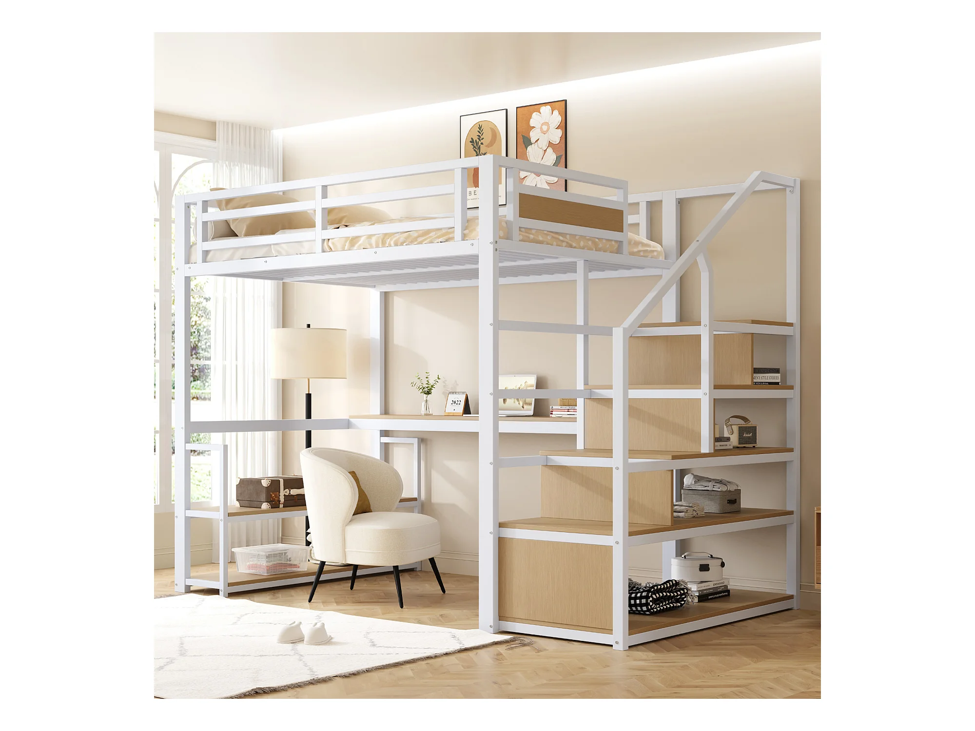 Lit Mezzanine 140x200 cm, avec échelle de sécurité, rangement intégré, table et étagères, cadre en métal, blanc (255x145x175 cm)