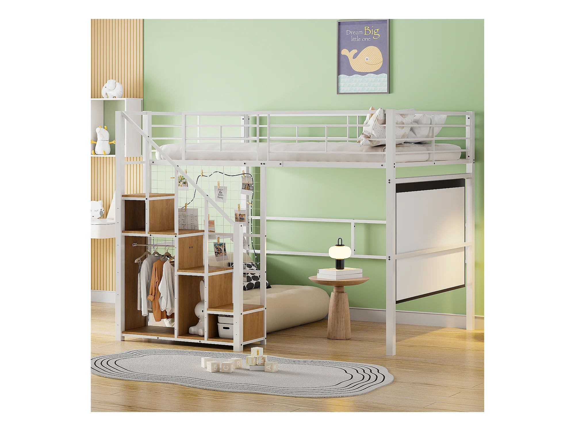 Lit mezzanine 140x200 avec échelle de sécurité, structure en métal, bureau et armoire intégrés, blanc (245x145x180 cm)