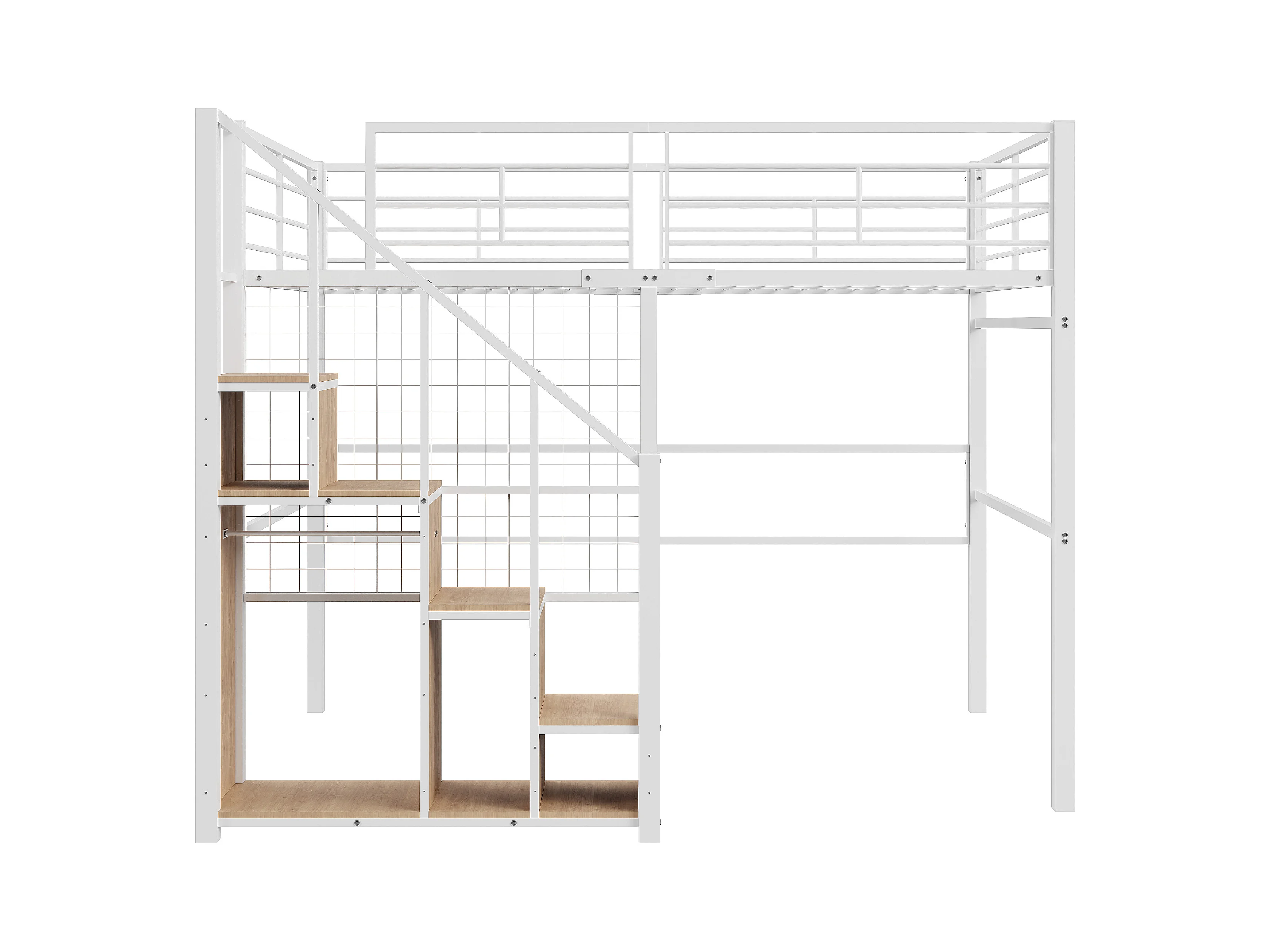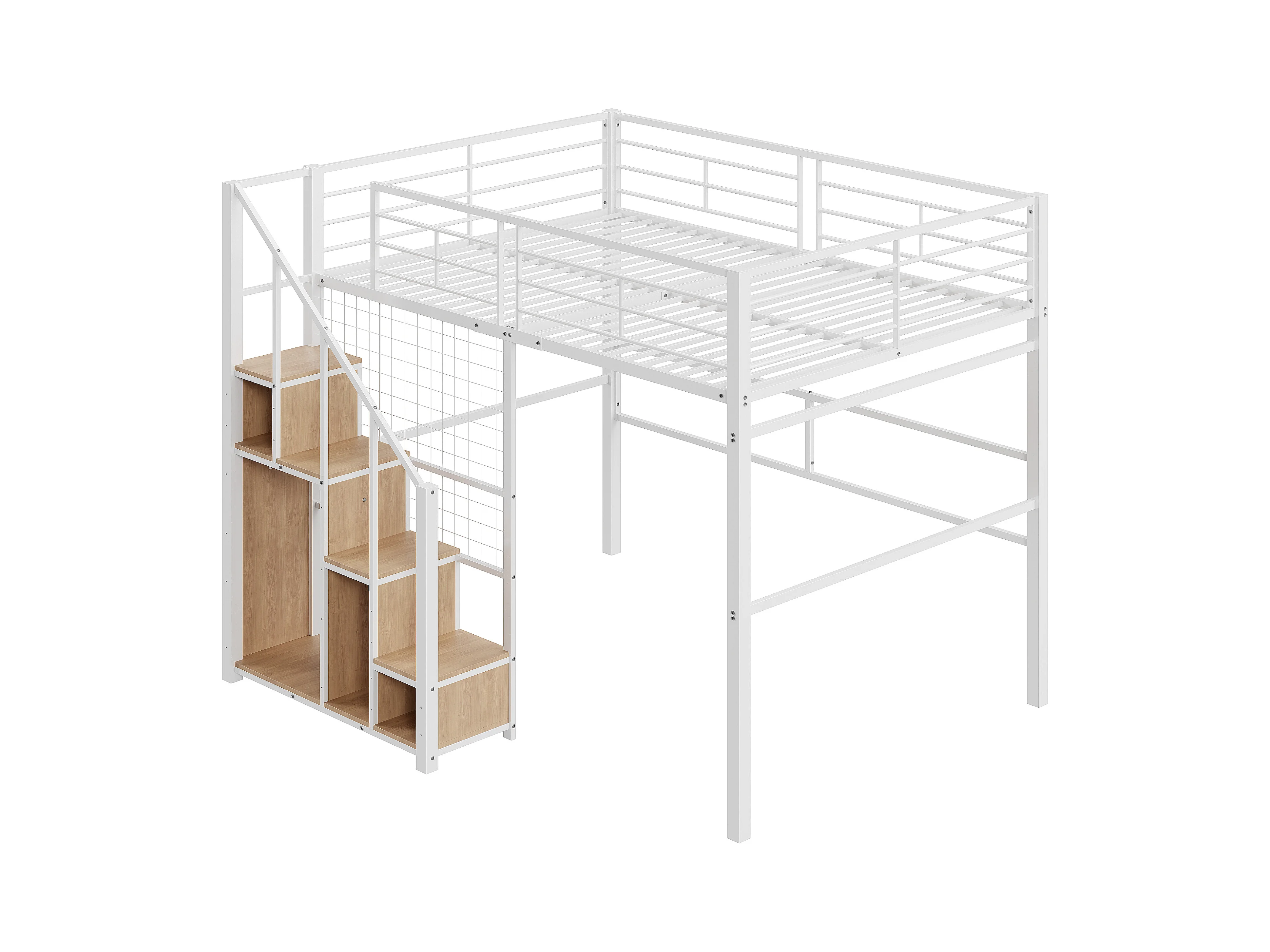 Lit mezzanine 140x200 cm avec échelle sécurisée et rangements, cadre métallique, lit pour enfant et adolescent, blanc (210x188x170 cm)