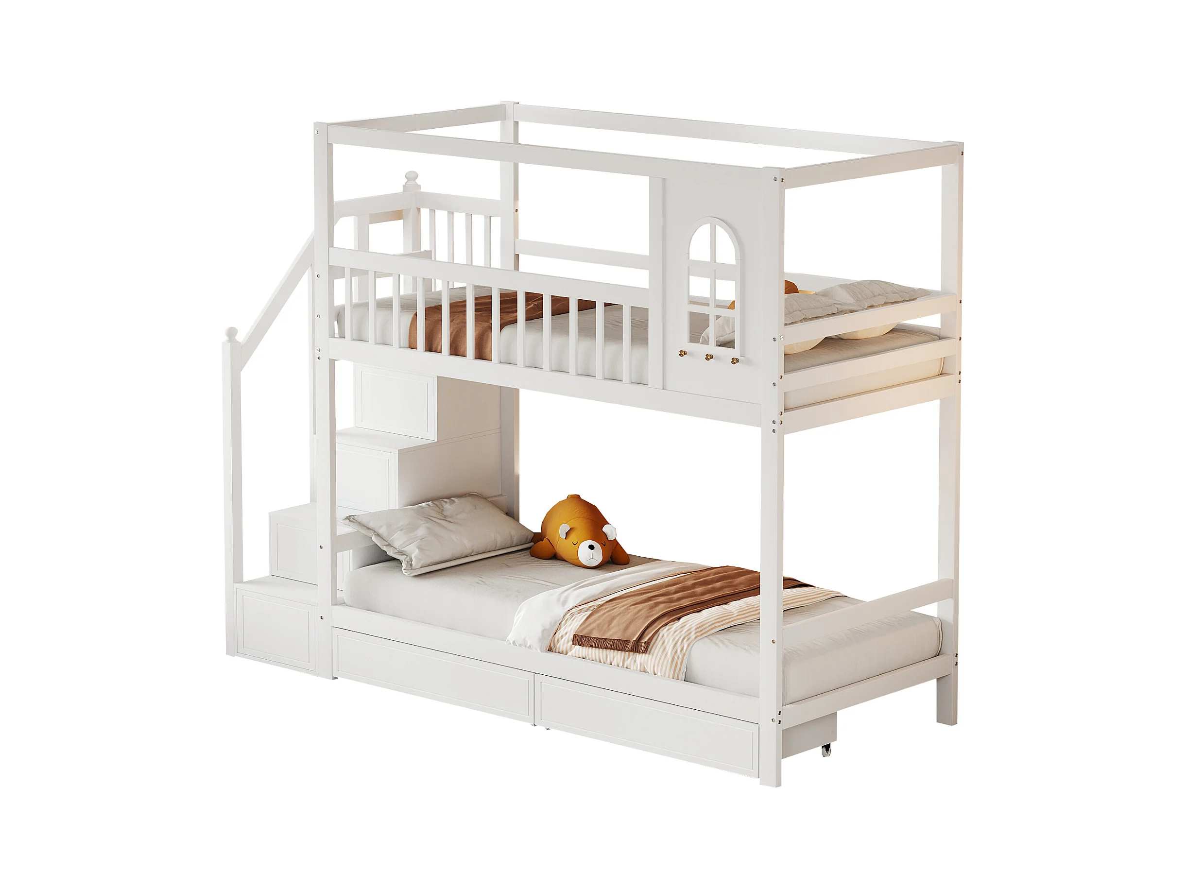 Lit mezzanine enfant - 140 x 200 cm - avec 4 tiroirs + escalier de rangement - bois - blanc
