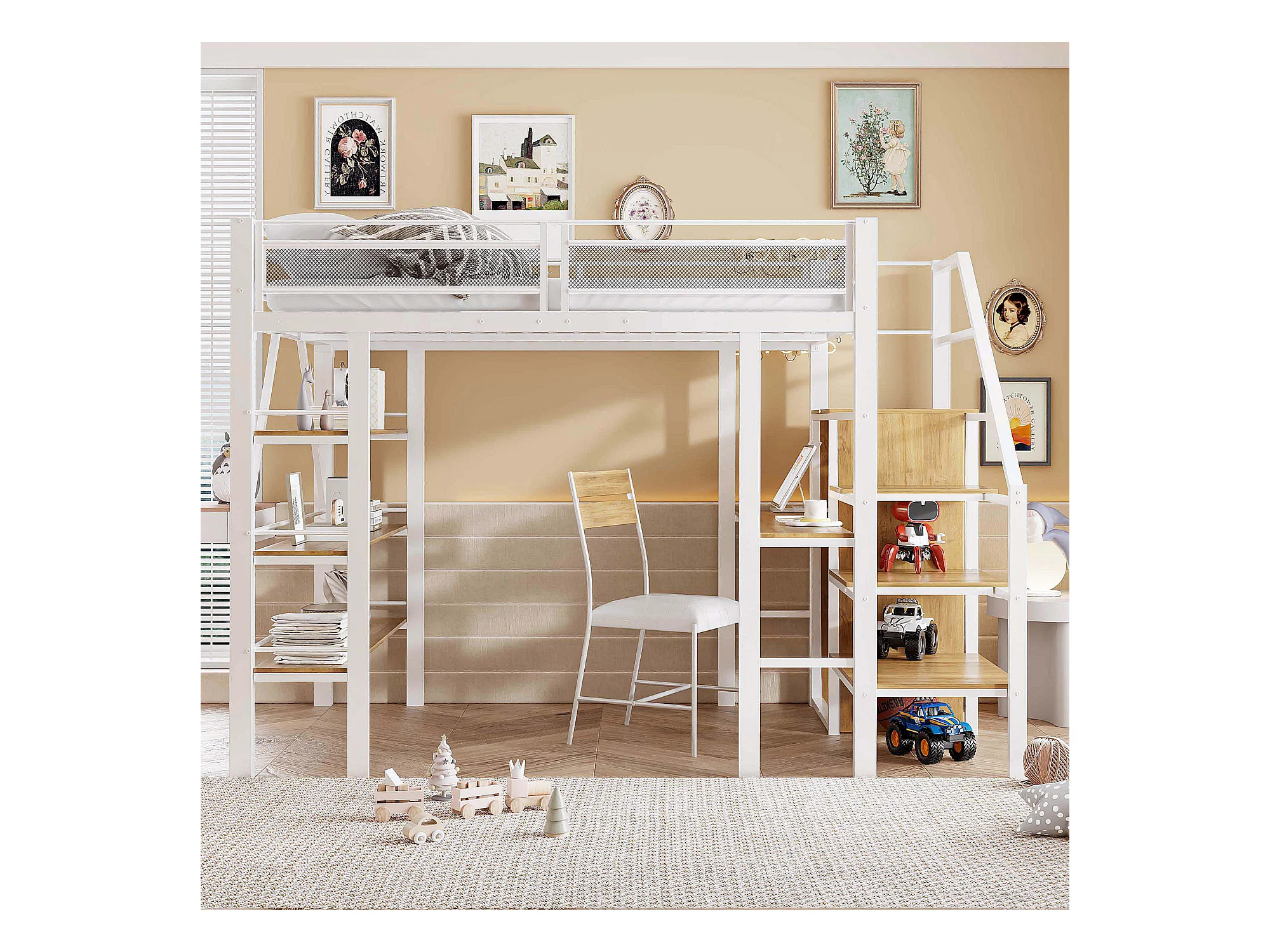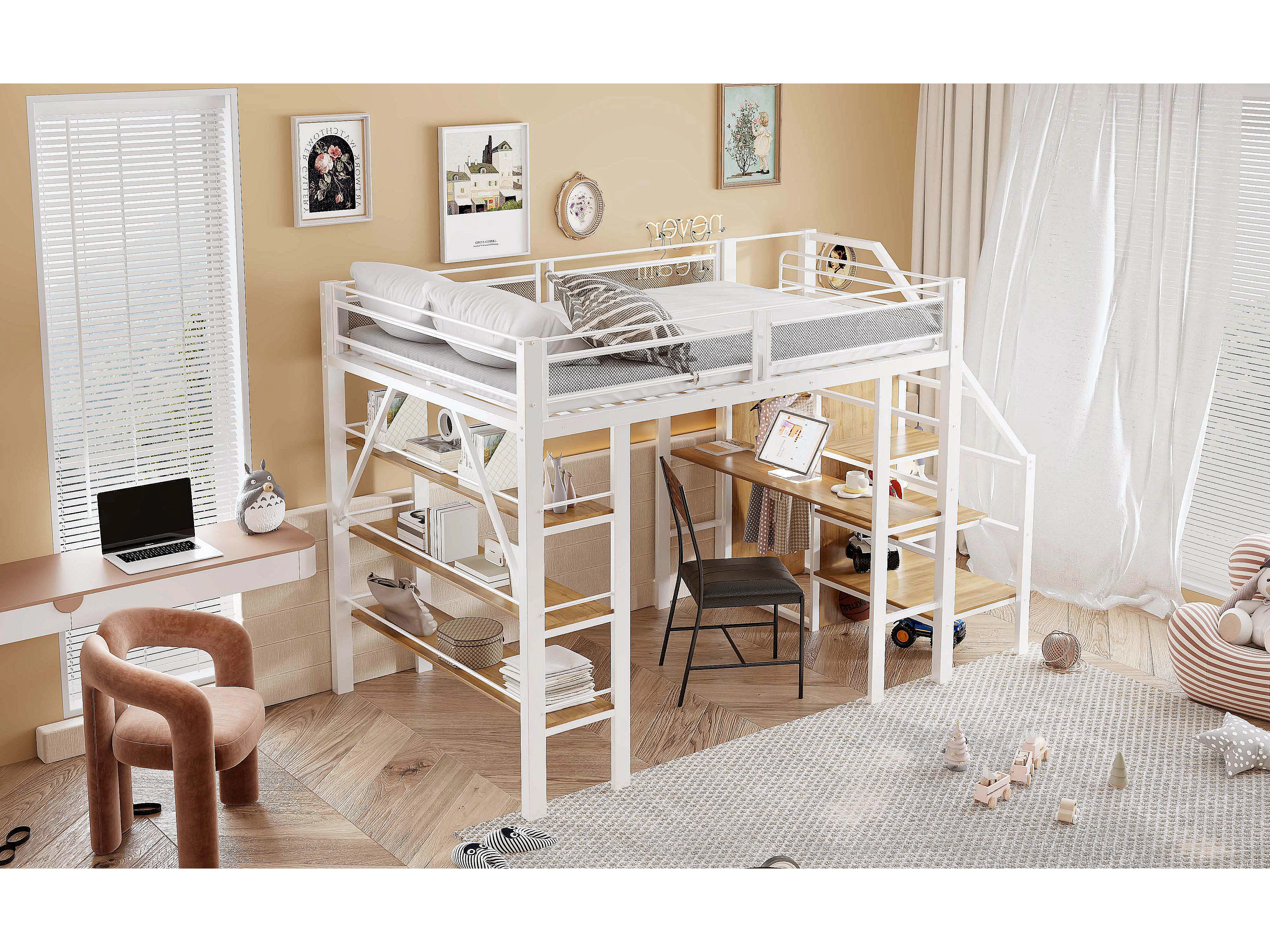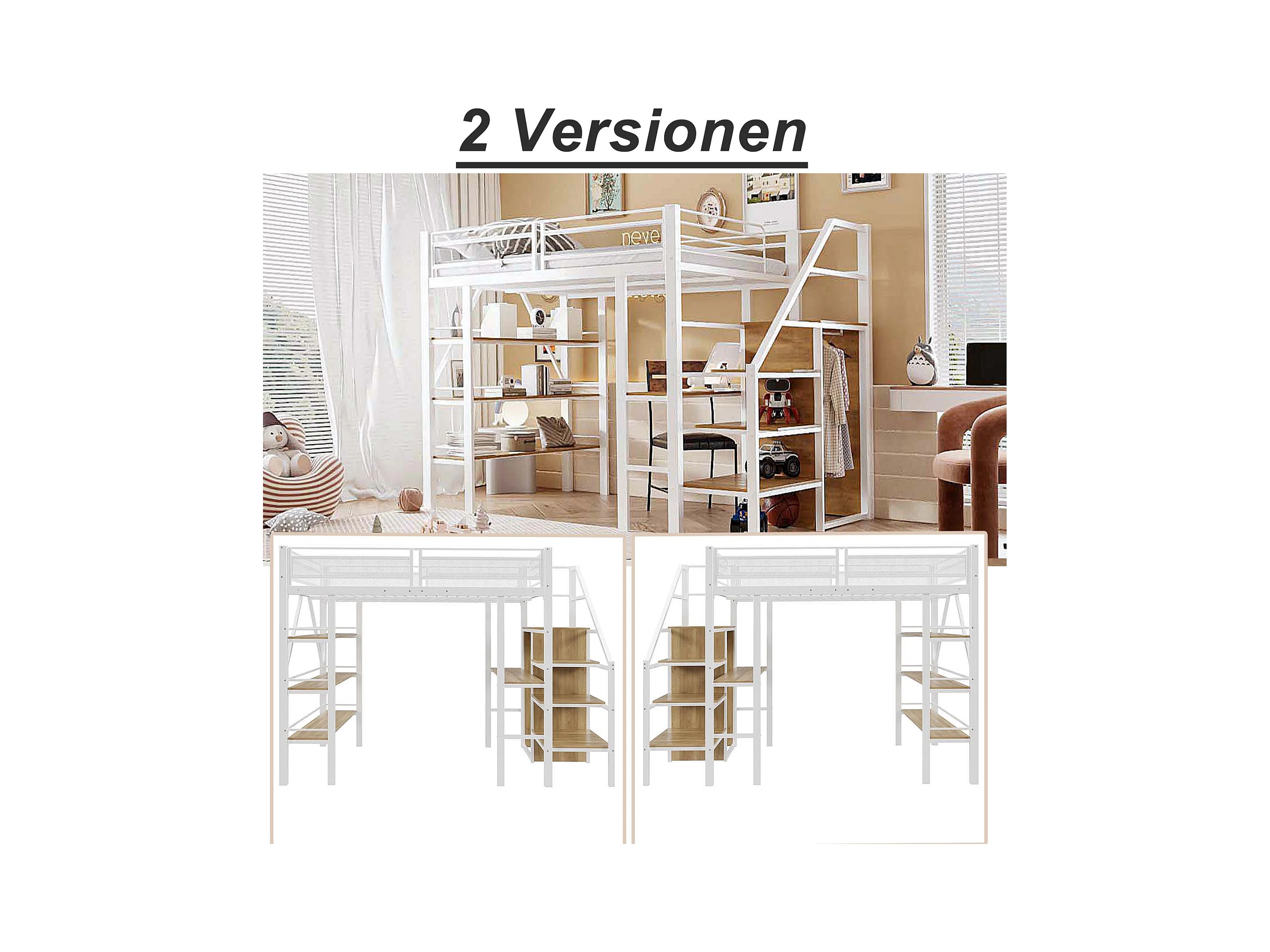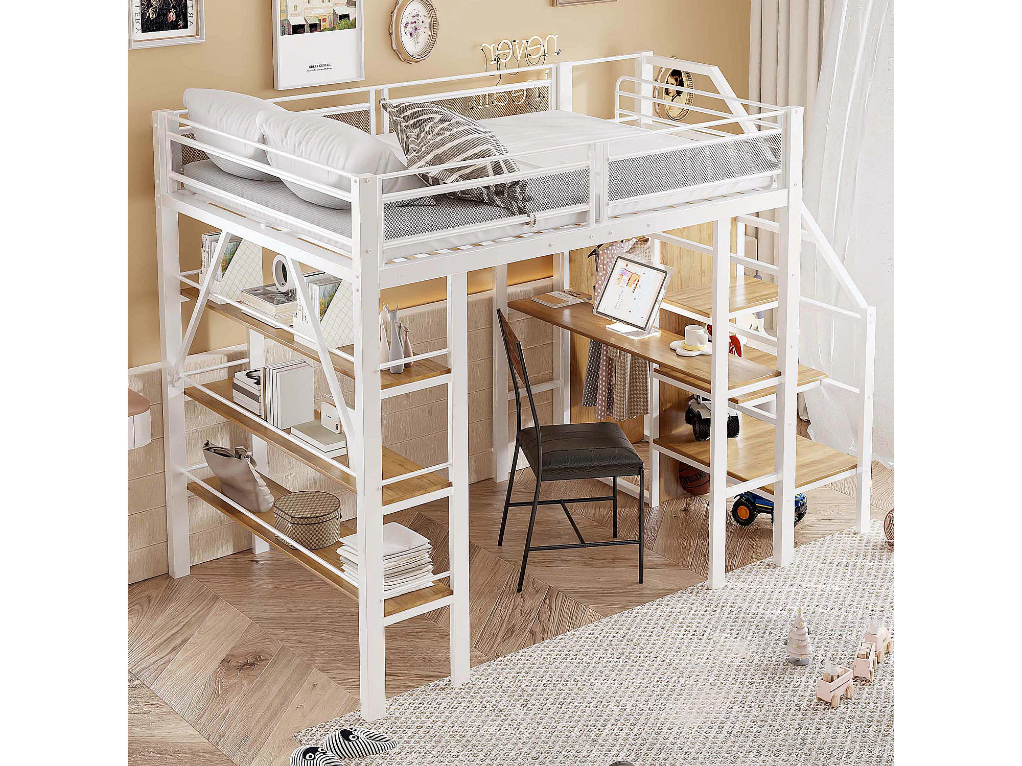 Lit mezzanine 140x200 cm, étagère à 3 niveaux, bureau, armoire, échelle sécurisée, rangement, métal, blanc (252x147.5x178.5 cm)