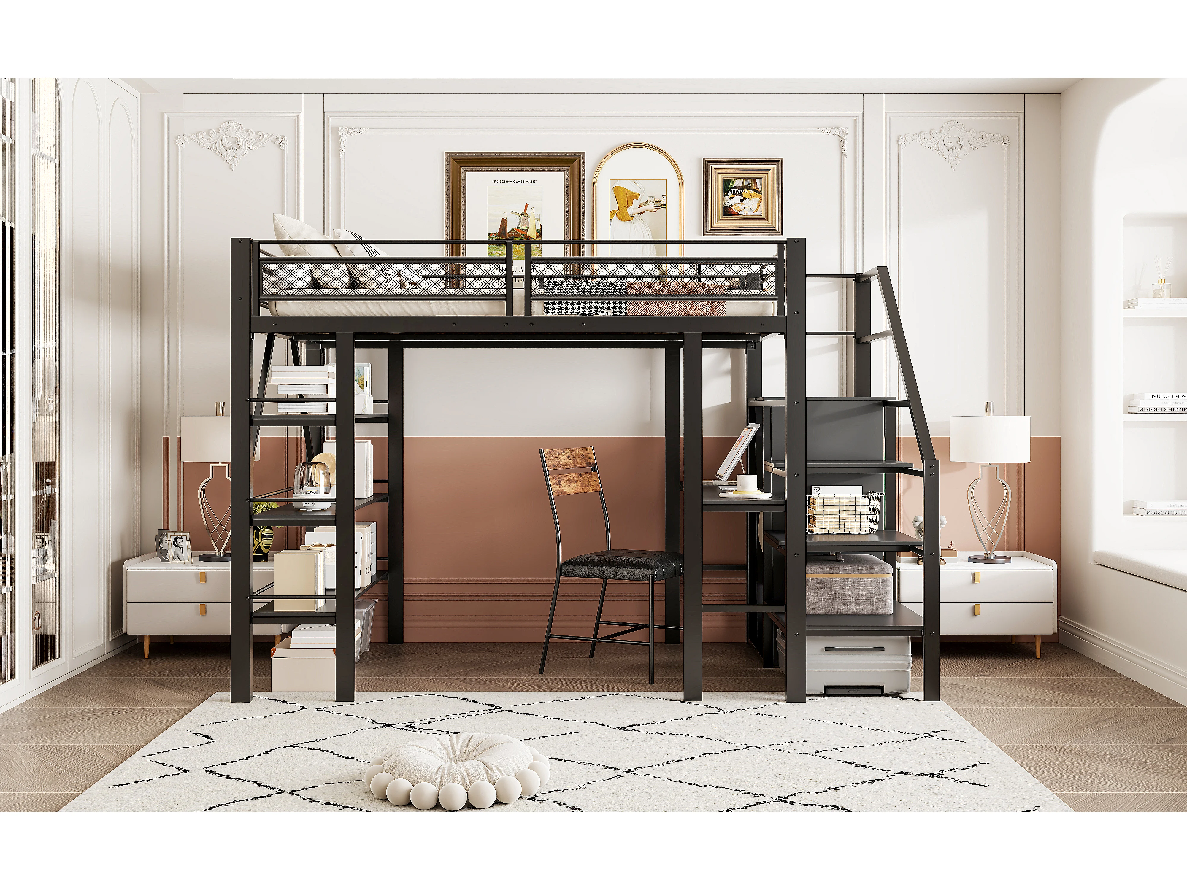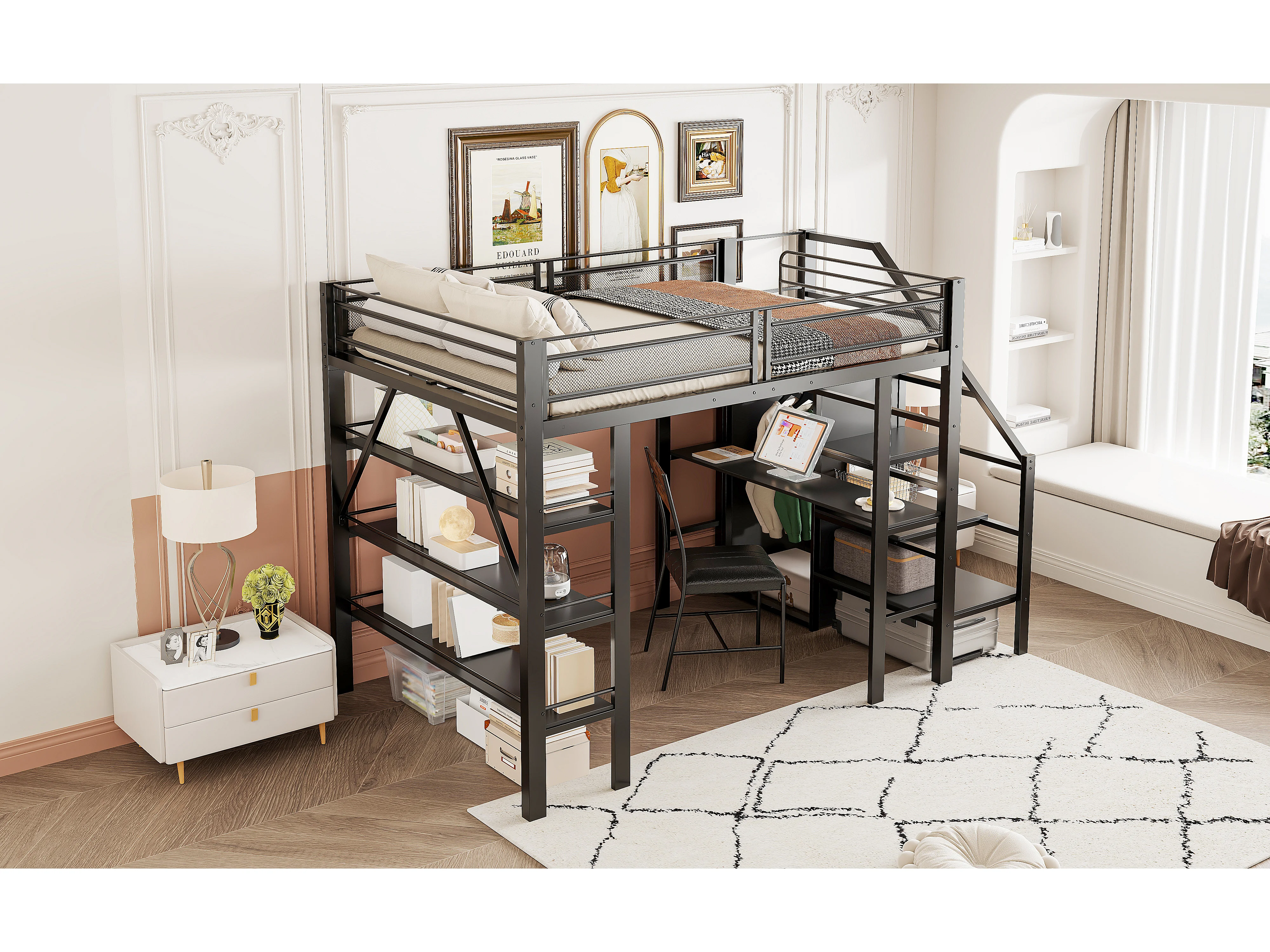Lit mezzanine 140x200 cm, étagère à 3 niveaux, bureau, armoire, échelle sécurisée, rangement, métal, noir (252x147.5x178.5 cm)