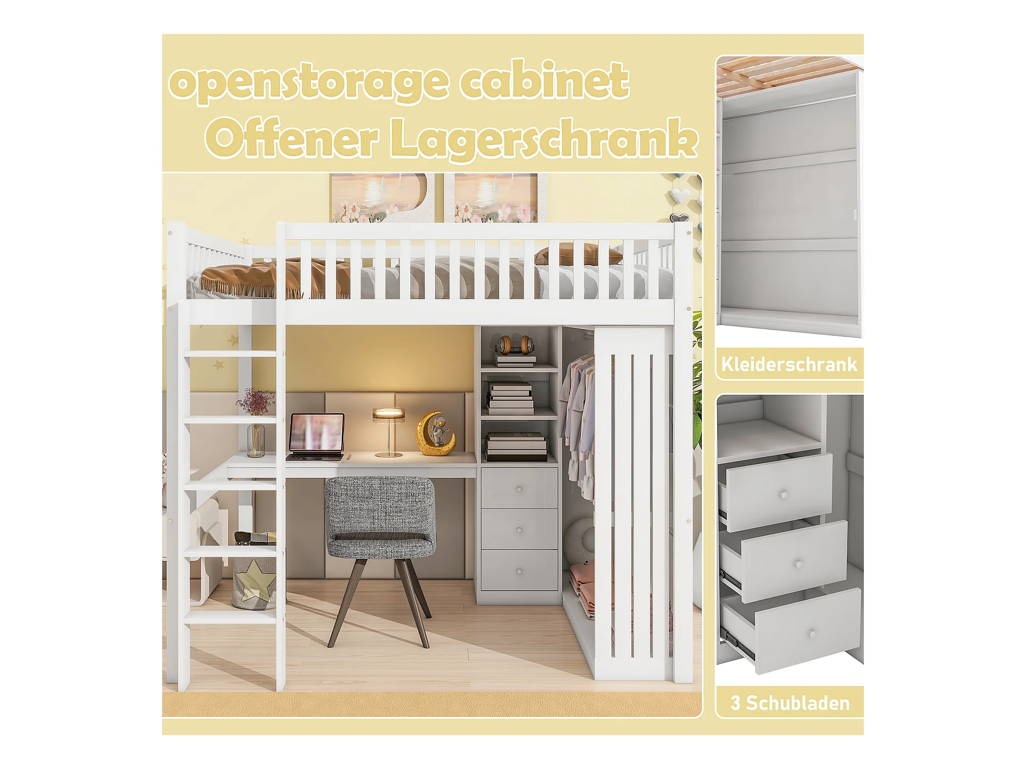Lit mezzanine, 140x200cm, bureau, armoire, 3 tiroirs, rangement ouvert, garde-corps, échelle, sans matelas, Blanc (205x145x180 cm)