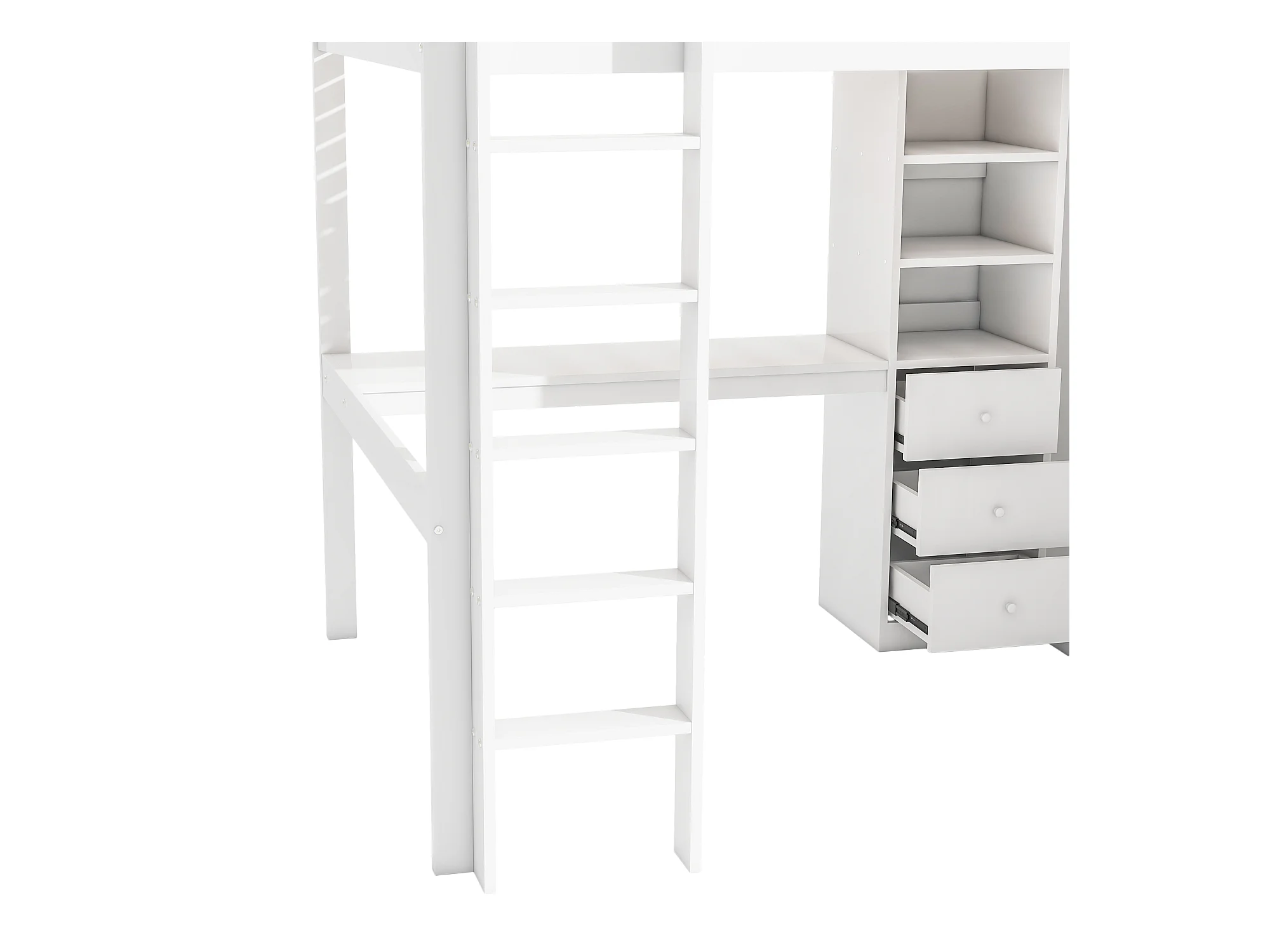 Lit en mezzanine, 140*200 cm, bureau, armoire, 3 tiroirs, rangement ouvert, balustrade, escalier, sans matelas, blanc