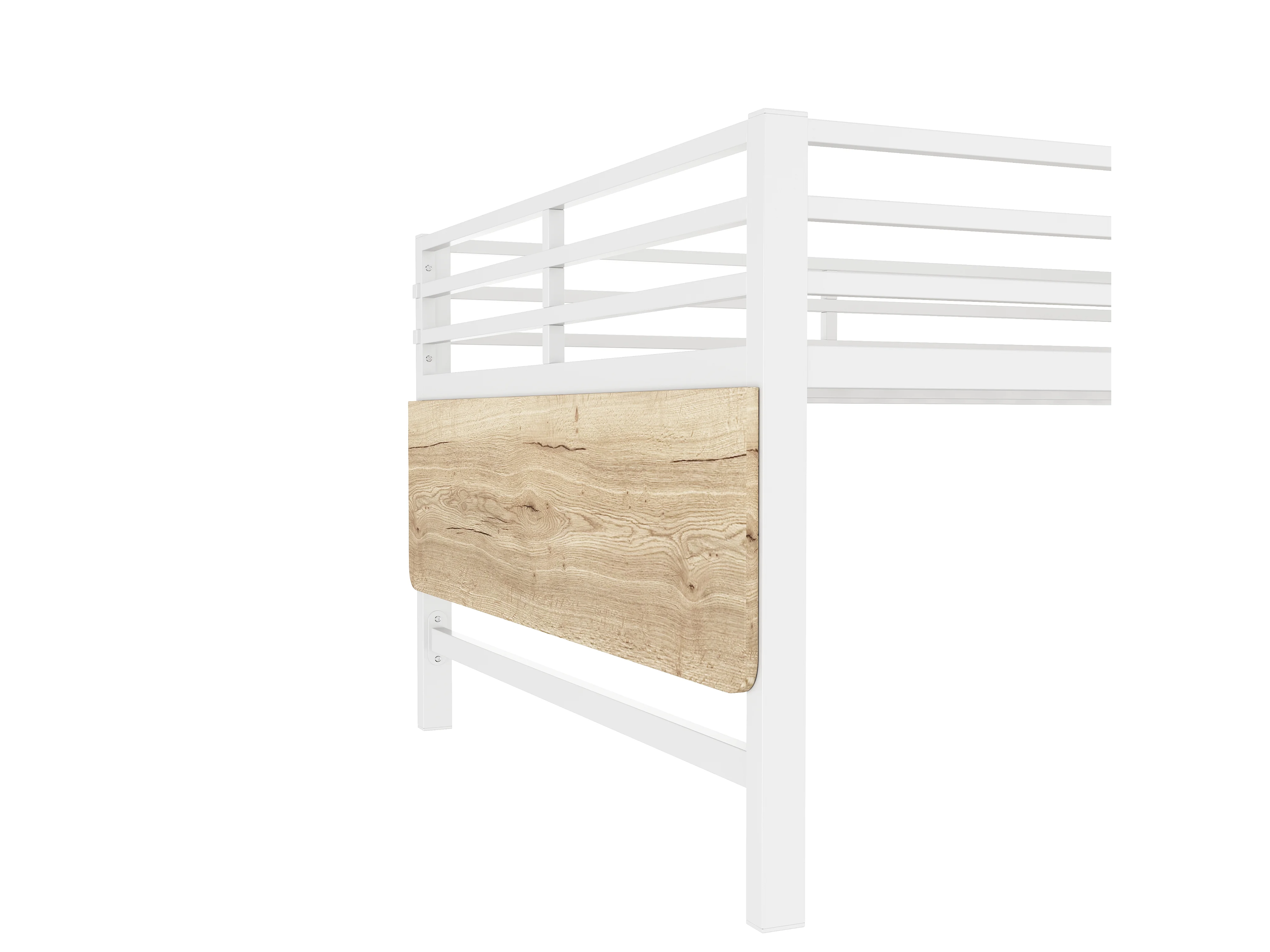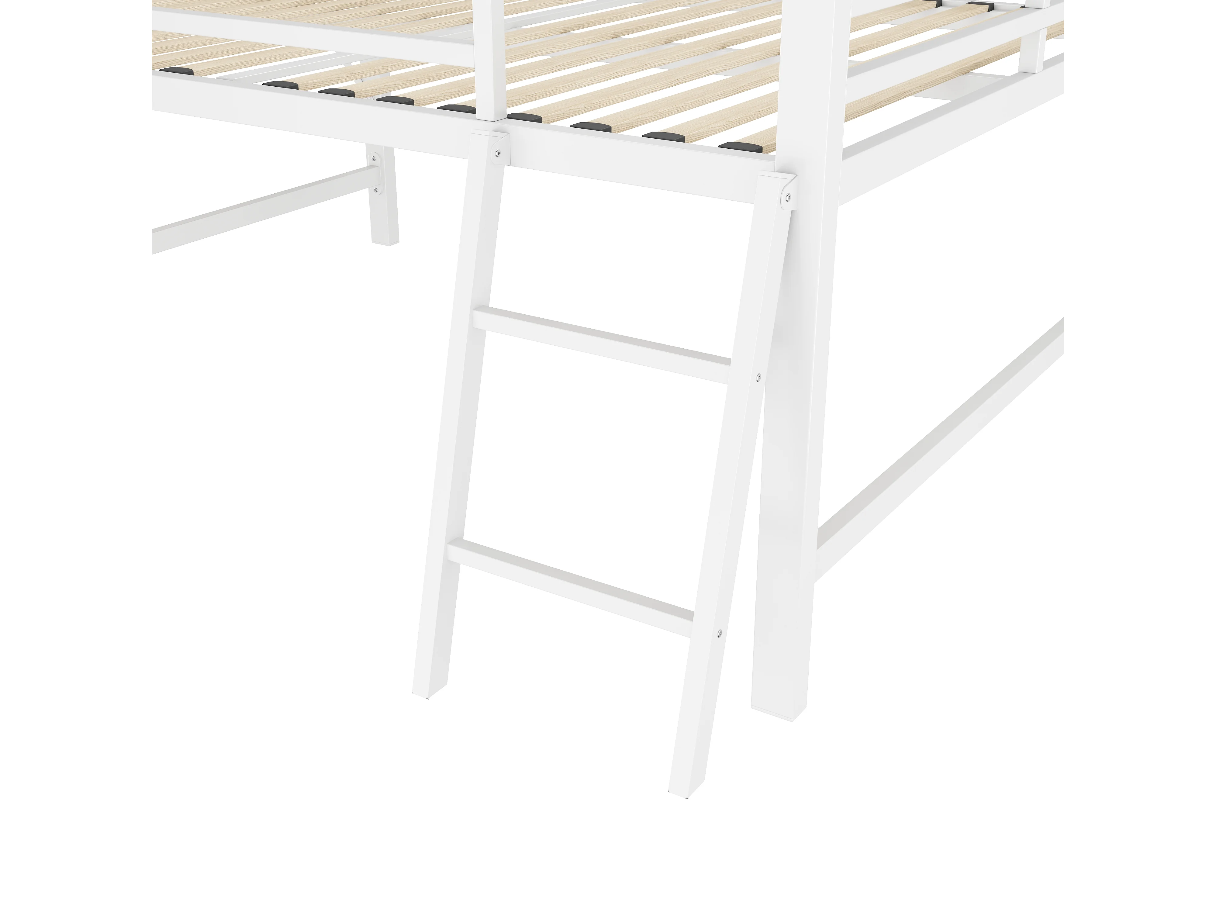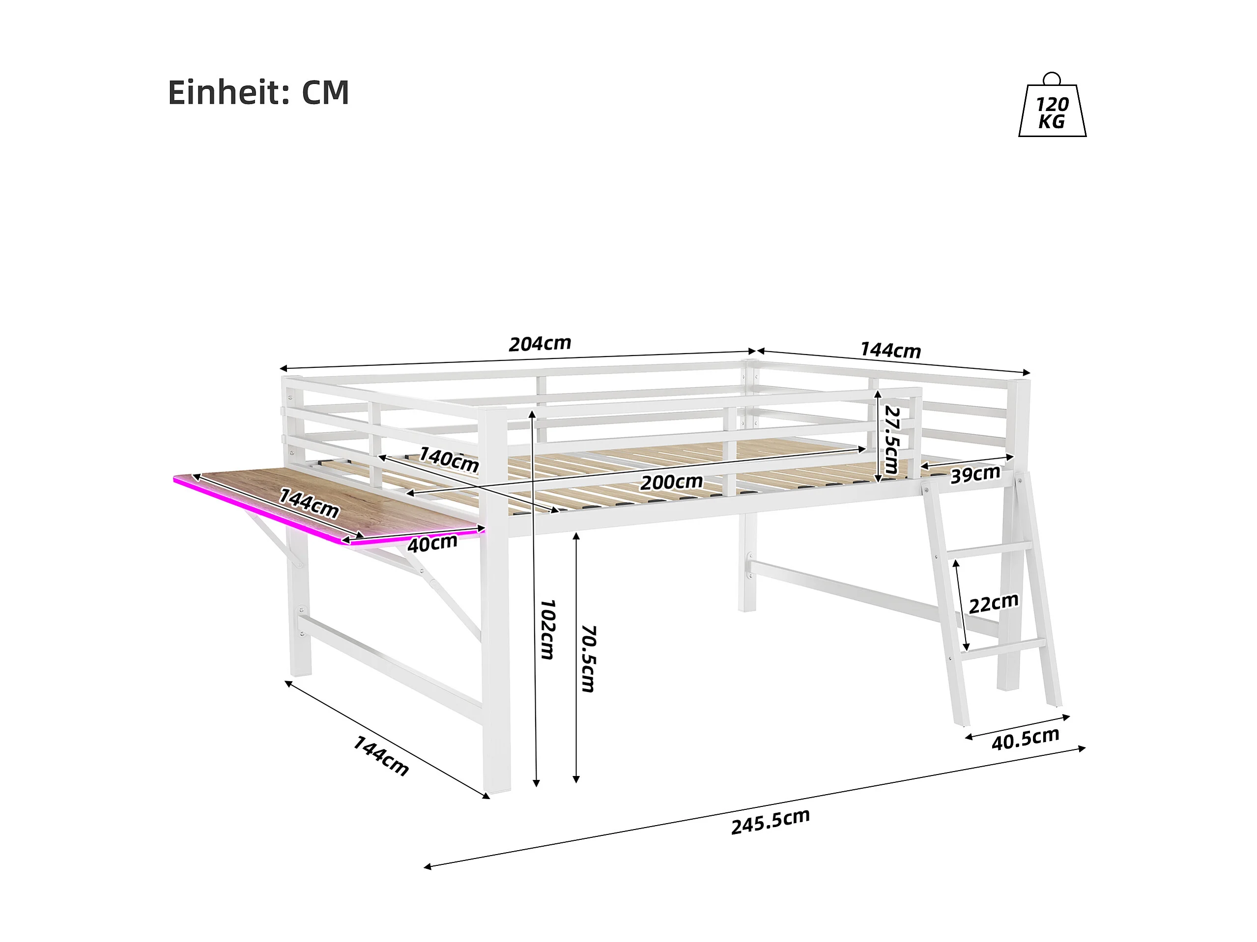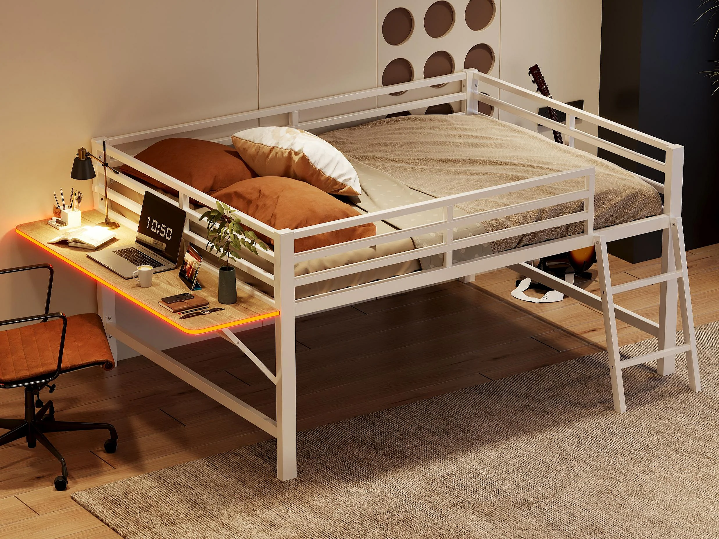 Lit mezzanine 140x200cm en métal avec LED - avec bureau abattant et sommier à lattes - Blanc